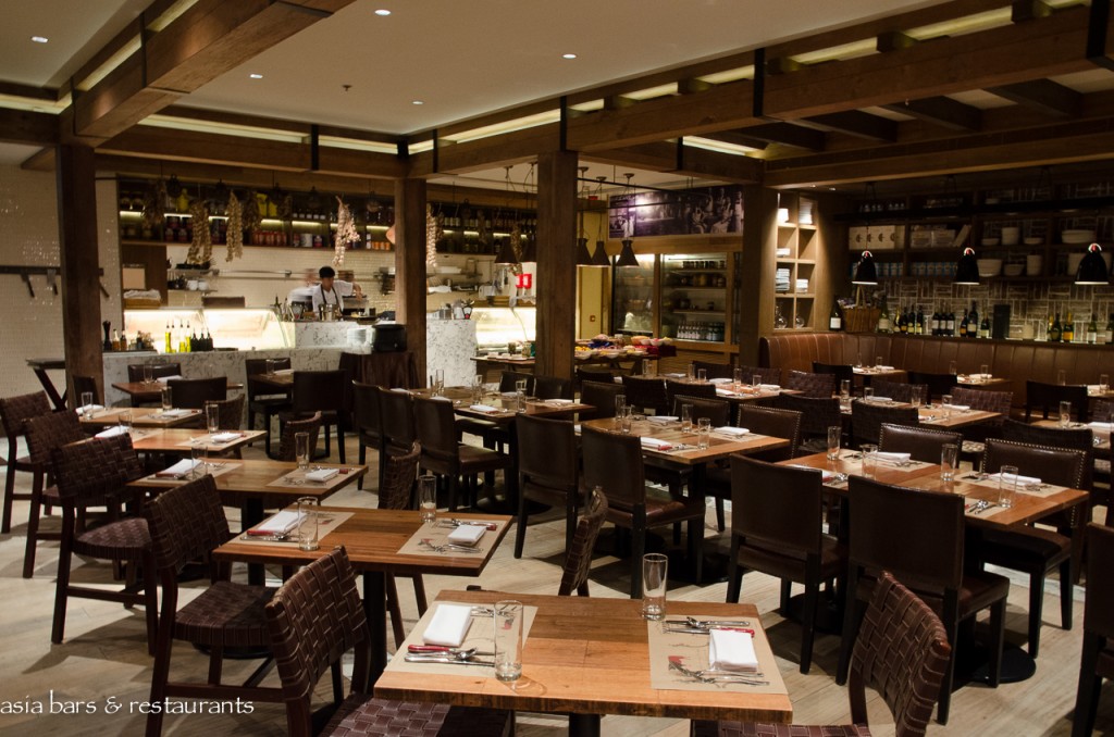 Located within the cluster of fine dining restaurants at Times Square, Manzo offers a variety of table options within its open layout. The classic, yet contemporary steak house decor features “aged” brown brick walls, unpolished timber floors, and solid wood tables with leather upholstered chairs. A series of booth settings extend across one side of the main dining space, with elegant leather banquette settings on the opposite side of the room. At the rear of the room, an open kitchen overlooks the “farm table” antipasto buffet, with glass fronted meat aging cabinets showcasing the premium cuts of beef.