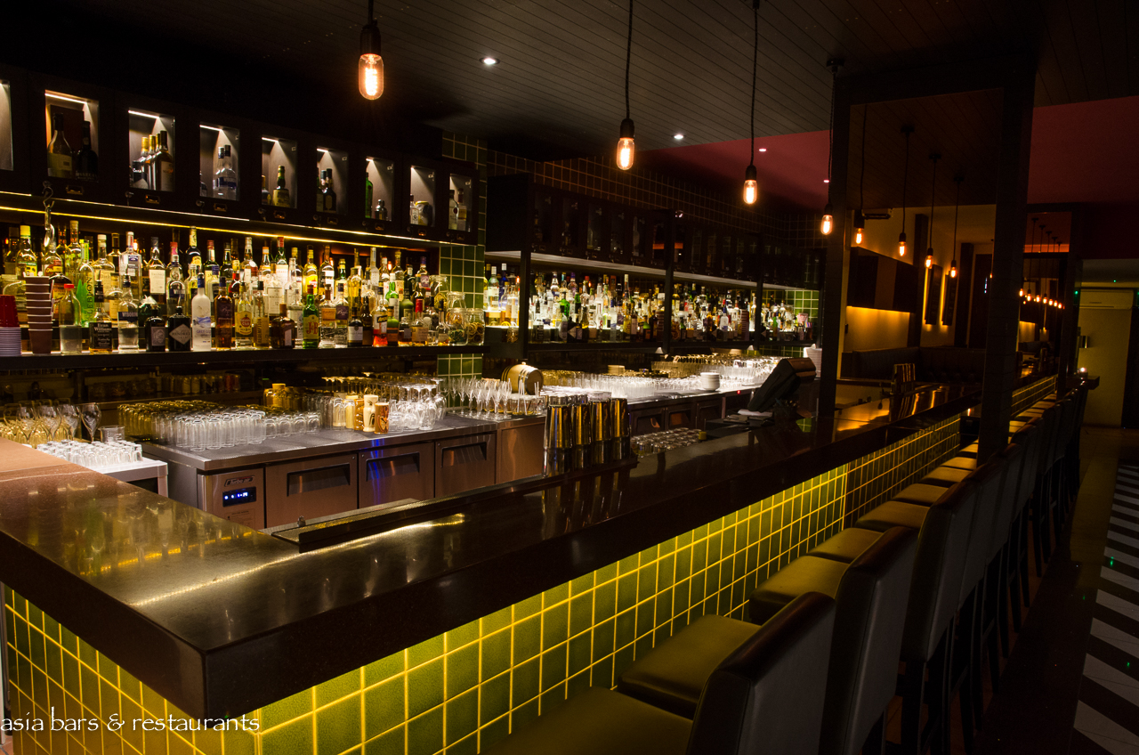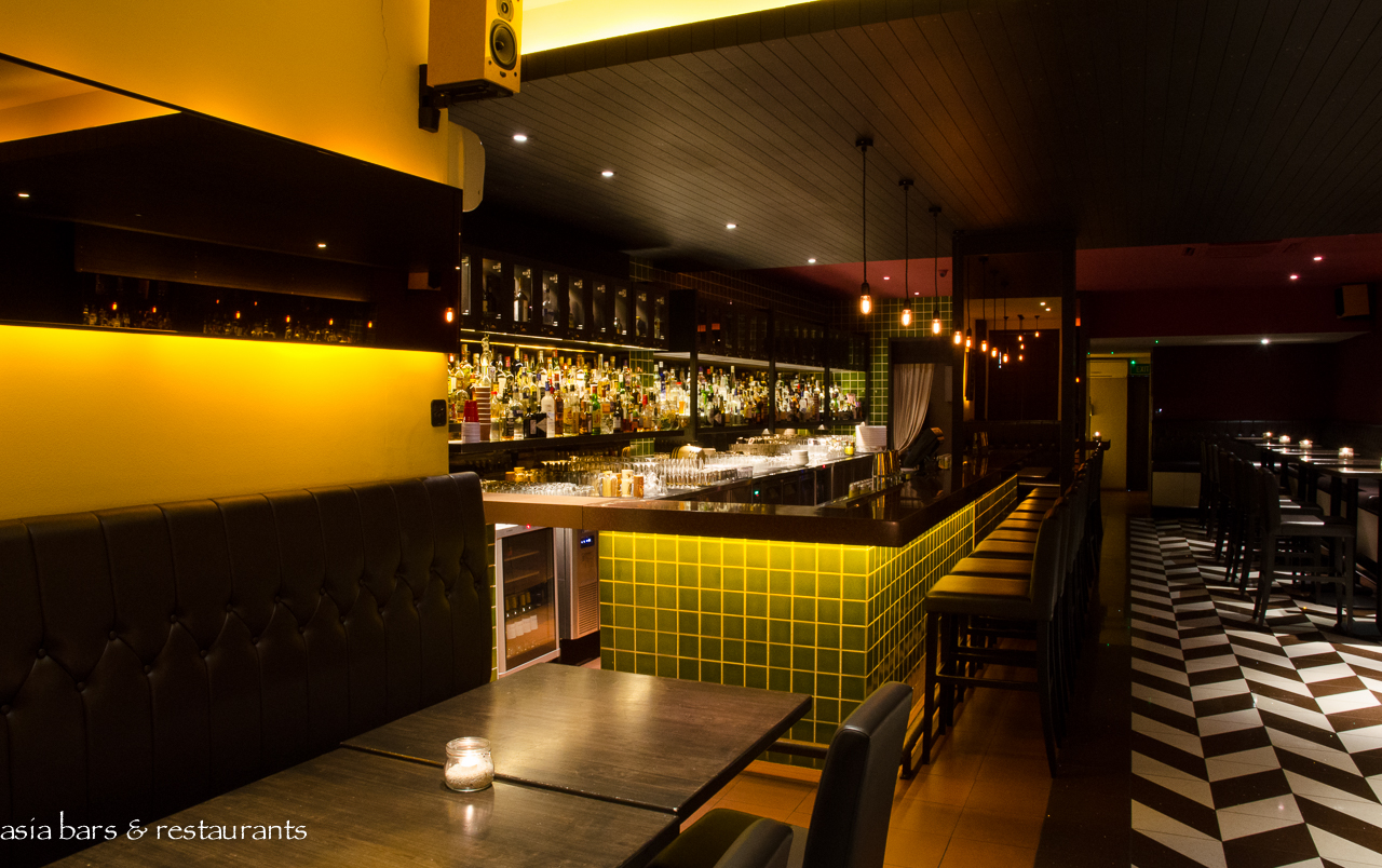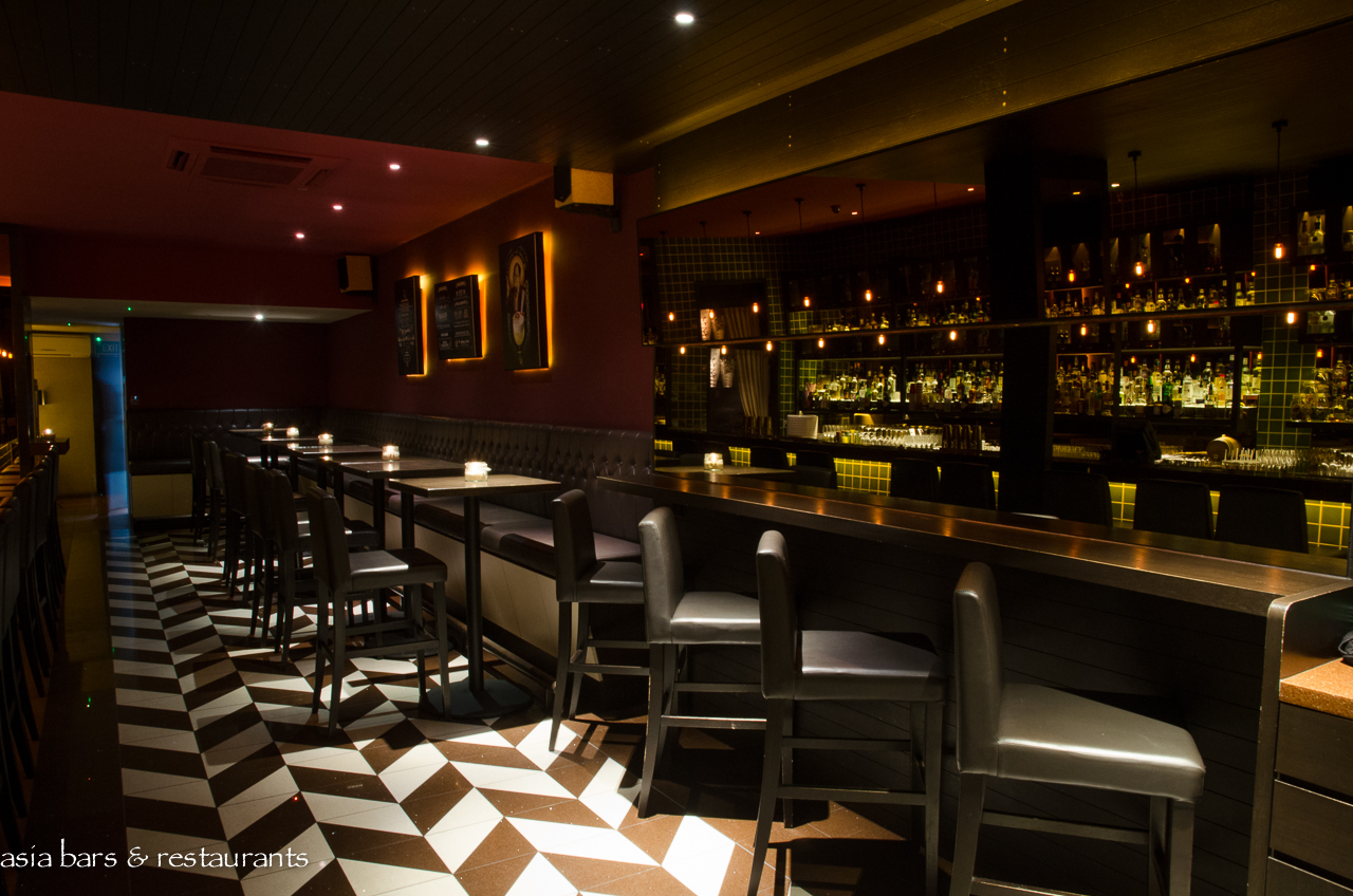 Behind its colorful facade of vintage Peranakan style tiles, the interior reveals a handsome bar space of understated sophistication, with decor of dark timbers, black leather banquettes and bar stools. An impressive long bar counter, attractively faced with green tiles, spans one side of the elongated room, showcasing the outstanding collection of premium spirits arrayed along the back bar. Several high tables out front cater to smokers and street-life watchers, with total seating at indoor and outdoor tables, plus the bar, for around 85 guests. On weekend nights the typically vibrant crowd spills out onto the street and can number up to 150.