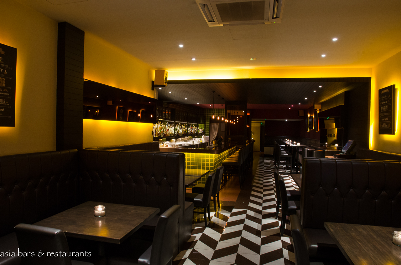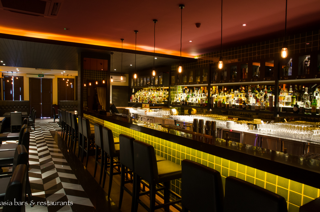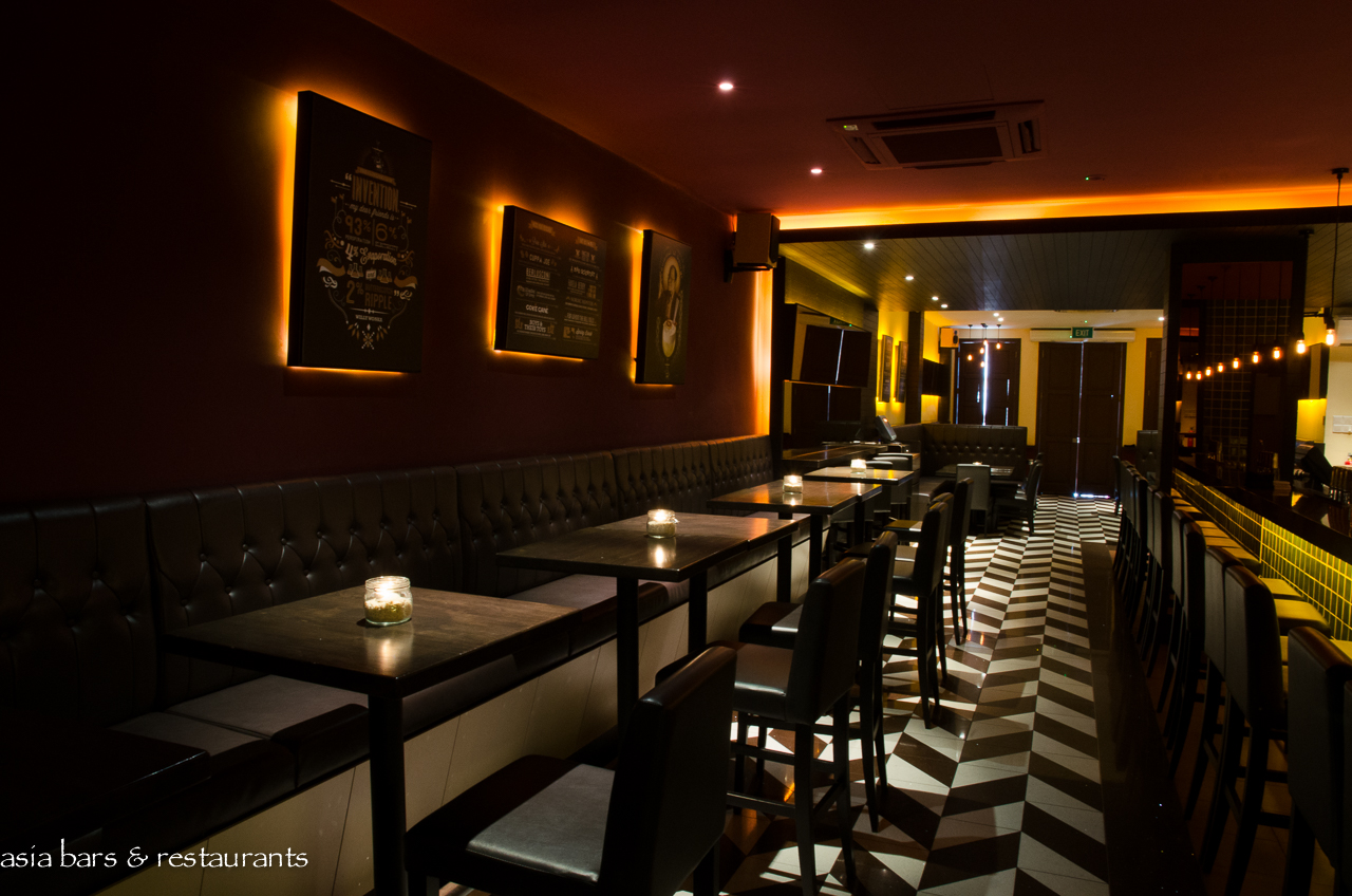 Behind its colorful facade of vintage Peranakan style tiles, the interior reveals a handsome bar space of understated sophistication, with decor of dark timbers, black leather banquettes and bar stools. An impressive long bar counter, attractively faced with green tiles, spans one side of the elongated room, showcasing the outstanding collection of premium spirits arrayed along the back bar. Several high tables out front cater to smokers and street-life watchers, with total seating at indoor and outdoor tables, plus the bar, for around 85 guests. On weekend nights the typically vibrant crowd spills out onto the street and can number up to 150.