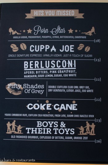 Drinks from the concise cocktail menu are superbly well-made by the talented international team behind the bar. Working on the admirable principle that drinks with friends should be fun, the original cocktail creations of the mixologists frequently take on whimsical names and playful presentation, notwithstanding the sound technique and well-balanced construction of the libations. New cocktails are constantly being developed and the menu is regularly updated. Exemplifying the formidable talents of the bar team are drinks such as 50 Shades of Grey – Double Cufflink Club Earl Grey Gin, dry vermouth, lemon juice, egg white; The Walking Dead– a secret blend of 13 different types of rum, passion fruit, pineapple, sugar, spices; and the Berlusconi – Aperol bitters, pink grapefruit, mandarin, lemon and sugar.