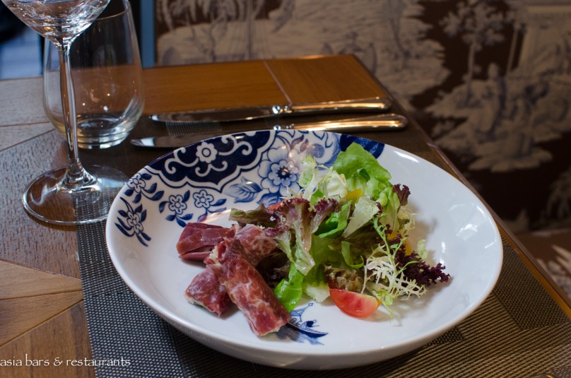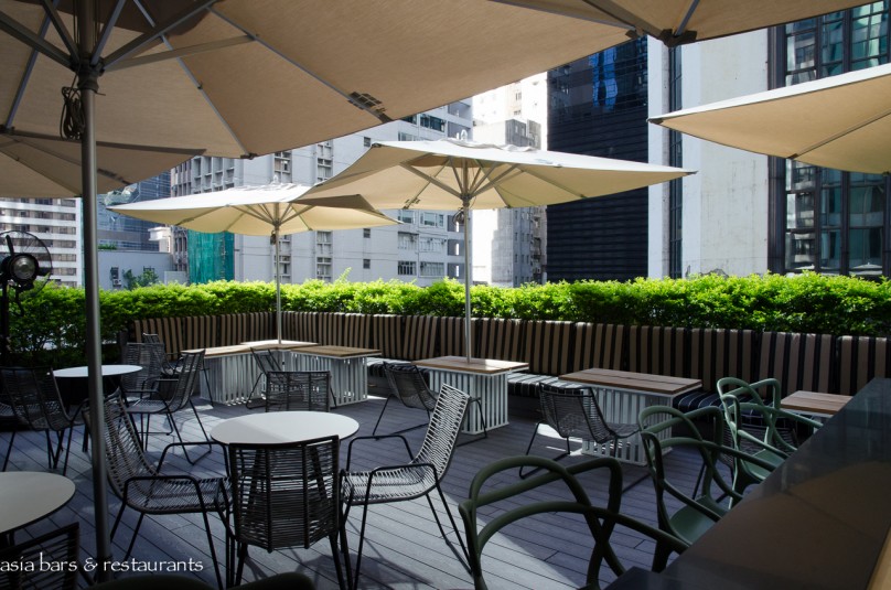 Accessed via the hotel lobby, The Envoy occupies the entire third floor with an “L” shaped space comprising the main bar section at the entrance – the long dark timber bar extends the entire breadth of the room, furnished with traditional dark timber paneling, unpolished timber flooring, muted neutral tones and comfortable leather bar stools. Beyond the bar space, facing out over Pottinger Street, the compact dining room has a more contemporary, refined elegance, distinguished by its bespoke wallpaper that recreates classic Chinese landscape artwork, and crystal chandelier. And opening out beyond the dining room, a spacious outdoor terrace deck overlooking the busy neighbourhood offers a more casual, laid-back setting for evening drinks and socialising.