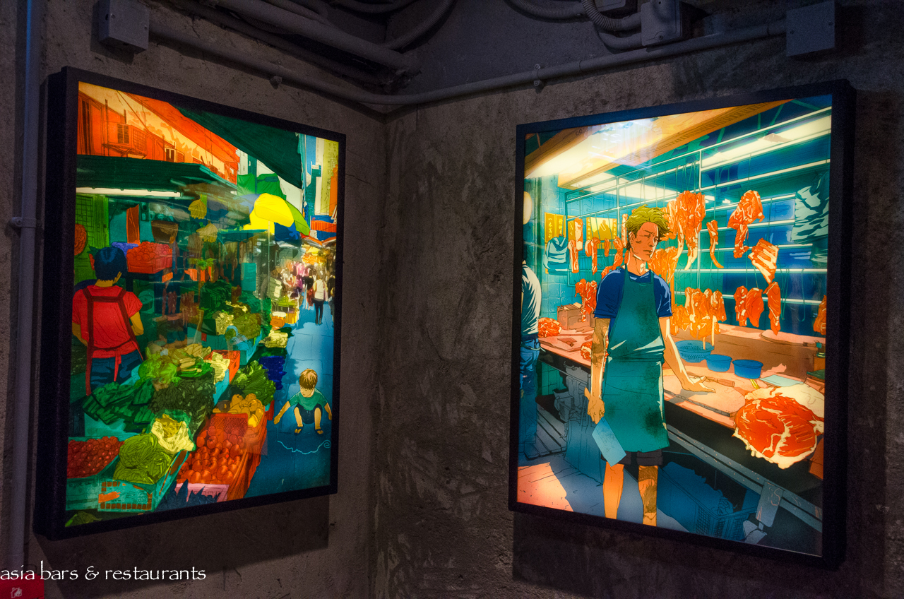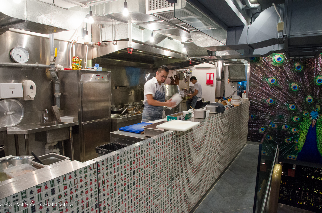 Conveniently located at the corner of Hollywood Road and Elgin Street, Ho Lee Fook showcases its dynamic kitchen behind the glass fronted street level facade, with a concrete staircase leading down to the basement dining space. Taking design cues from traditional Hong Kong culture – juxtaposed with a contemporary street art aesthetic – the restaurant interior includes elements such as a mah-jong tiled kitchen, and the raw concrete walled, minimalist dining room replete with colourful back-lit streetscape artworks, black timber lattice screens of carved out calligraphy inspired by the works of renowned street artist the King of Kowloon. A rock n’ roll sound track suffuses the space with an energetic vibe to complete the offbeat, relaxed dining experience.