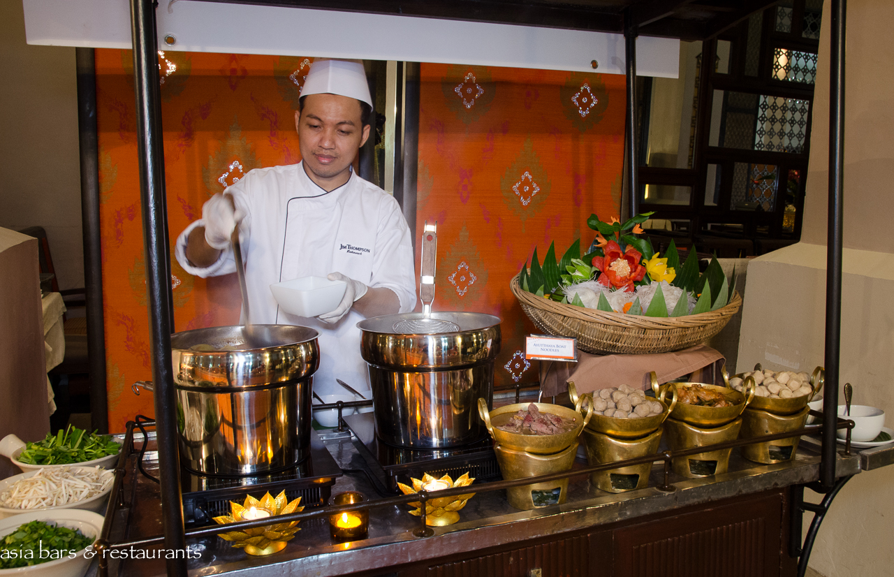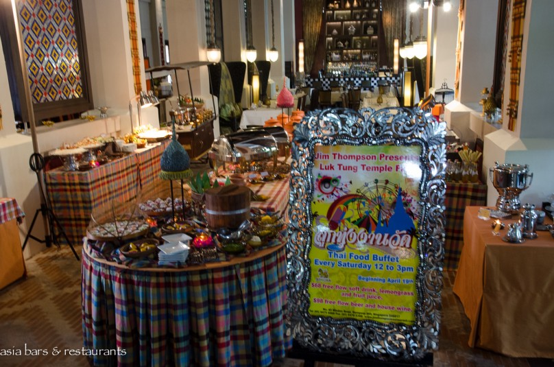 Recently Jim Thompson have introduced special weekend buffet lunch promotions – with their “Luk Tung Temple Fair” themed, country style Thai Food Buffet on Saturdays; and a traditional Thai cuisine Buffet on Sundays. In addition to the impressive array of buffet dishes, diners also have the option of ordering from a supplementary a la carte buffet menu on both days. Buffet dishes encompass many popular Thai dishes including freshly prepared Som Tdam green papaya salad; cooked to order Ayutthaya Boat Noodles and Khao Soi Gai Northern Thai curry noodle with chicken; Tom Yam Goong hot and sour prawns soup; and Phad Cha Talay stir-fried seafood with ginger, peppercorn and chilies. Buffet selections also include a broad variety of appetisers, spicy Thai salads, curries, stir-fried dishes, and desserts.
