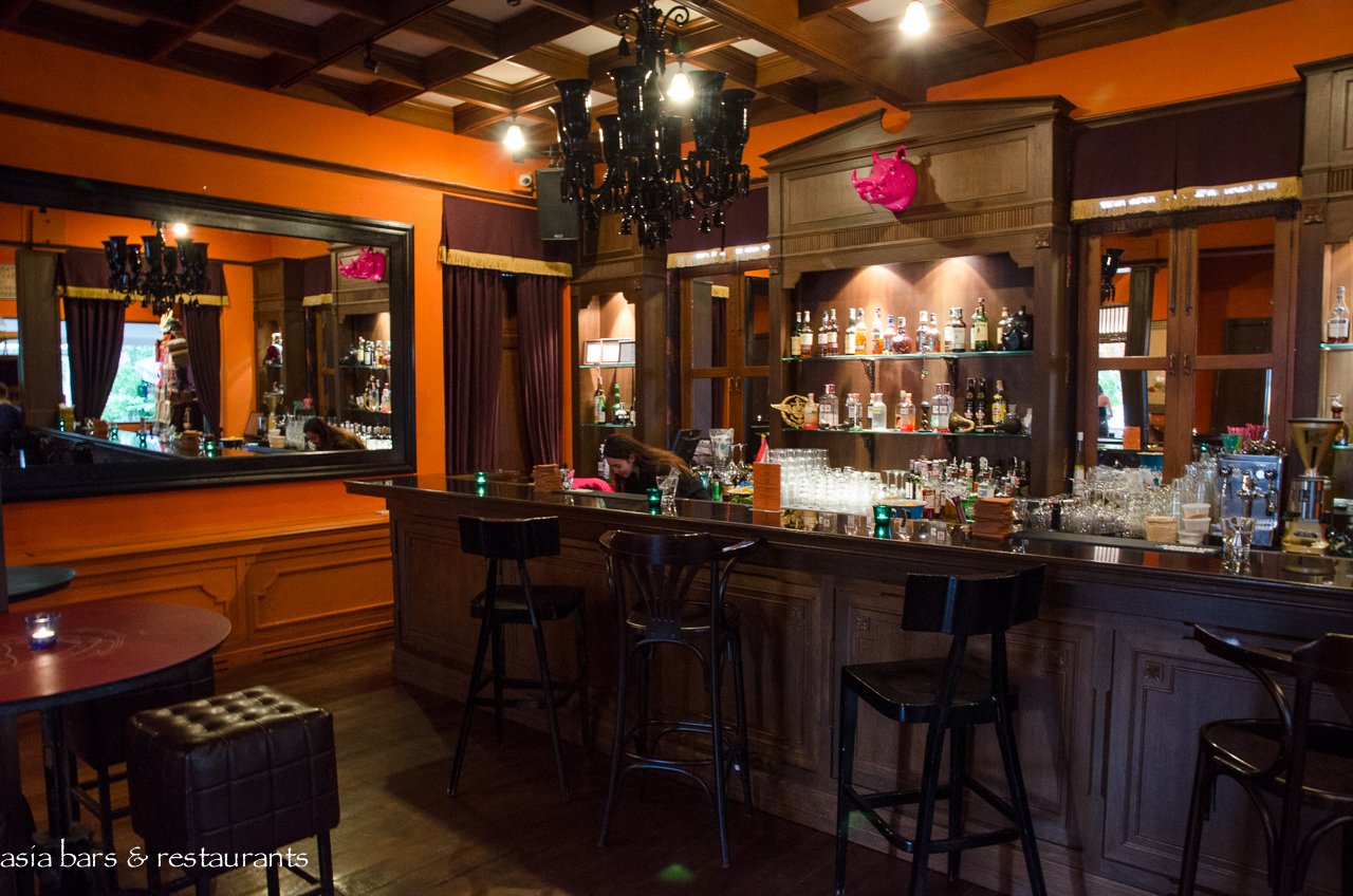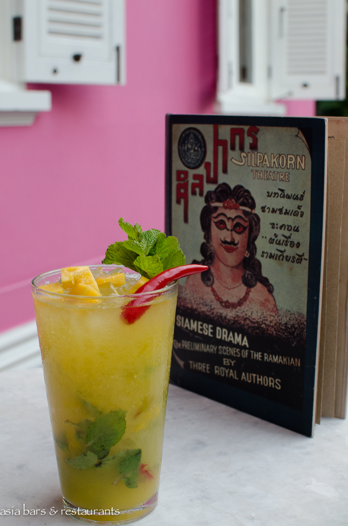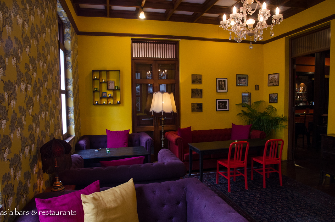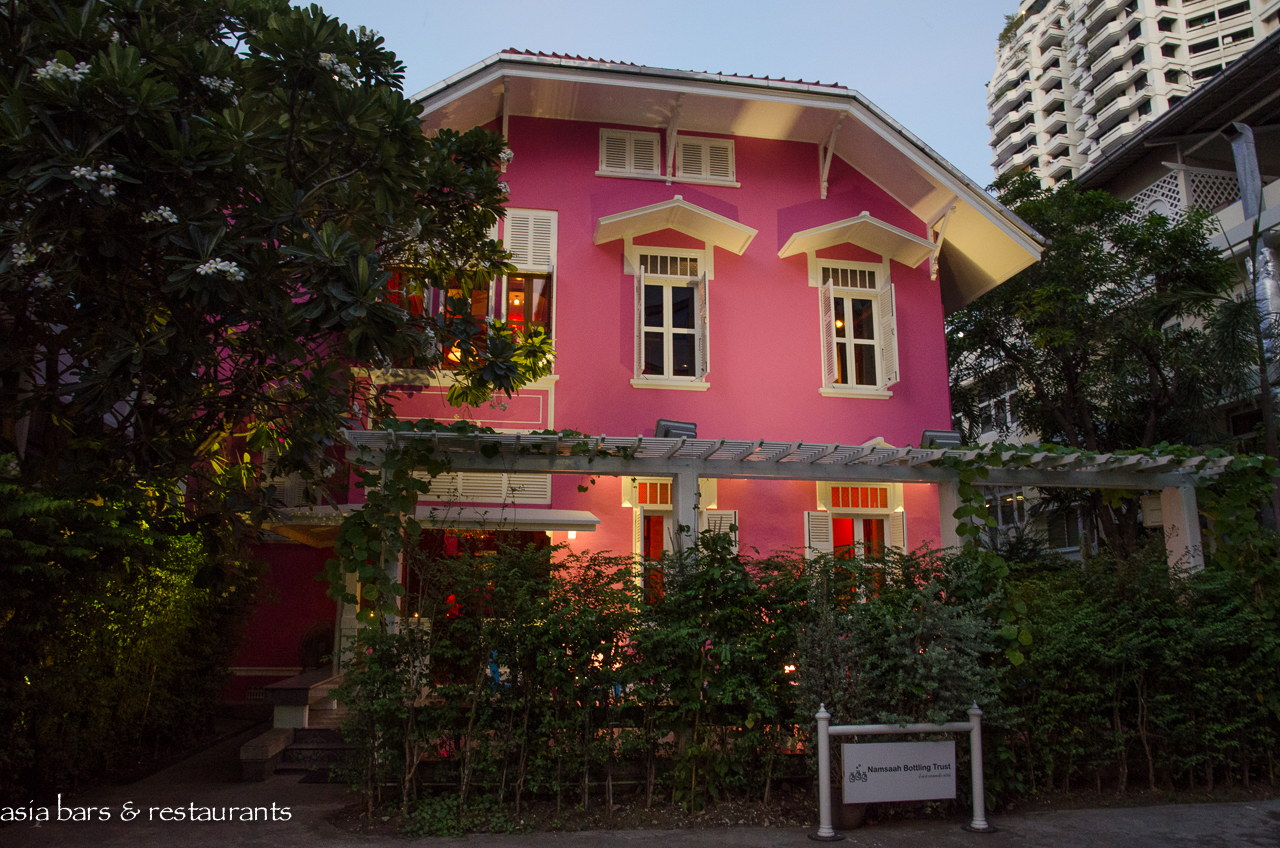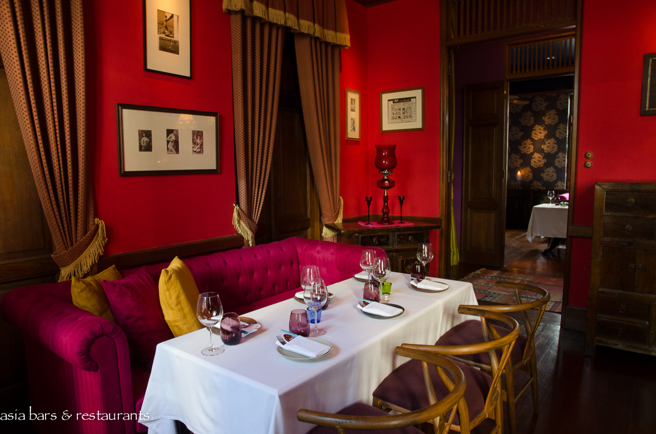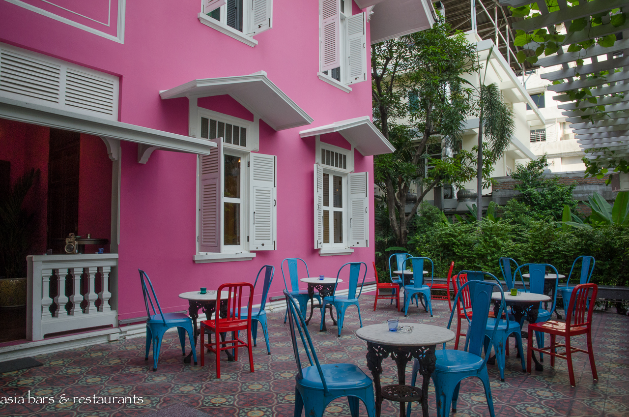 Tucked away on a quiet cul-de-sac within the busy Silom commercial district, the early 20th Century two story timber villa has undergone a major refurbishment to restore it to its original status as the residence of a royal courtier. Taking its idiosyncratic name from a mid-century iteration when the building was occupied by a soda water bottling company, Naamsah Bottling Trust exudes a glamorous presence amid the plethora of nondescript concrete commercial buildings in the neighbourhood. The vibrant fuchsia colored exterior of the building is matched internally with a decor that features walls painted in bold shades of red, mustard, and blue. Colorful fabrics and furnishings reference a diversity of Asian cultural heritages – in harmony with the pan Asian culinary theme.