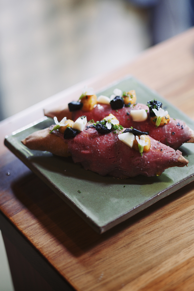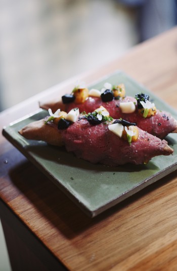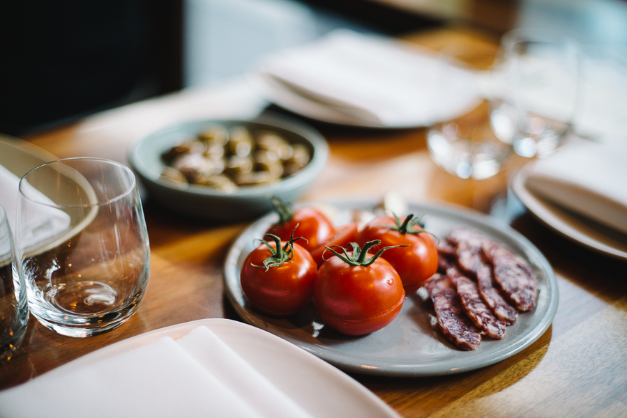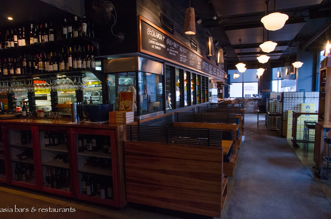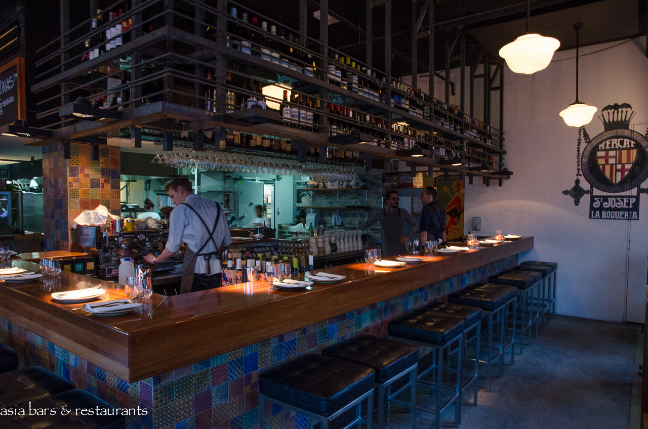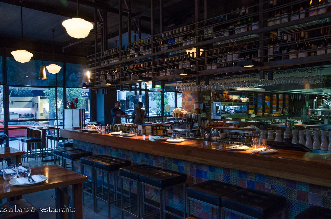 Occupying a street corner space, nestled among a cluster of highly rated bars and restaurants in the Holt Street corner of Surry Hills, Movida Sydney is conveniently accessible and a destination in its own right. Infused with the DNA of its sibling restaurants in Melbourne, Movida Sydney has a similarly attractive contemporary decor, notable for the combination of warm timbers and colorful tiling that reference a Catalan heritage, melded with a comfortable, under-stated sophistication. The imposing open kitchen holds centre-stage – with the handsome “L-shaped” bar and adjacent high tables occupying the space adjacent to the kitchen, with a further section of black leather booths extending across the other side of the floorspace.