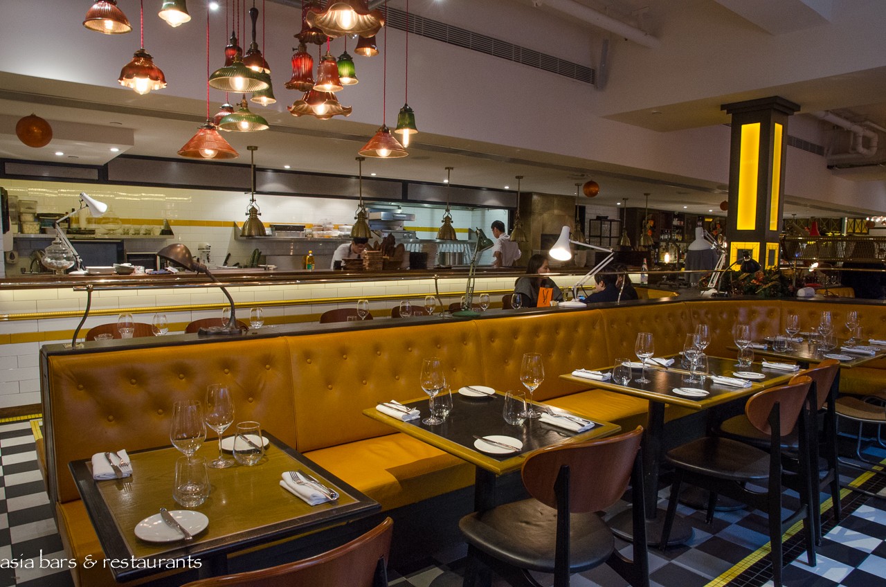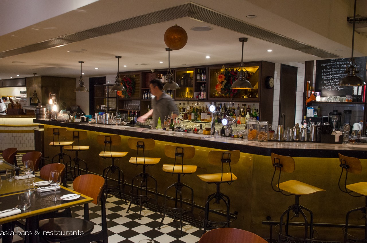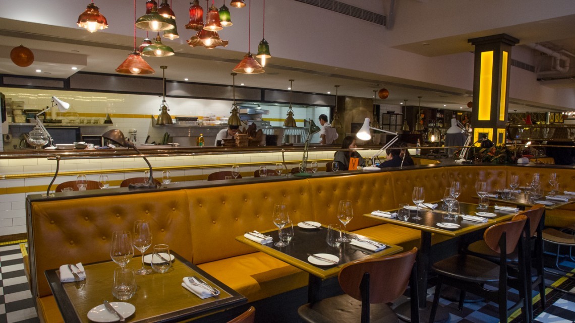 Bread Street Kitchen in Hong Kong is closely modelled on the successful London concept of relaxed yet vibrant brasserie-style dining, in a bright, expansive space. Deftly blending a contemporary brasserie aesthetic with retro industrial-chic elements, the decor features long curved golden leather banquettes, chequerboard flooring, and marble topped counters, together with utilitarian bar stools, metal grilles and exposed ductwork.