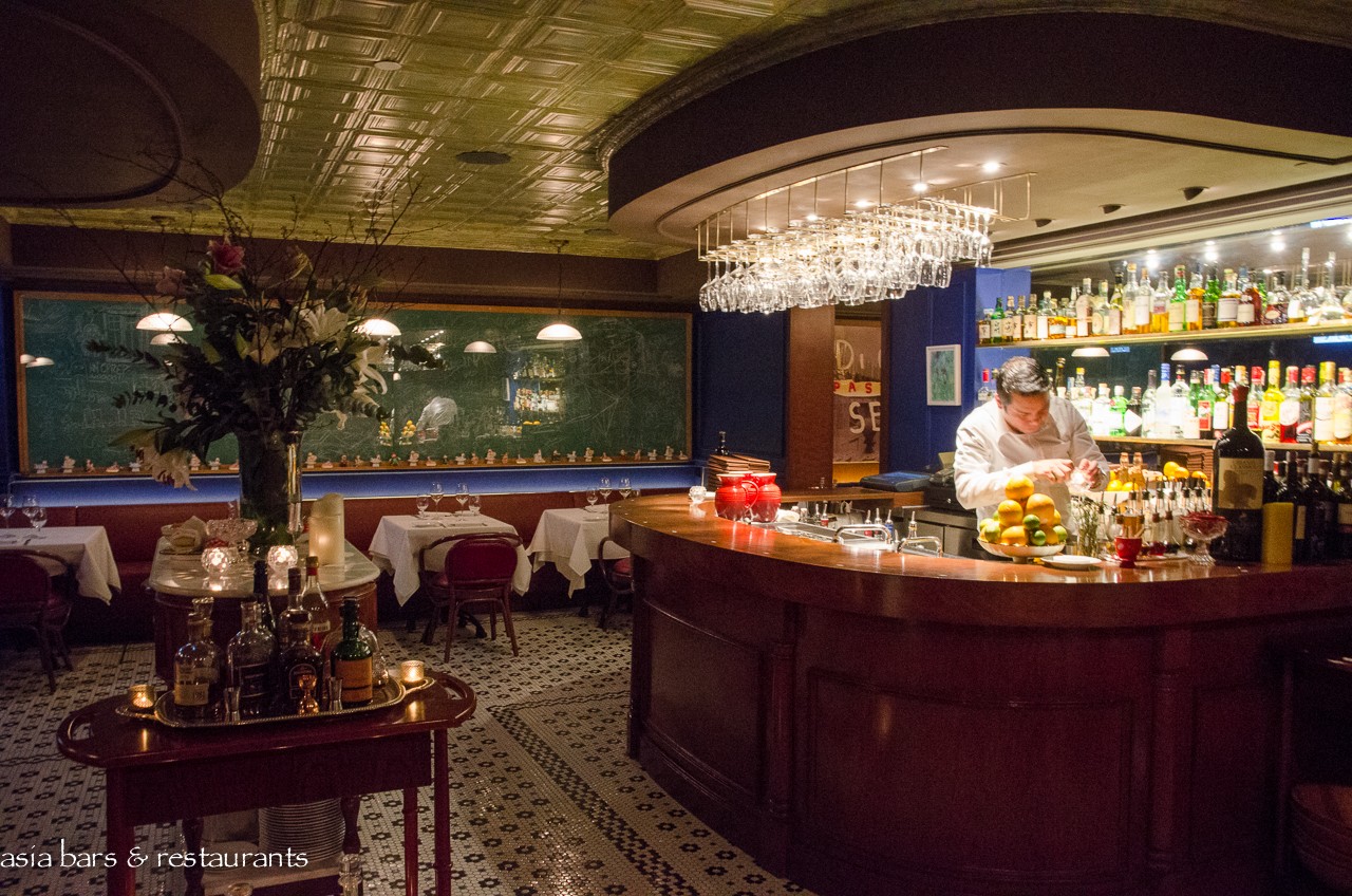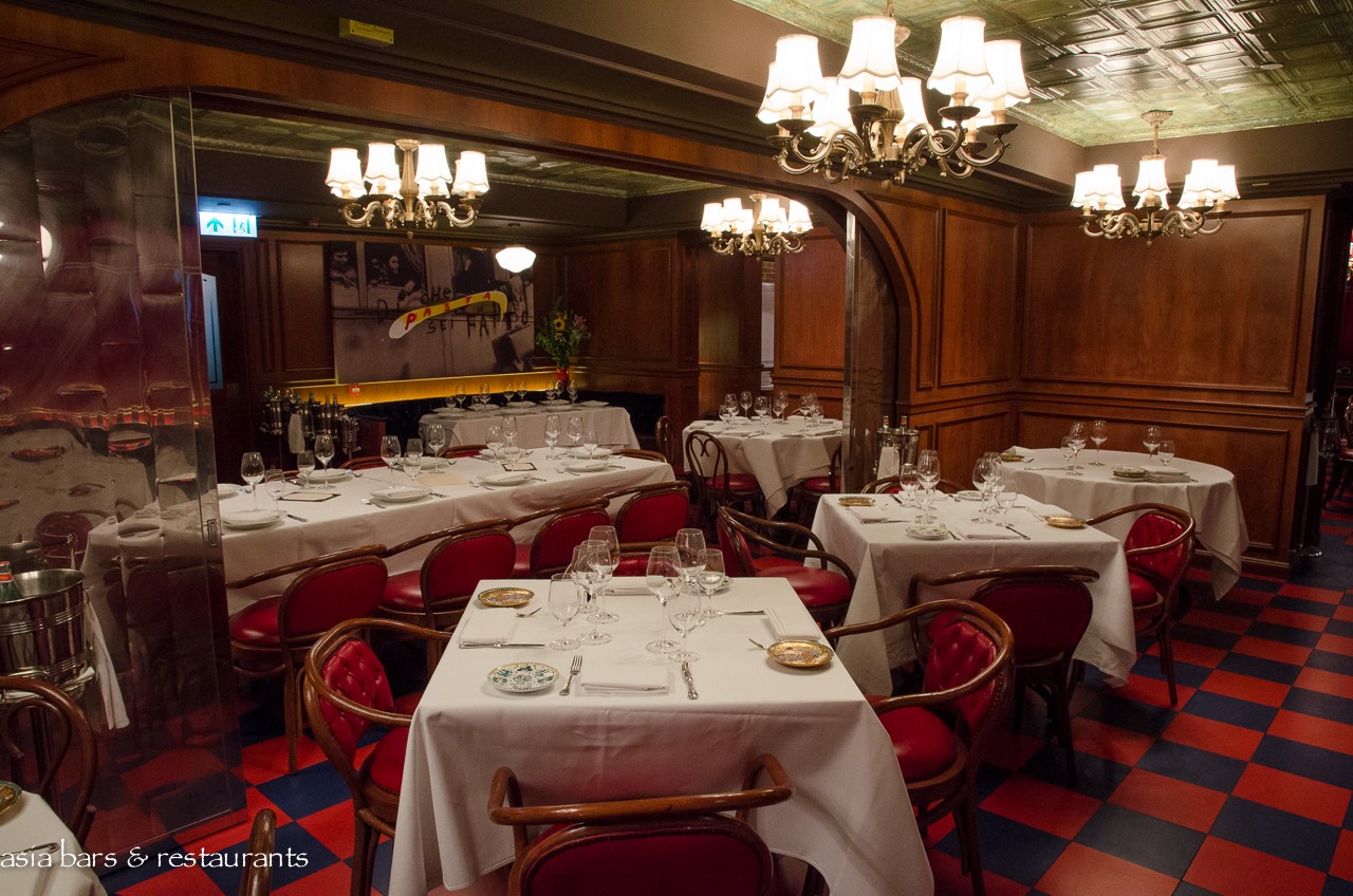 Strategically located within the landmark LKF Tower- home to an impressive assemblage of top-tier Hong Kong restaurants – Carbone greets guests on entry with a handsome front lounge and cocktail bar that is good for pre-dinner drinks or casual dining. The main dining room exudes a relaxed sophistication with its comfortably spaced table and banquette settings amid the meticulously detailed retro decor of antique brass chandeliers, extensive mahogany paneling, and bold chequered floor tiling. Substantial polished stainless steel sliding panels can divide the room longitudinally, while the back dining room can also be further divided into two private spaces.