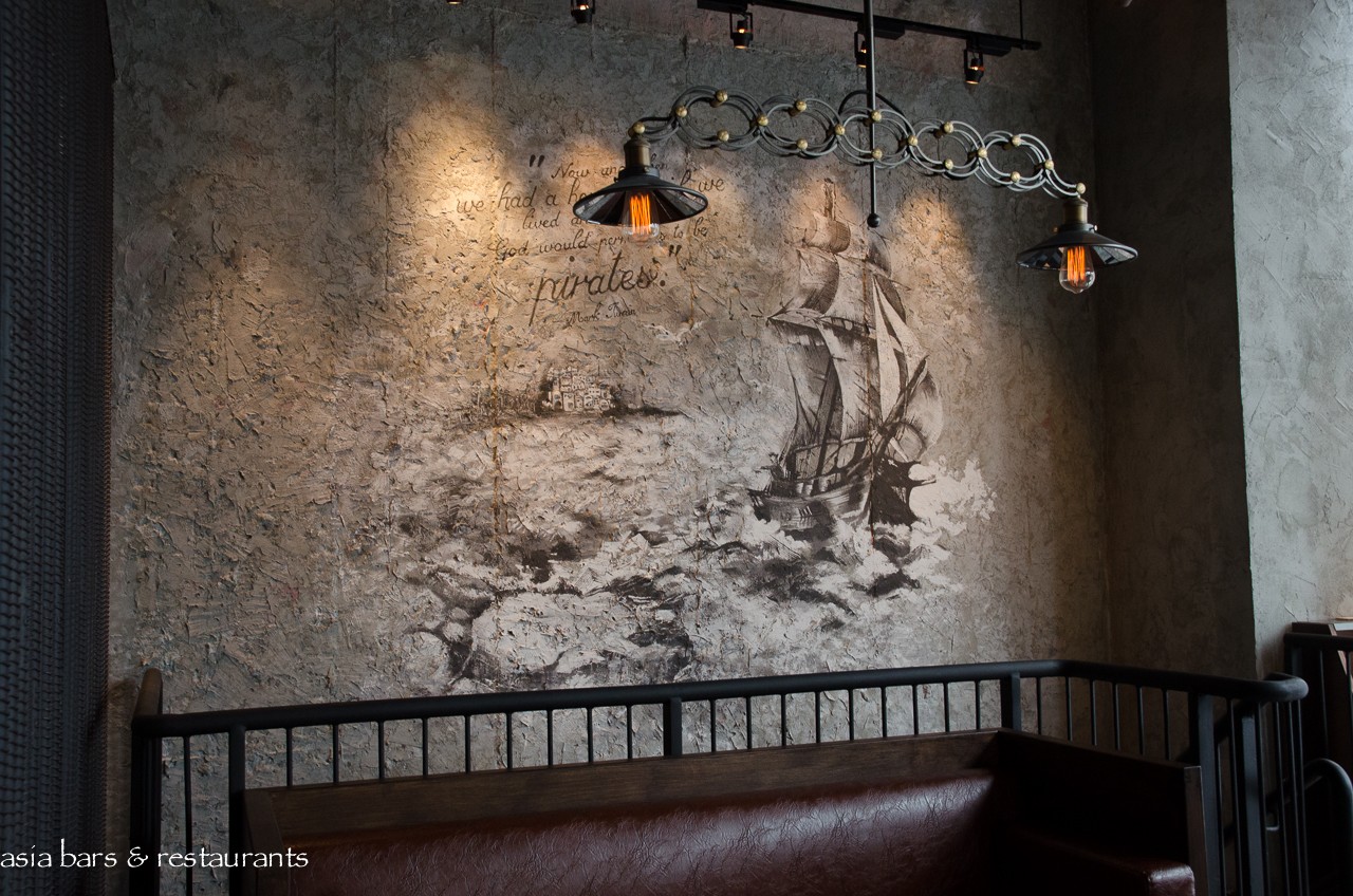 Entering Pirata through the upper level reception, the striking cocktail bar is revealed behind a row of floor-to-ceiling industrial steel rods. Seating options range from stools at the bar to well-spaced high tables and a semi-private lounge area. An internal staircase descends beneath a dramatic monochrome mural to the lower level restaurant where the cosy atmosphere of farmhouse dining is recreated with rustic furniture and vintage fittings. Diners can take a seat at the compact pasta bar adjacent to the kitchen, or choose from either the long leather banquette that spans the length of the room or other tables settings across the floor space.