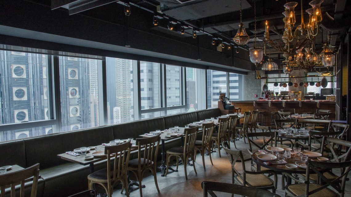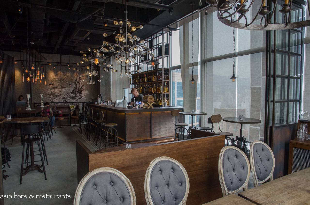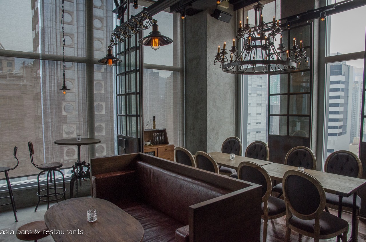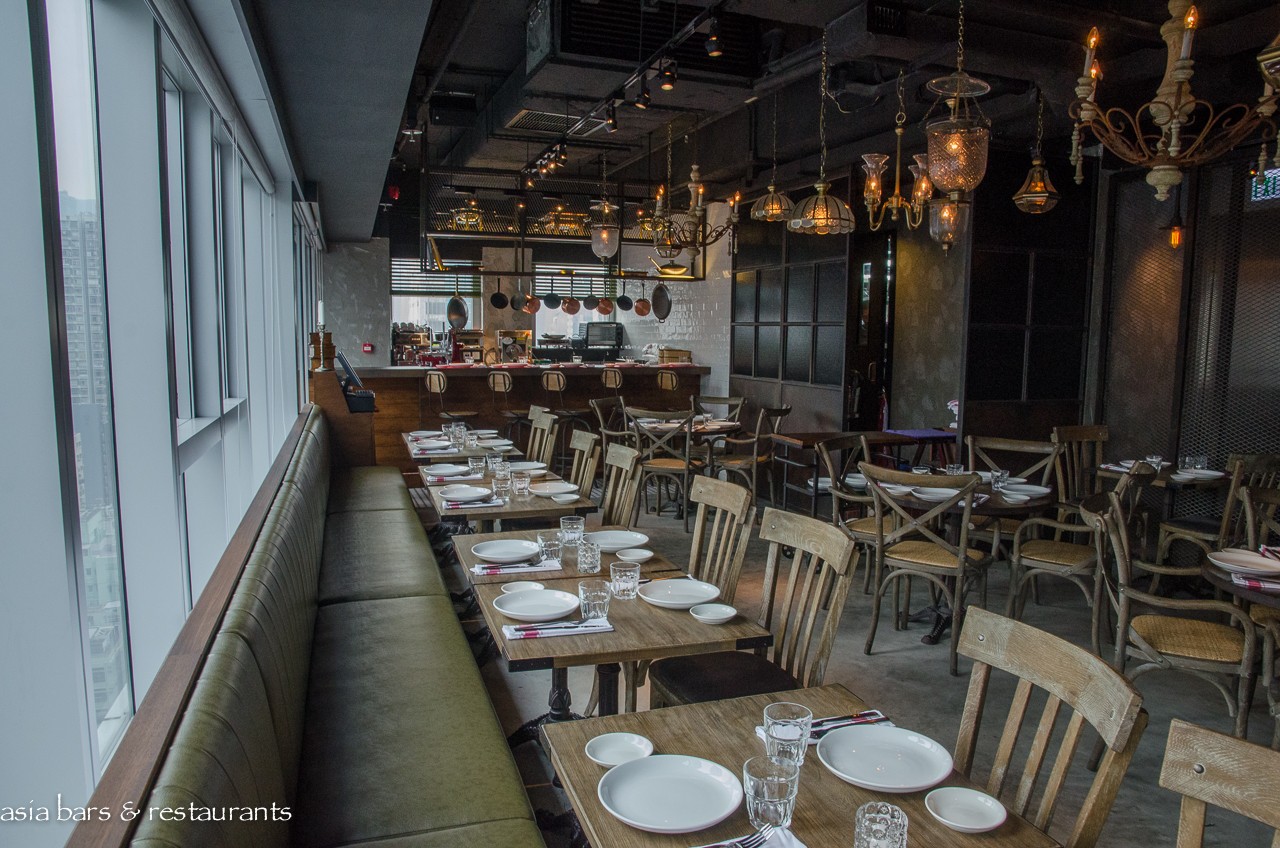 Launched in December 2014, Pirata introduces an engaging new dining and cocktail bar experience to the increasingly fashionable and progressive dining and design enclave emerging within the rapidly gentrifying Wanchai district of Hong Kong. Occupying a spectacular twin level space at the apex of a recently completed commercial tower, Pirata entices discerning diners with its authentic renditions of regional Italian cuisine, served in the relaxed family-style vibe of a typical trattoria. While on the upper level, an intimate cocktail bar and lounge, with its classic cocktails and Italian vermouth specialties, complements splendidly the dining experience on the floor below. An impressively executed interior design melds a rustic farmhouse dining ethos within an industrial-chic canvas of unpolished concrete floors, vintage light fixtures and aged patina metalwork. Dramatic urban views of the neighbourhood skyscrapers are revealed through the full height glass curtain wall that spans the length of each level.
