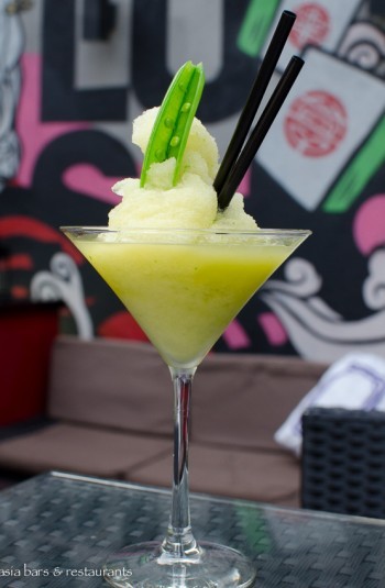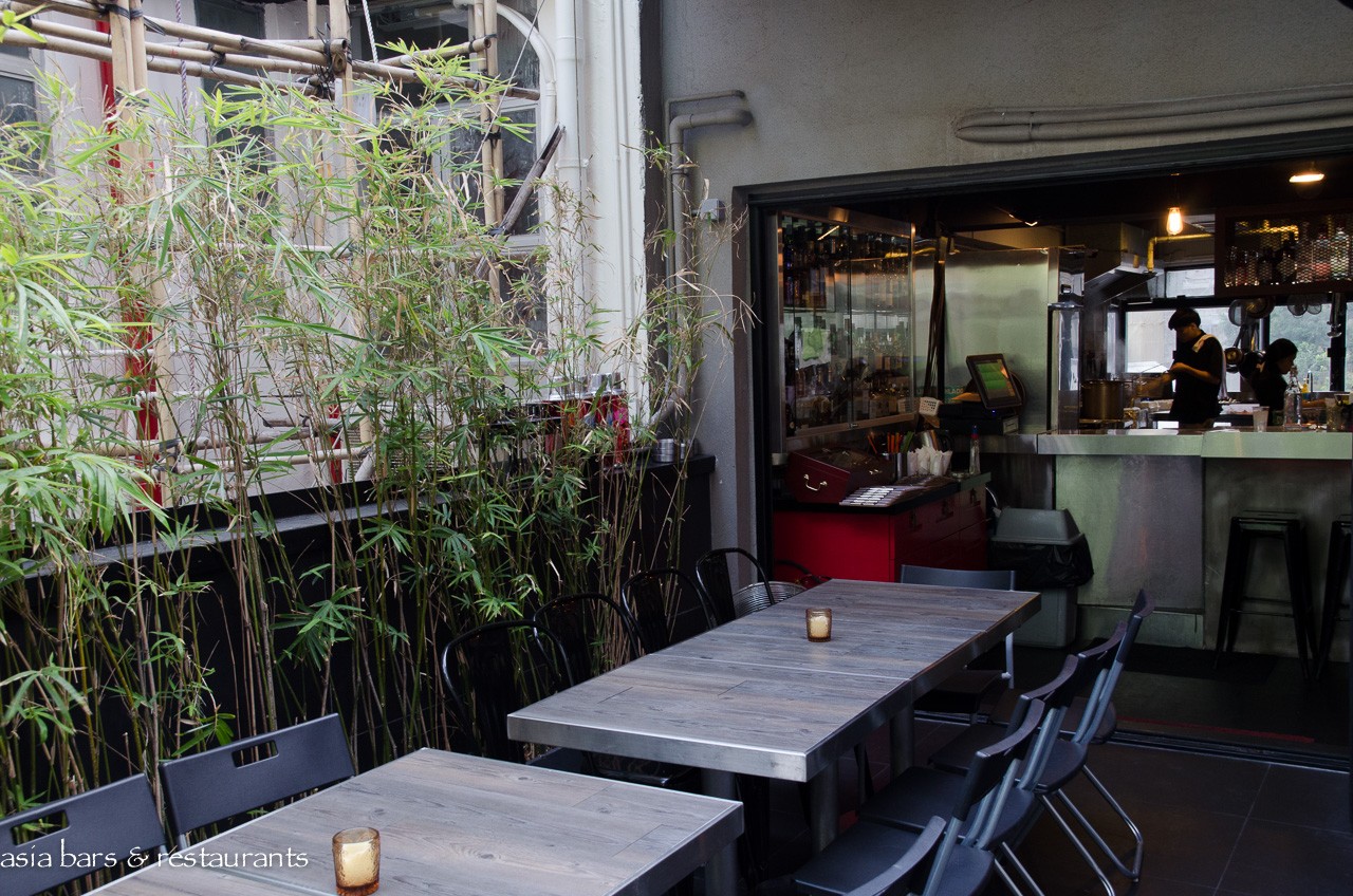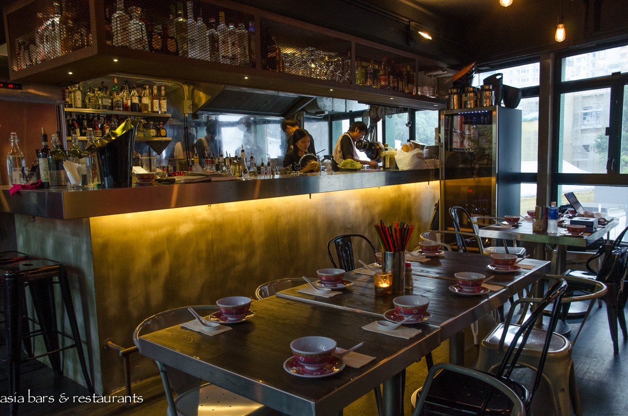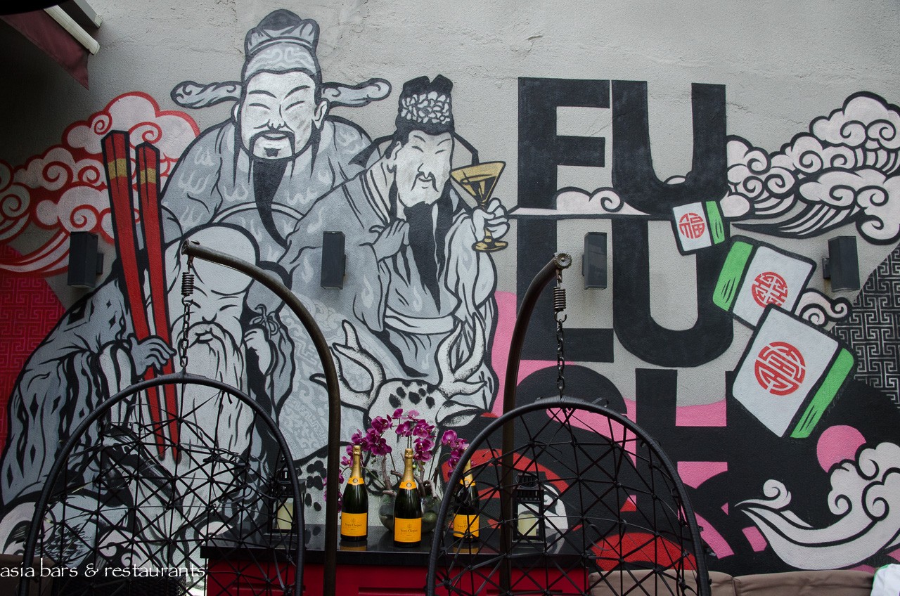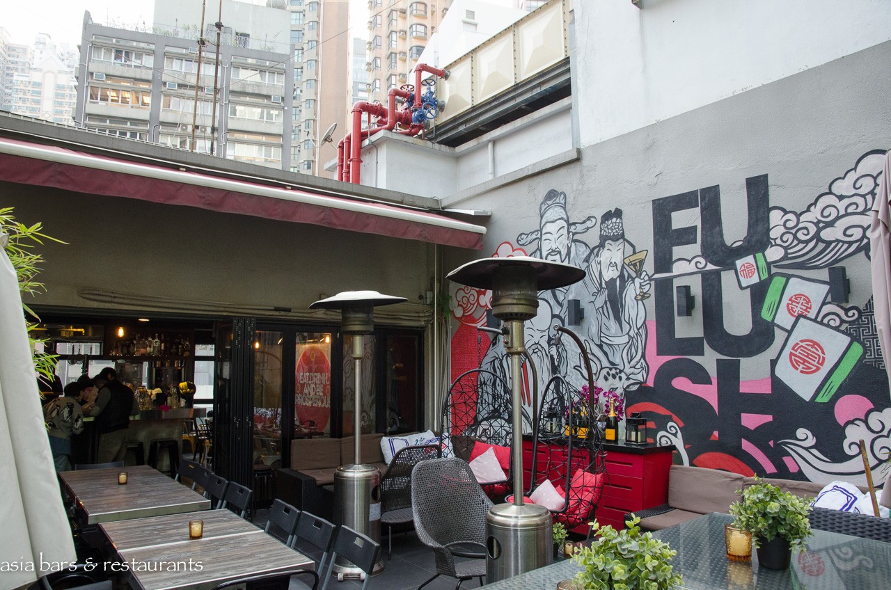 Taking its moniker from three legendary Chinese gods – Fu (happiness), Lu ( prosperity) and Shou (longevity), the compact rooftop space is secreted away atop an ageing, unremarkable seven floor building along the mega-popular Hollywood Road dining and nightlife strip behind Central. Unmarked at the street level, entry to Fu Lu Shou requires a code (just call ahead) to unlock a gate for entry. At the rooftop, a cozy indoor section combines a bustling open kitchen and bar – set behind the mahjong-tiled counter – adjacent to a couple of simple dining tables. Outside on the open-air terrace a stunning graffiti mural created by local street artists is splashed across the main wall, while a casual, understated decor of high tables, sofas and swinging chairs are surrounded by a backdrop of close-up urbanscape views.