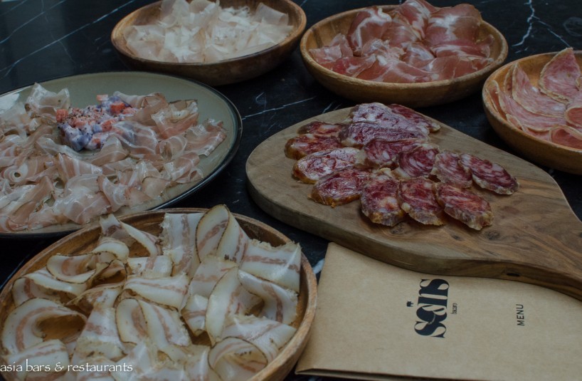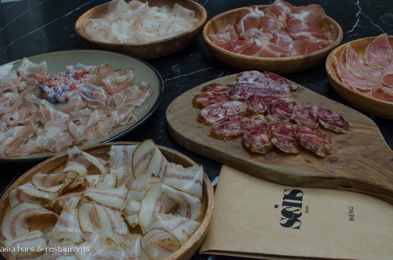 Set within a spacious corner shophouse space, &SONS offers casual outdoor seating at high tables set under large black market umbrellas, and with comfortable dining at well-spaced bistro tables in the stylish interior. A handsome marble-faced bar stands prominently at the entrance while the kitchen at the rear includes a glass-fronted meat curing room showcasing the house-cured meats and salami. A stylish contemporary decor deftly fuses with the traditional Italian wine bar aesthetic – featuring a bold palette of dark timber flooring and furniture, contrasting with turquoise rendered walls and traditional style black and white chequered flooring.