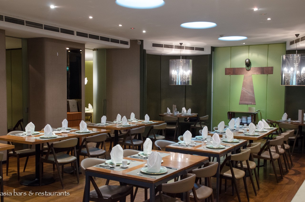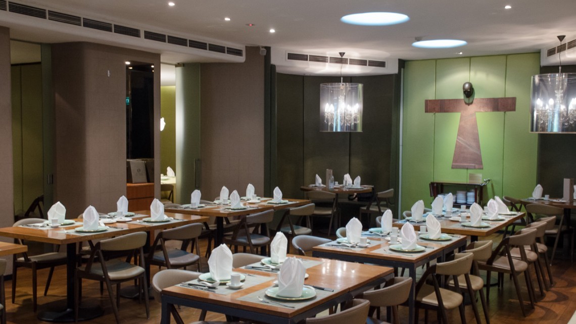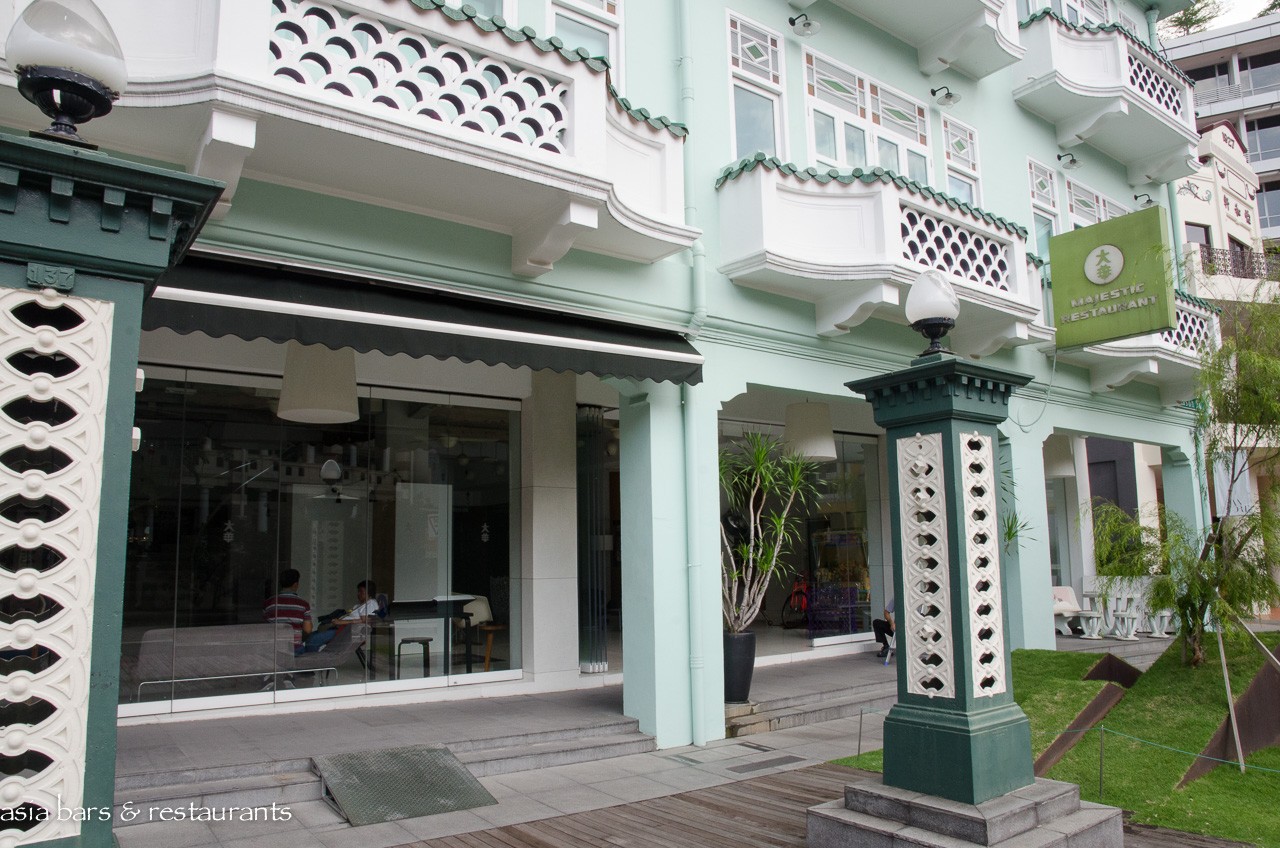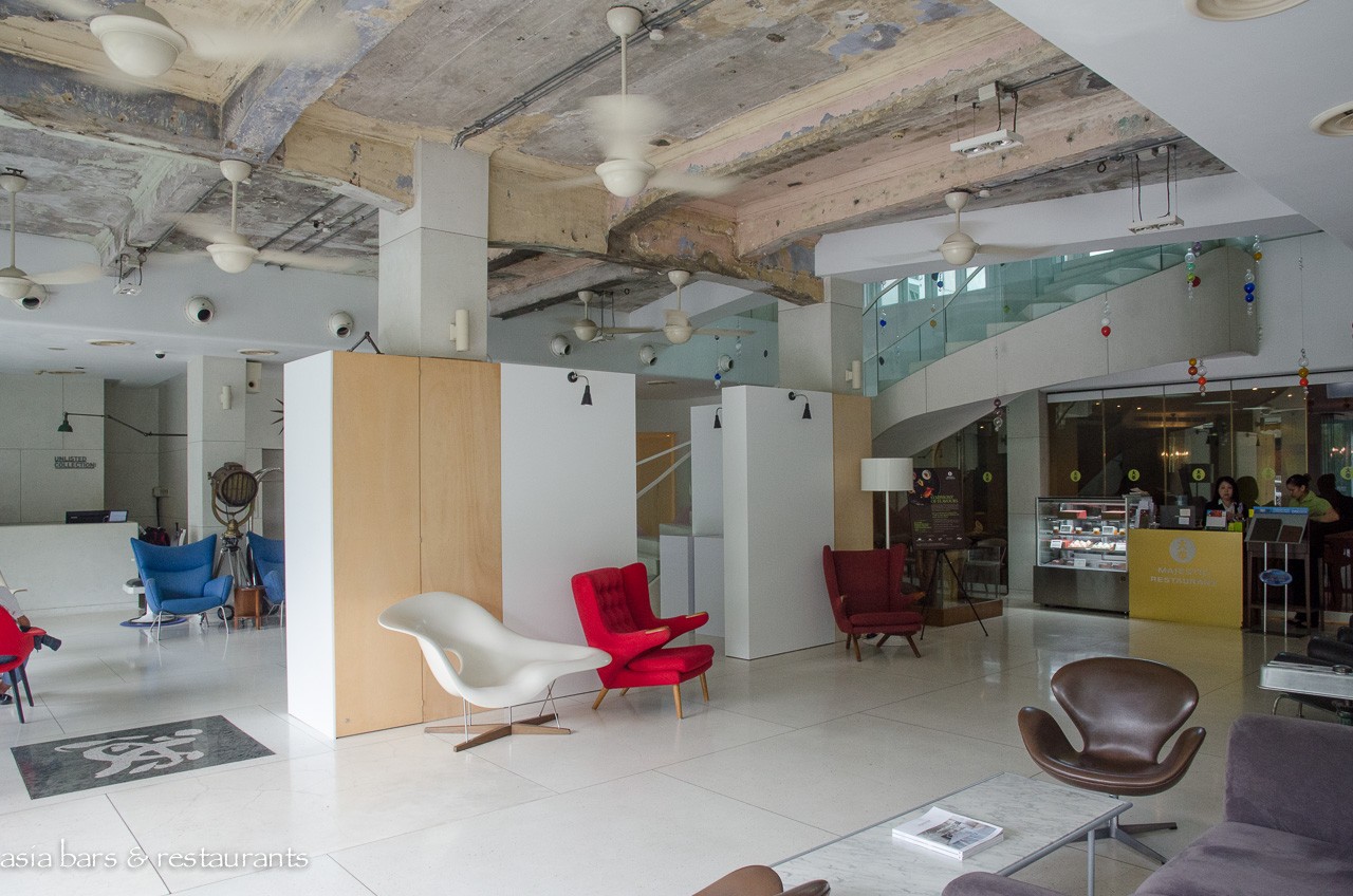 Occupying a glass-fronted space within the lobby of the remodelled early 20th Century hotel, Majestic Restaurant’s contemporary interior melds harmoniously within the hotel’s idiosyncratic combination of bold modernist decor and heritage shophouse facade. Comfortably seating around 100 guests in the main dining room and adjacent private rooms, the muted tones of the restaurant decor exude an understated stylish elegance, while a series of large portholes set into the ceiling offer glimpses into the hotel swimming pool above.
