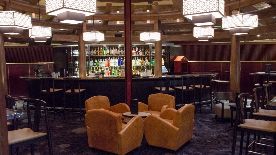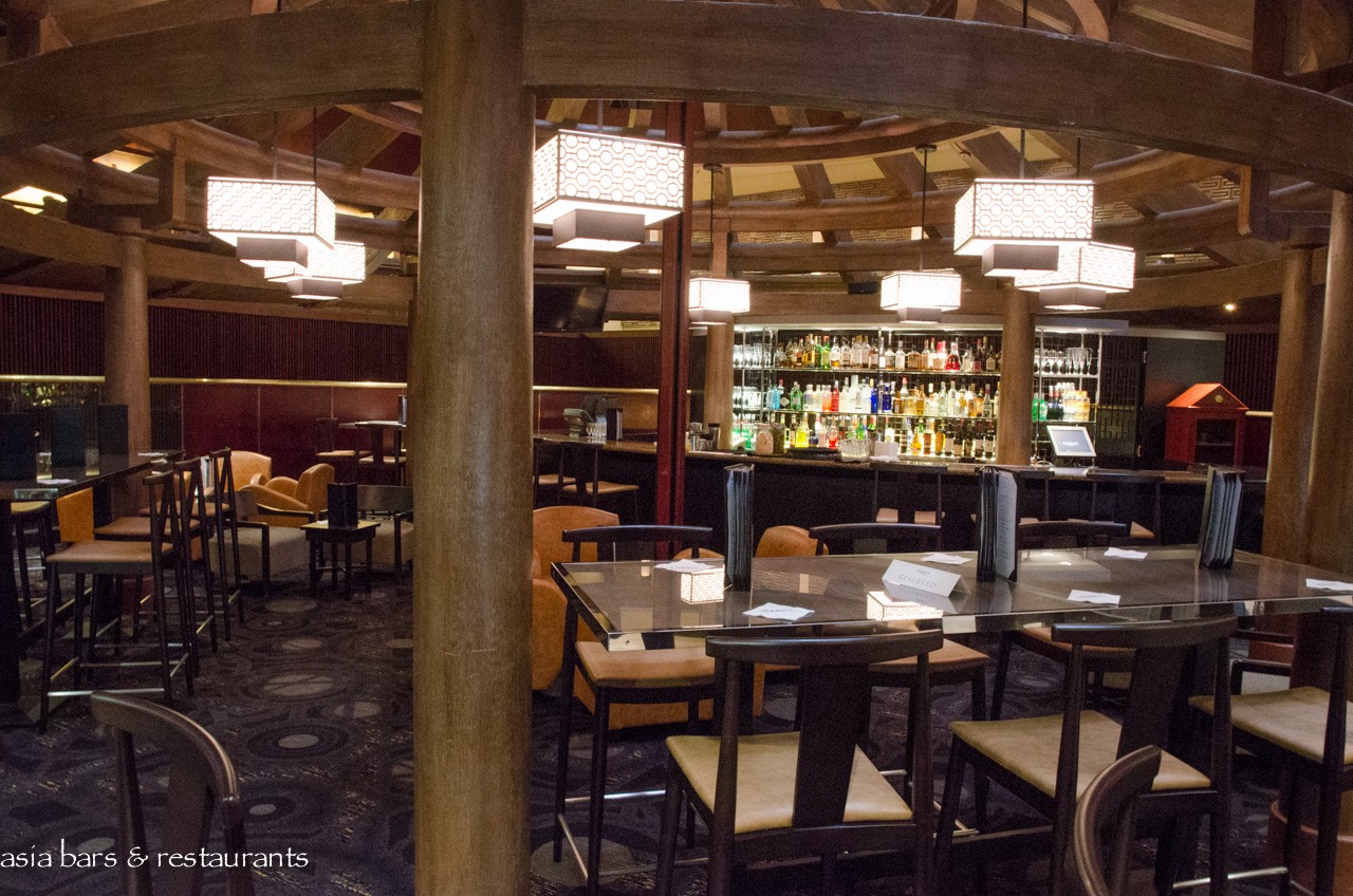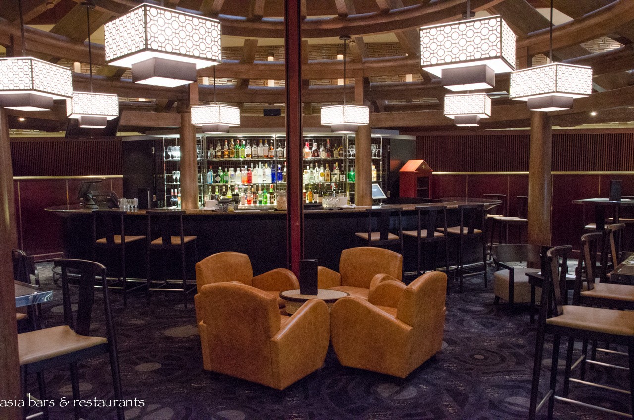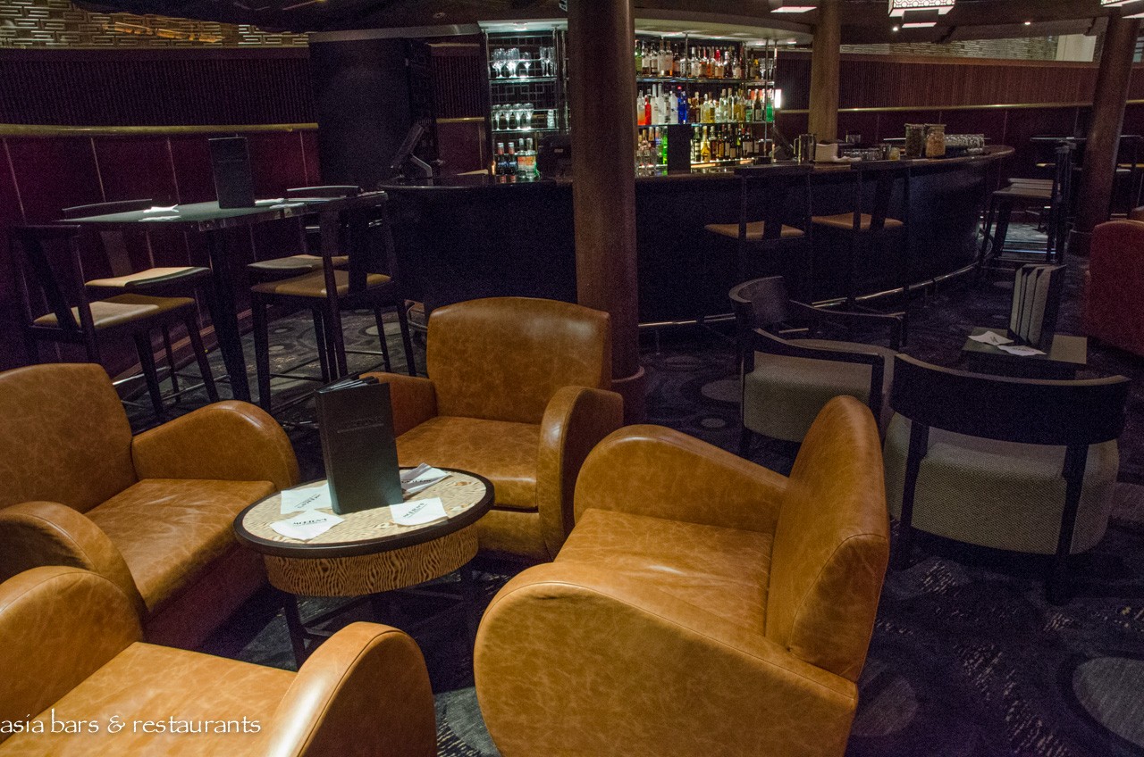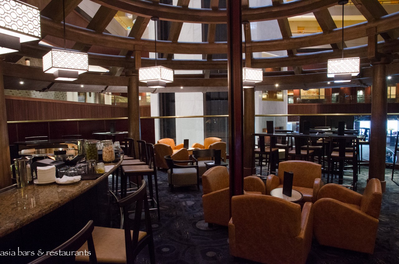Discretely located on the 4th floor within the towering atrium of the luxurious Mandarin Oriental, Singapore – the stand-alone circular timber structure of The Bar at Morton’s takes its design cues from traditional pagodas found across Asia. Overlooking the void of the Atrium, the interior comfortably accommodates around 80 guests in an atmosphere a relaxed sophistication. Seating options include high table settings, or plush retro-style tan leather armchairs.