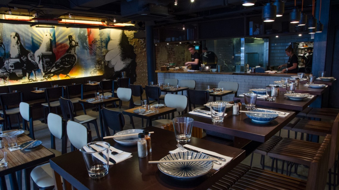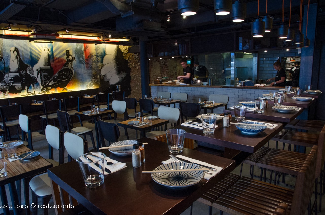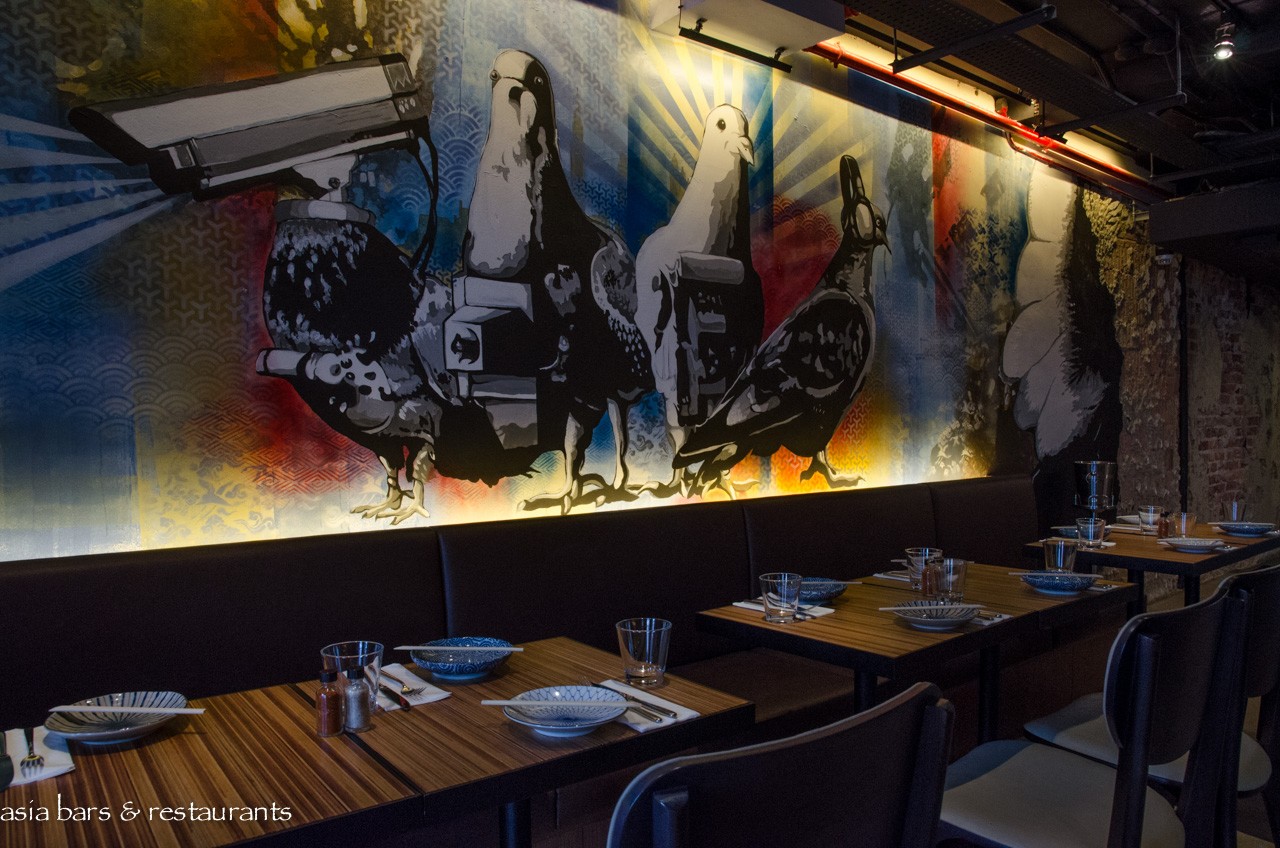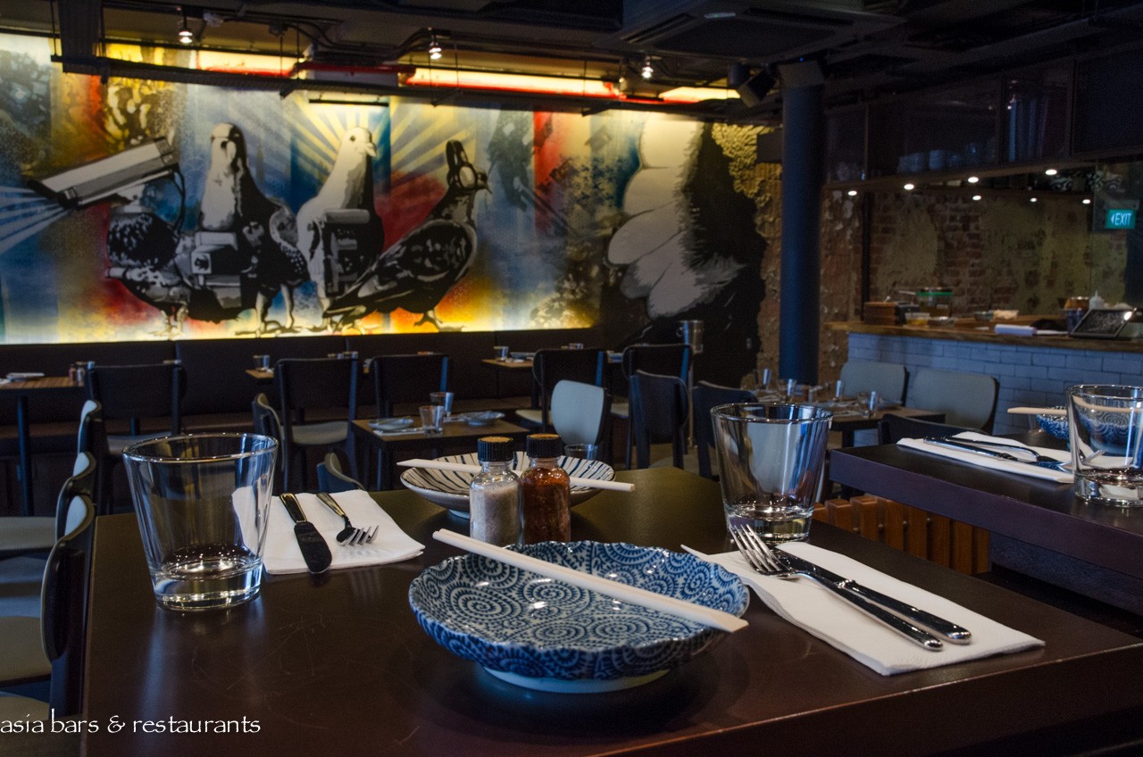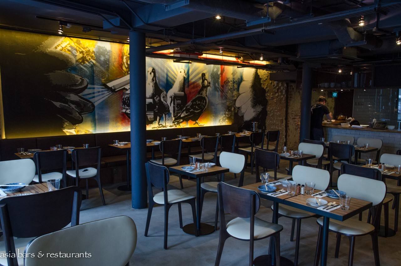 With an ownership connection to the uber-hot Hong Kong-based Fatty Crab restaurant, Neon Pigeon brings to Singapore a similar urban street cred, deftly blending an edgy, industrial-chic design aesthetic with an approachable menu of Japanese-inspired dishes designed for sharing. Set in a street level space behind the restored facade of colonial-era heritage shophouses, the restaurant interior features an open-plan layout with the dining area and open kitchen adjacent to the bar section. A pared-back decor of custom-made timber tables and simple chairs evoke a Japanese dining aesthetic, while the industrial palette of concrete flooring, exposed brickwork, and steel framed windows is animated with the specially commissioned pigeon-themed graffiti art, boldly splashed across the walls to underscore the urban vibe.