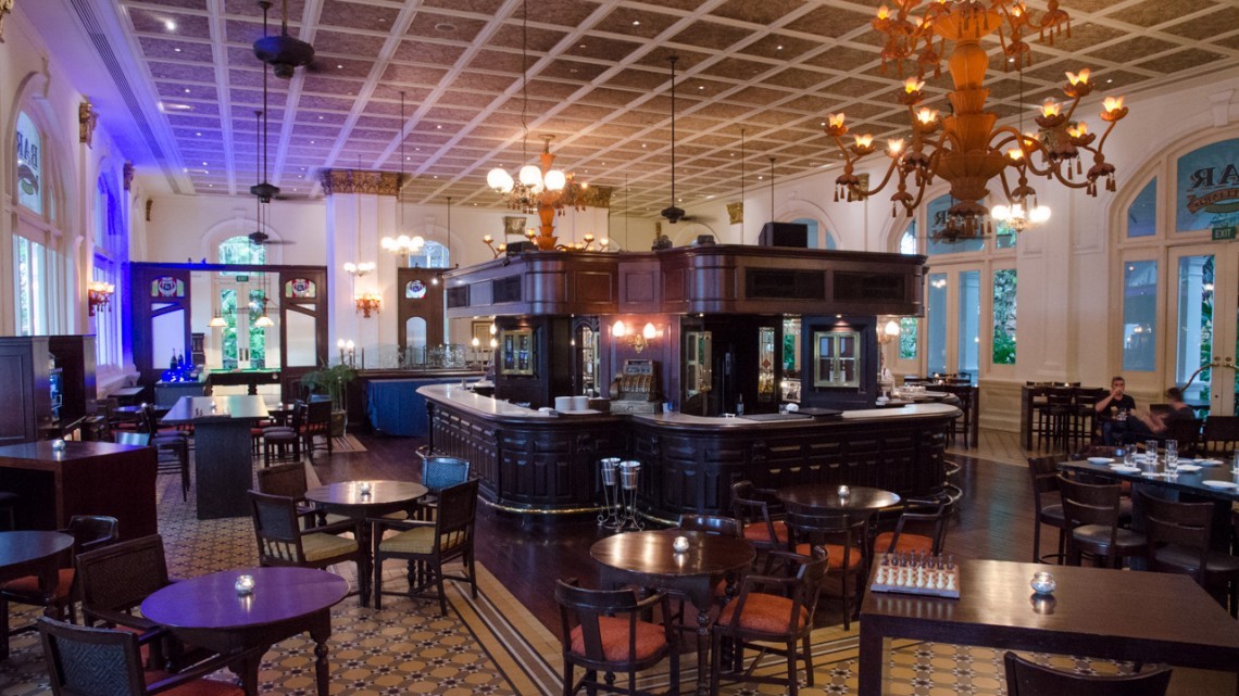 Grandly proportioned with high ceilings, wide verandahs and spacious interior, the Bar & Billiard Room retains essentially the same structure and layout as when it first opened nearly 120 years ago. Elegant chandeliers, dark timbers and classic tiled flooring epitomise the renowned colonial era charm of Raffles, while two antique billiard tables continue in service, evoking the rich heritage of the original gentlemen’s billiard room. With the updated layout, guests can now select between a number of seating options, with high tables adjacent to the central bar, well-spaced table settings across the expansive floor space, and relaxing rattan sofas and chairs on the front terrace.