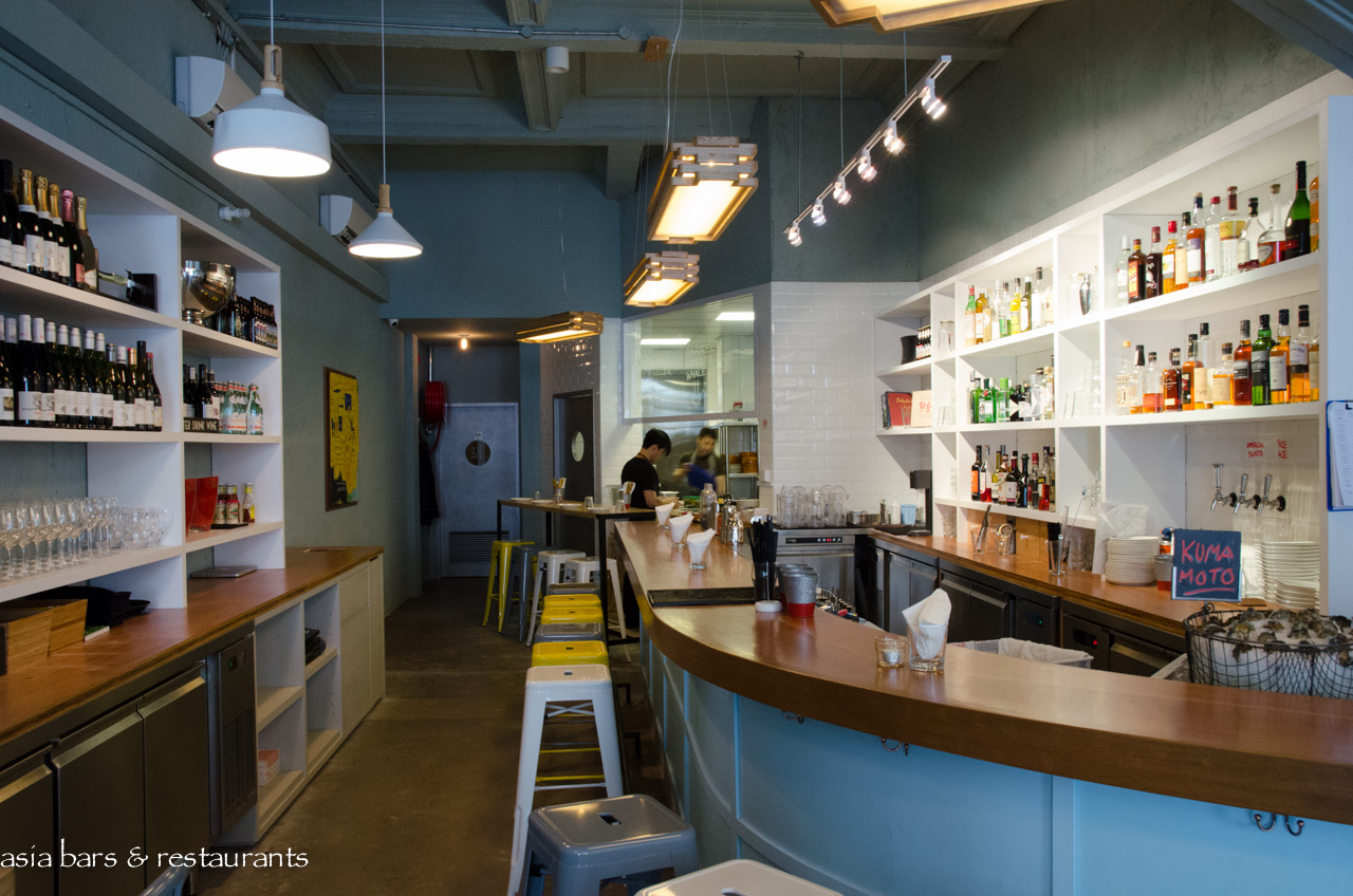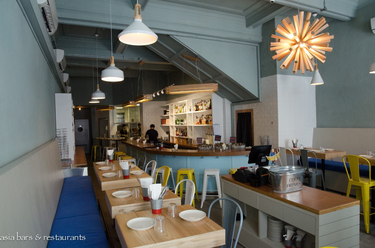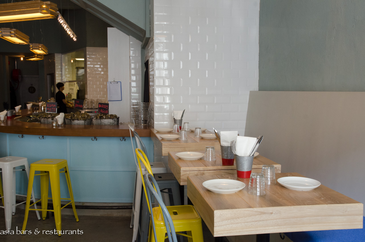 Design Located in a compact ground level space of a refurbished shophouse, Humpback seats 40 diners at a series of high tables, while table settings on the open-air street front terrace accommodate a further 15 guests. The light-filled space features a simple, casual decor that complements the culinary style – a pared-back palette of nautical blues and natural timbers blends agreeably with the white tiled walls and concrete floor. Meanwhile, at the curved bar, large wire mesh baskets showcase the daily selections of fresh Pacific NW oysters.