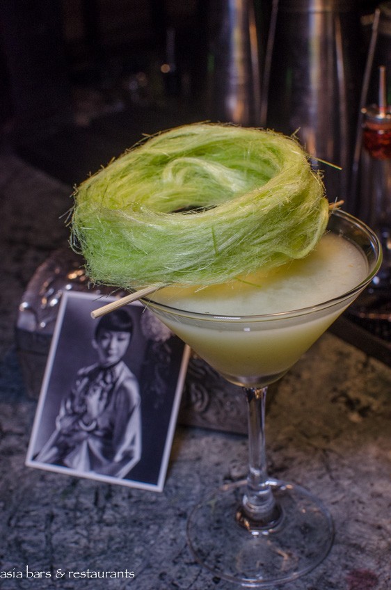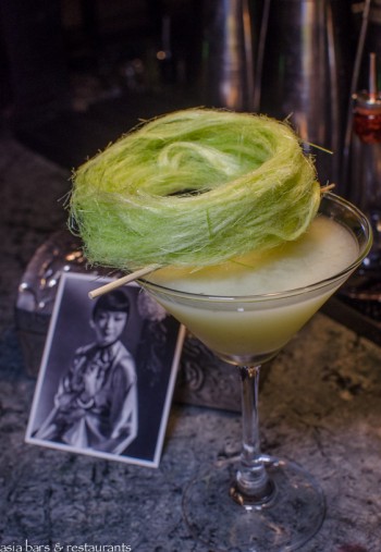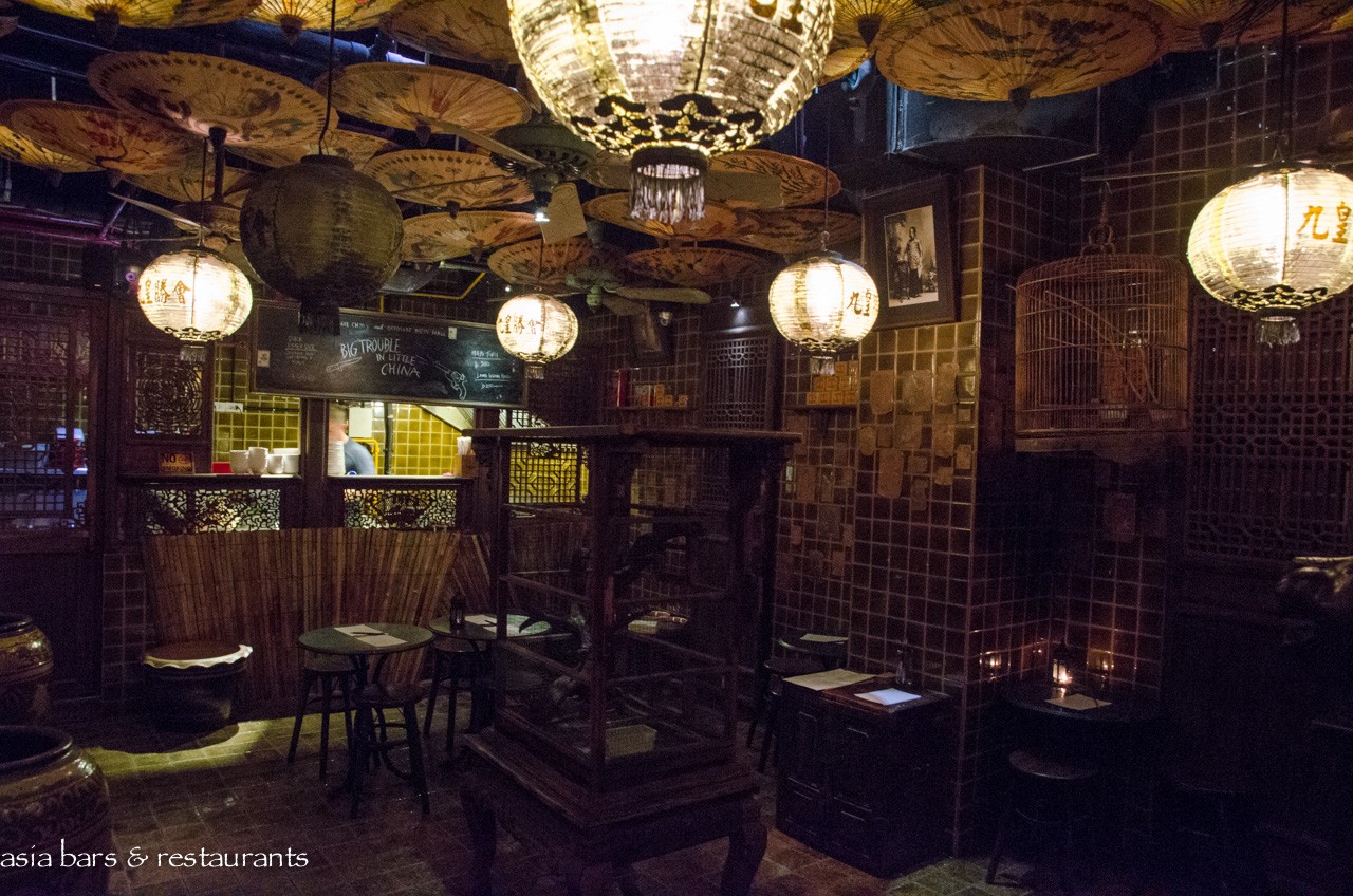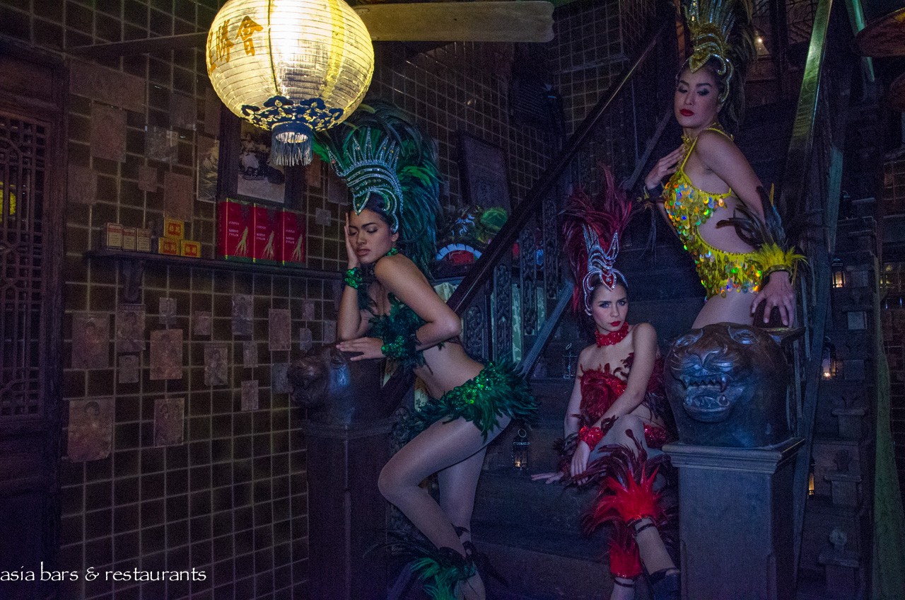 Decor Entering through a street level doorway, guests descend down a vintage timber staircase into the elaborately reconstructed Shanghai-style noodle shop. Passing through a further dark curtained passageway reveals the main bar space with its raw brick walls, plush leather Chesterfield sofas, and Victorian-era decorative embellishments. Arched vault spaces set into the side walls accommodate intimate private groups, and while bar staff at the central bar serve drinks across the metal grill protected counter, models evocatively dressed in traditional cheongsam-style dresses recline on suspended swings.