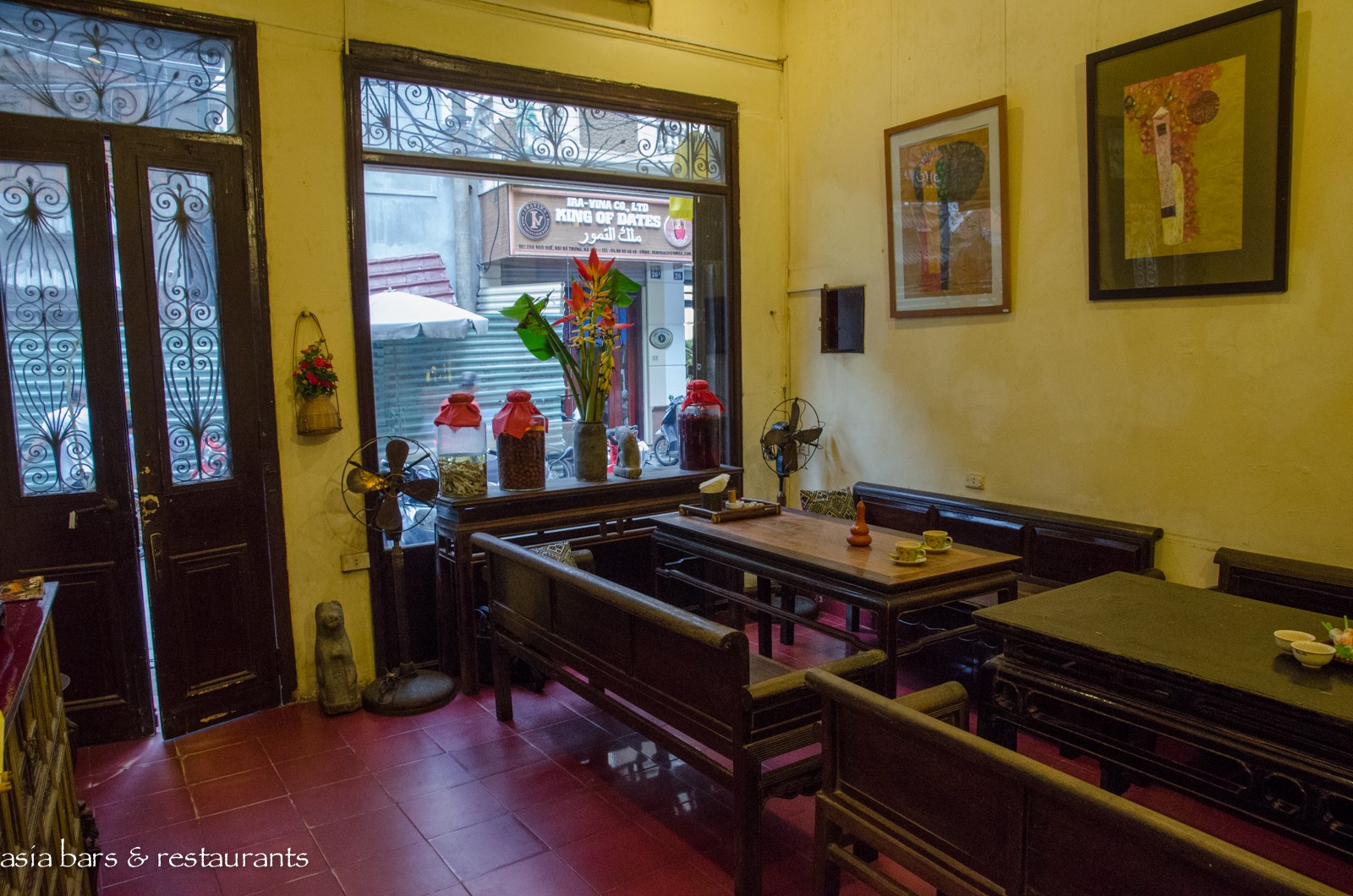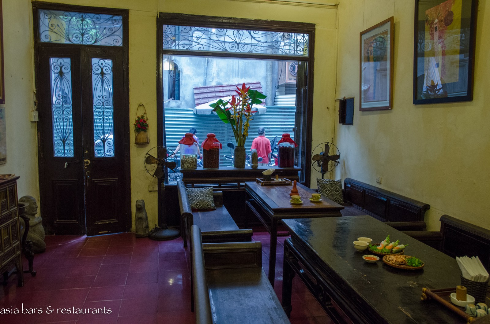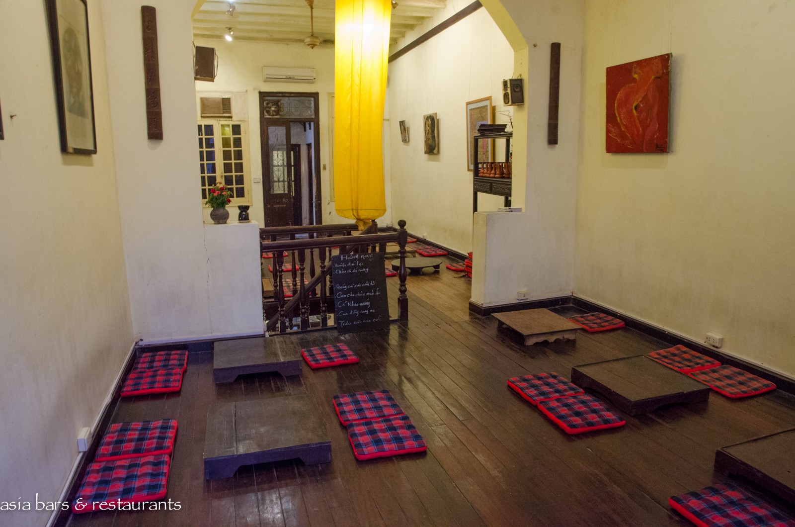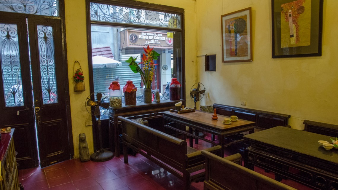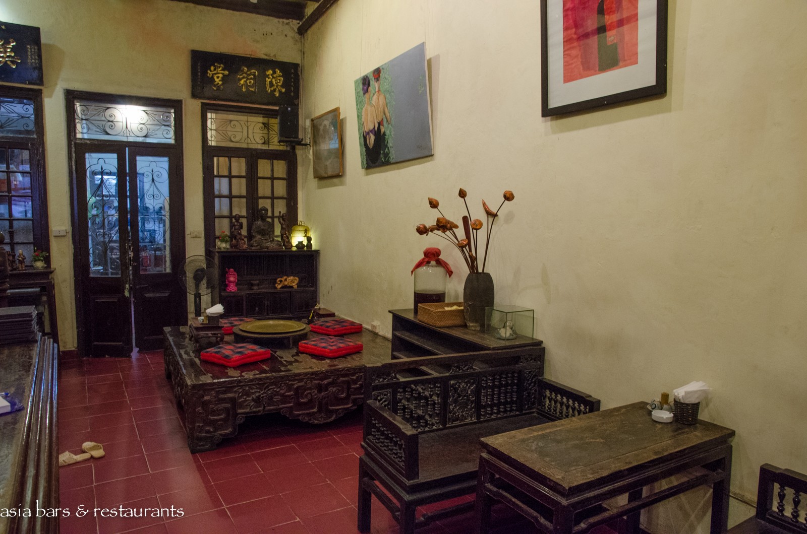Decor Housed within a 1930′s French-colonial style two-story residence in an unremarkable small street in the midst of Hanoi’s residential (and art gallery) Hai Ba Trung district, the restored residence retains many of its original features – while the interior decoration features local antique timber furniture. On the ground level, the dining area is furnished with several large traditional dining tables and bench seating, and on the upper floor of the converted residence, traditional village-style dining settings with floor cushions and low tables are arranged across the open floor space. Artworks from local artists are displayed throughout, with vintage paraphernalia and Buddha carvings references of a family heritage.