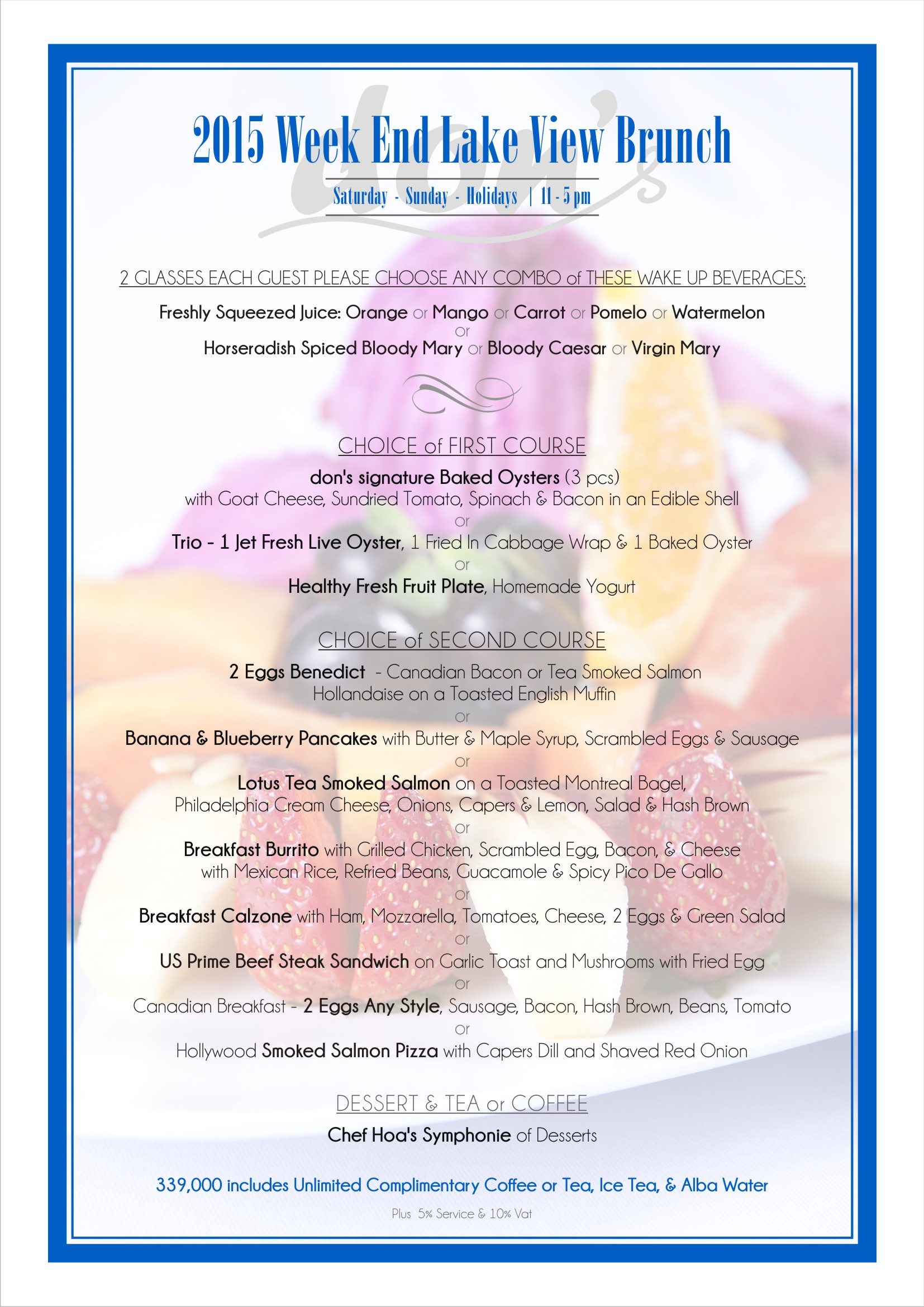 Cuisine Heading up the kitchen, high-profile local executive chef Nguyen Van Tu works with Canadian founder Donald Berger to create an approachable menu that offers selections of contemporary Vietnamese, pan-Asian, and Western cuisines cooked with fresh seasonal ingredients and accomplished technique. The recipient of numerous international and local restaurant awards, menu specialities include Prime US and Japanese Kobe beef; fresh truffles in season; and fresh local and imported seafood. The expansive menu also offers wood-fired pizzas, fresh pastas, and authentic Vietnamese dishes, while the Weekend Brunch Menu is a favourite with locals.