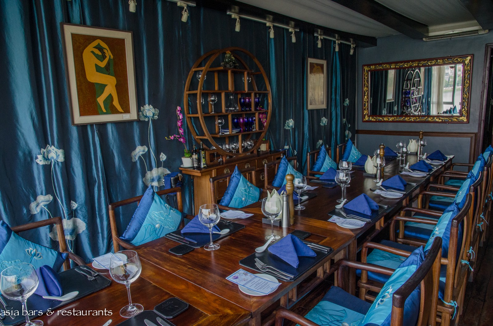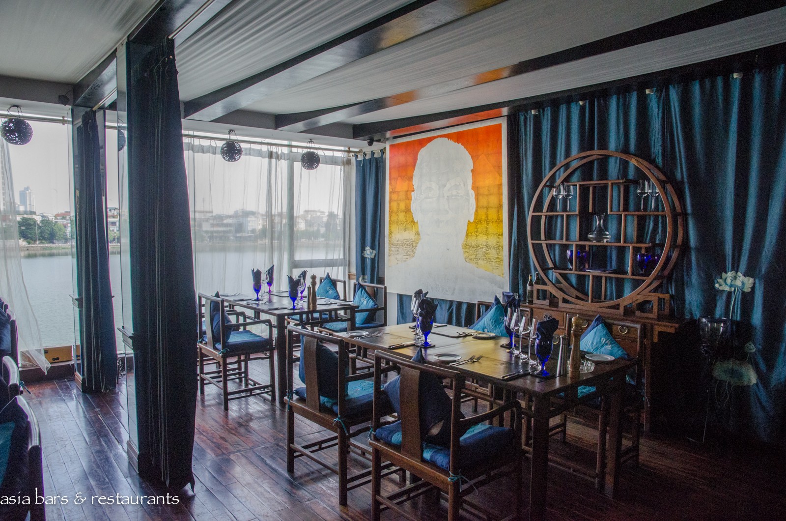 Decor Exploiting its prized lakefront setting, full height glass facades on each floor of the extensively reconstructed building capture the uninterrupted lake views, day and night. Dining room interiors are decorated with a contemporary Chinoiserie-chic aesthetic with rich timber furniture highlighted with bold turquoise soft furnishings. The open-air rooftop Oyster Bar exudes a casual, laid-back vibe, with black rattan bar stools standing along the full-length glass countertop offering superb lake vistas. Other spaces within the 4 levels include an elegant private dining room, intimate cigar lounge, and open terraces adjoining each dining room.
