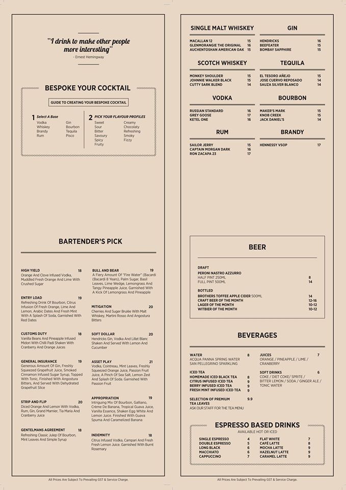 Cocktails In addition to an extensive wine list, the bar team at Equilibrium offer a creative yet attractively priced cocktail list informed by imaginative ingredient combinations, well-balanced taste profiles and progressive mixology techniques. Among the rewarding cocktails is the Faux Patissier – an indulgent blend of butter shortbread syrup, Tupelo Honey Fig Tea, espresso, Koko Kanu Rum, Patron XO, cinnamon syrup, French cream.