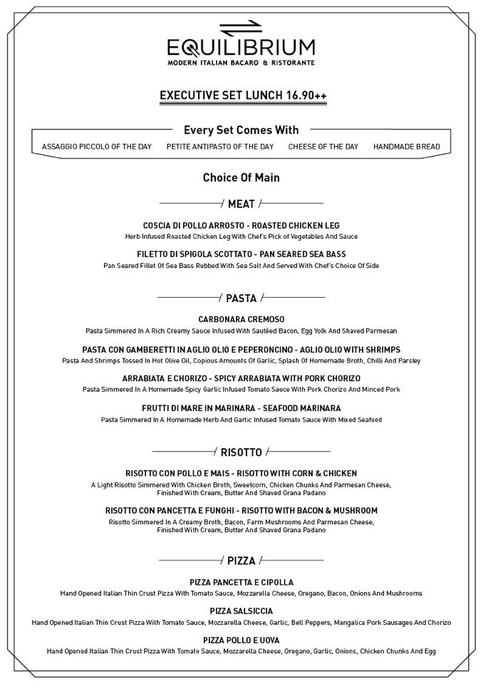 Equilibrium opens daily serving lunch from 11:30 am to 2:30 pm, and dinner from 6:00 pm until 10:30pm, with the bar serving drinks and snacks all day. Promotion highlights include weekday Executive Lunch Set Menu, and weekend Italian Brunch menu. Check on the Facebook Page for updates on special promotions.