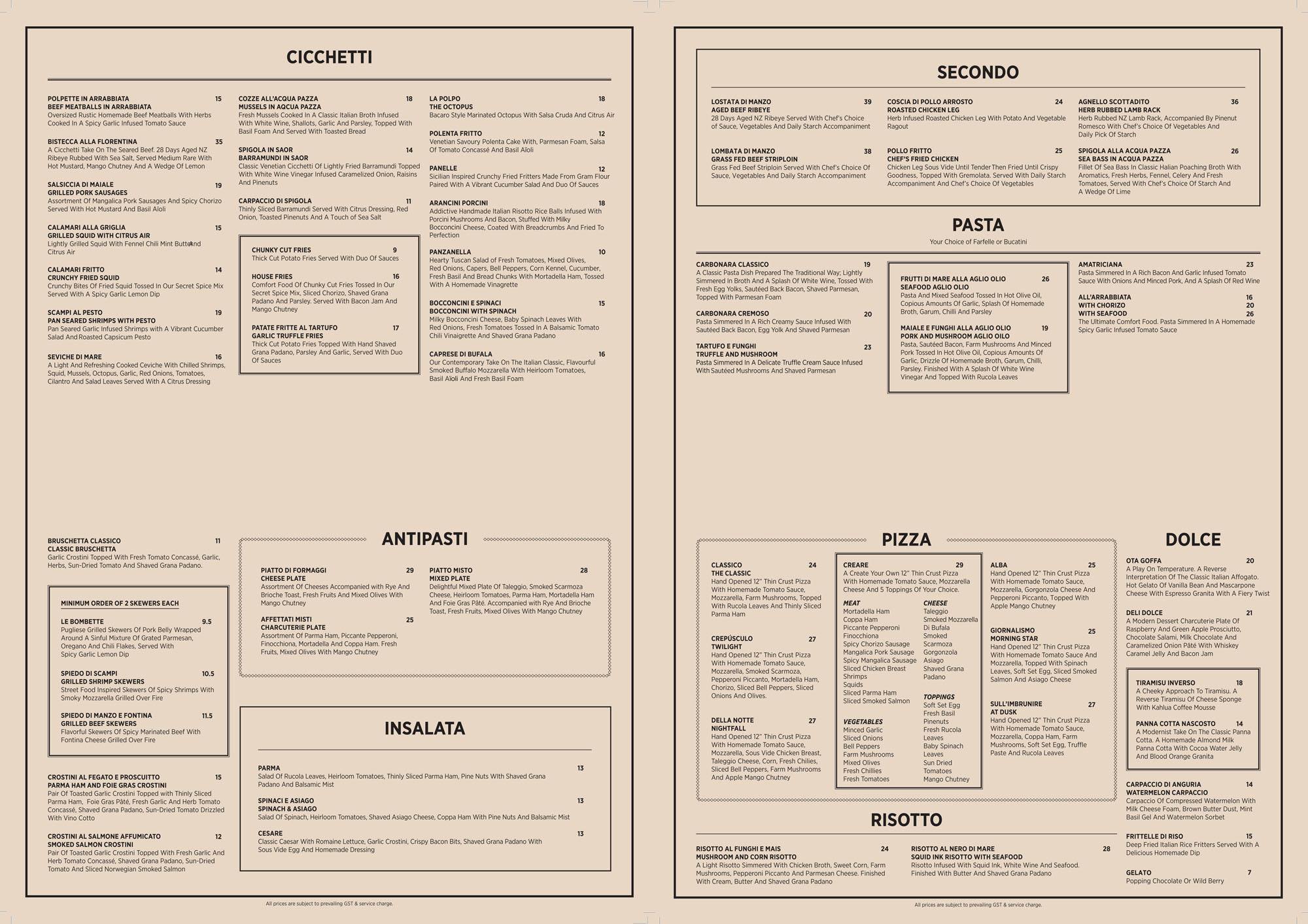 Cuisine Modern interpretations of Italian cuisine on the engaging menu include small plates serves of classic rustic dishes such as pastas and pizza elevated with gourmet ingredients and contemporary plating. Tempting desserts showcase some playful modern culinary techniques with the stand out example the Deli Dolce which presents as a charcuterie plate – yet reveals sweet flavours and unexpected textures.