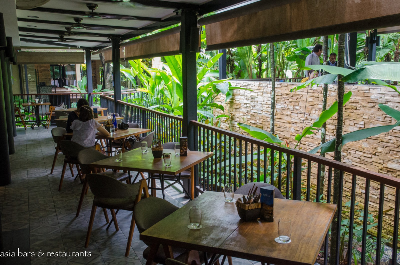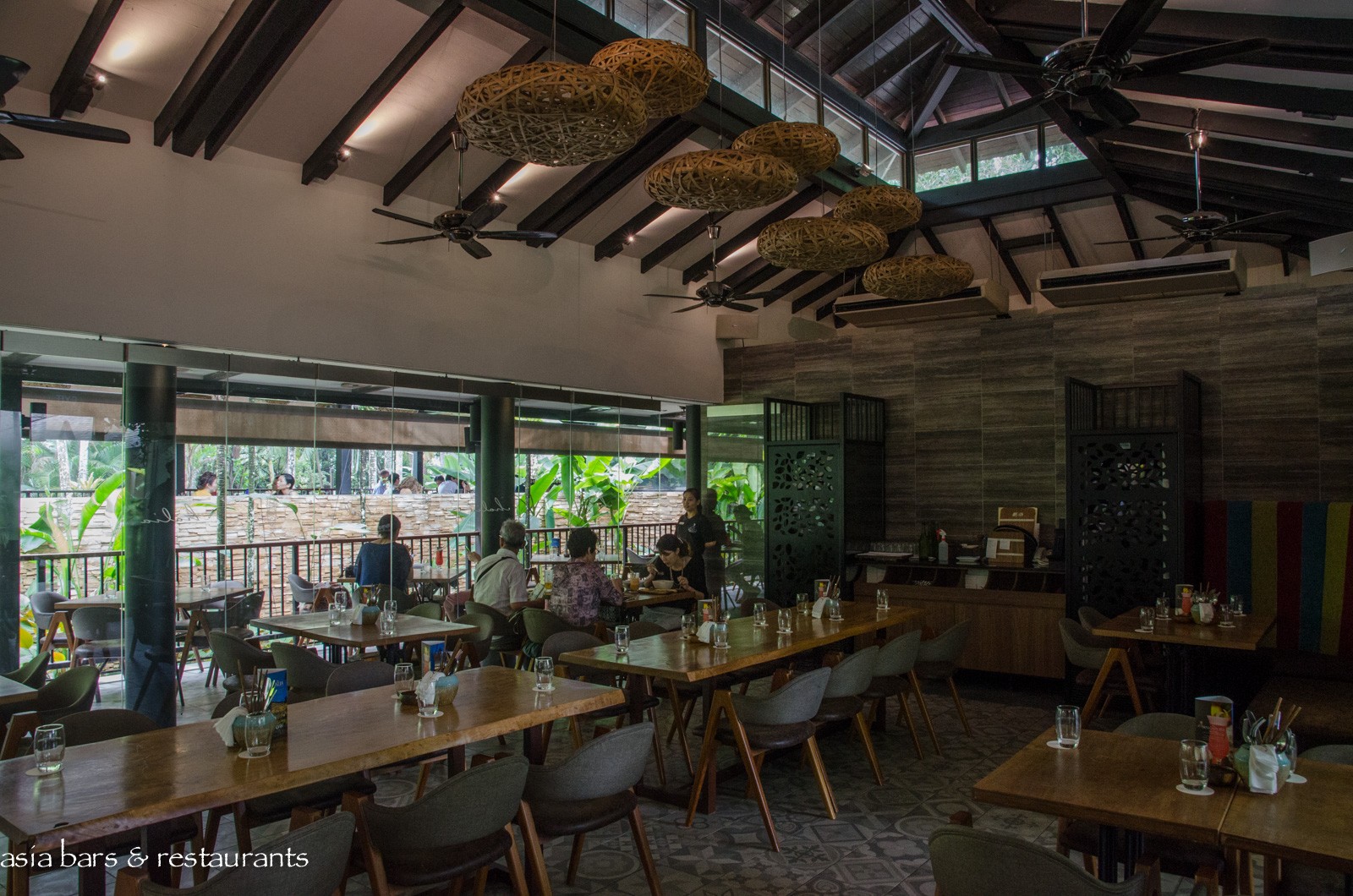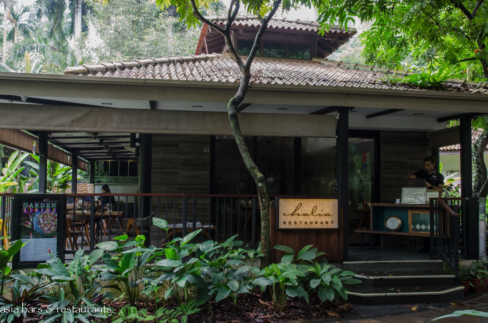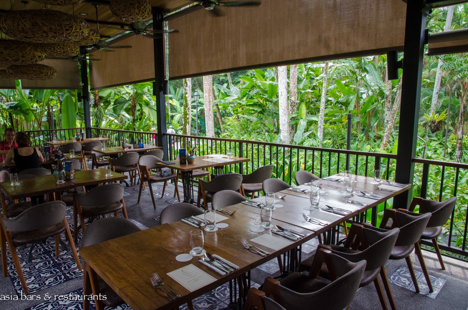 Decor The restaurant offers several dining spaces – the main indoor (air-conditioned) dining room with an attached open-air verandah- and adjacent – the separate viewing deck – a raised open-sided pavillion set within a garden bed. A revamped decor features natural tones and materials, with custom crafted wooden furniture and stone-faced walls blending harmoniously with the luxuriant garden setting. Woven lighting pendants reference birds nests, and the Peranakan- motif patterned tiled flooring evokes local heritage influences.