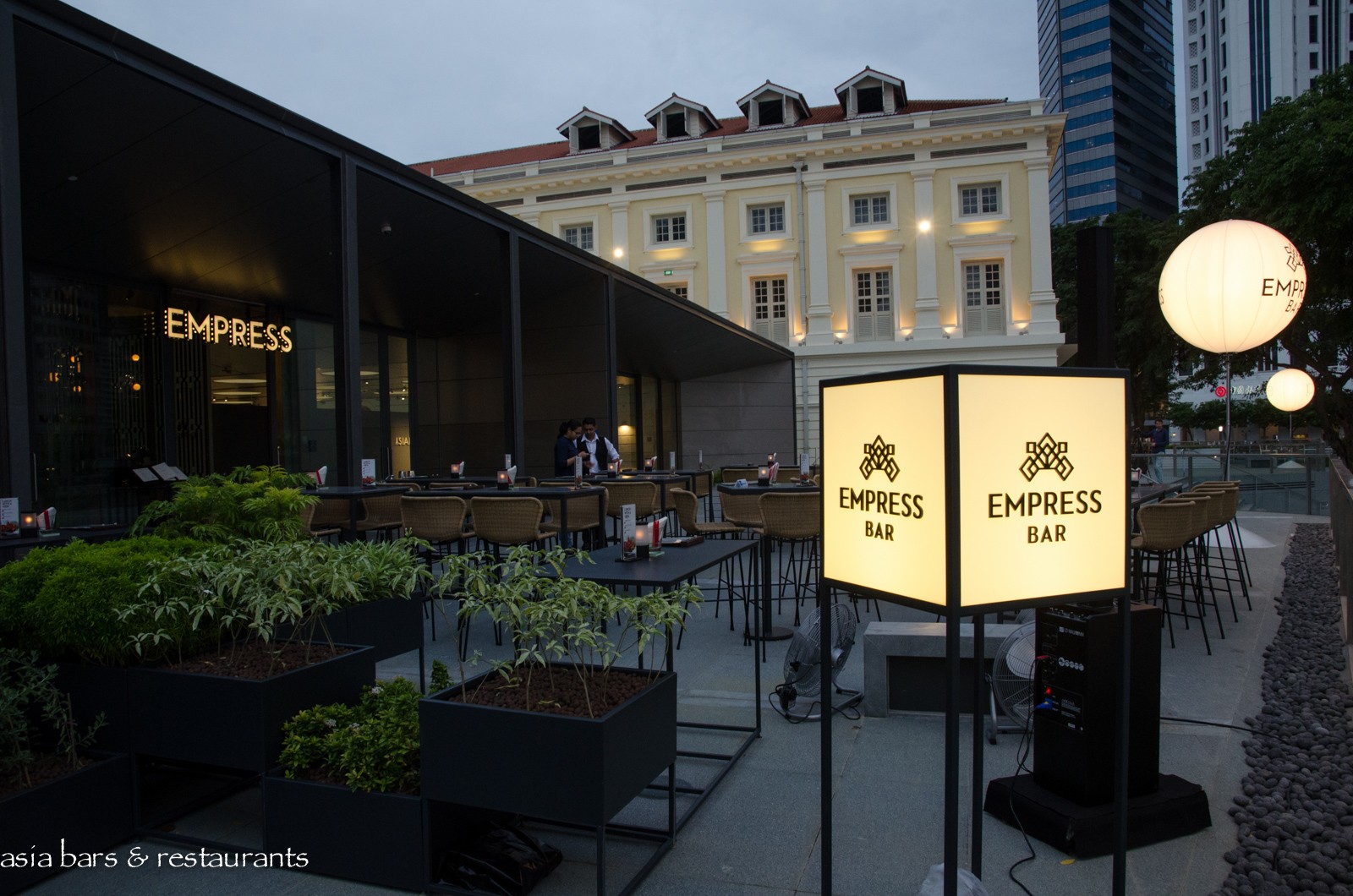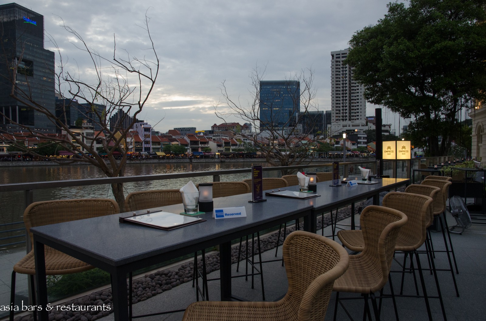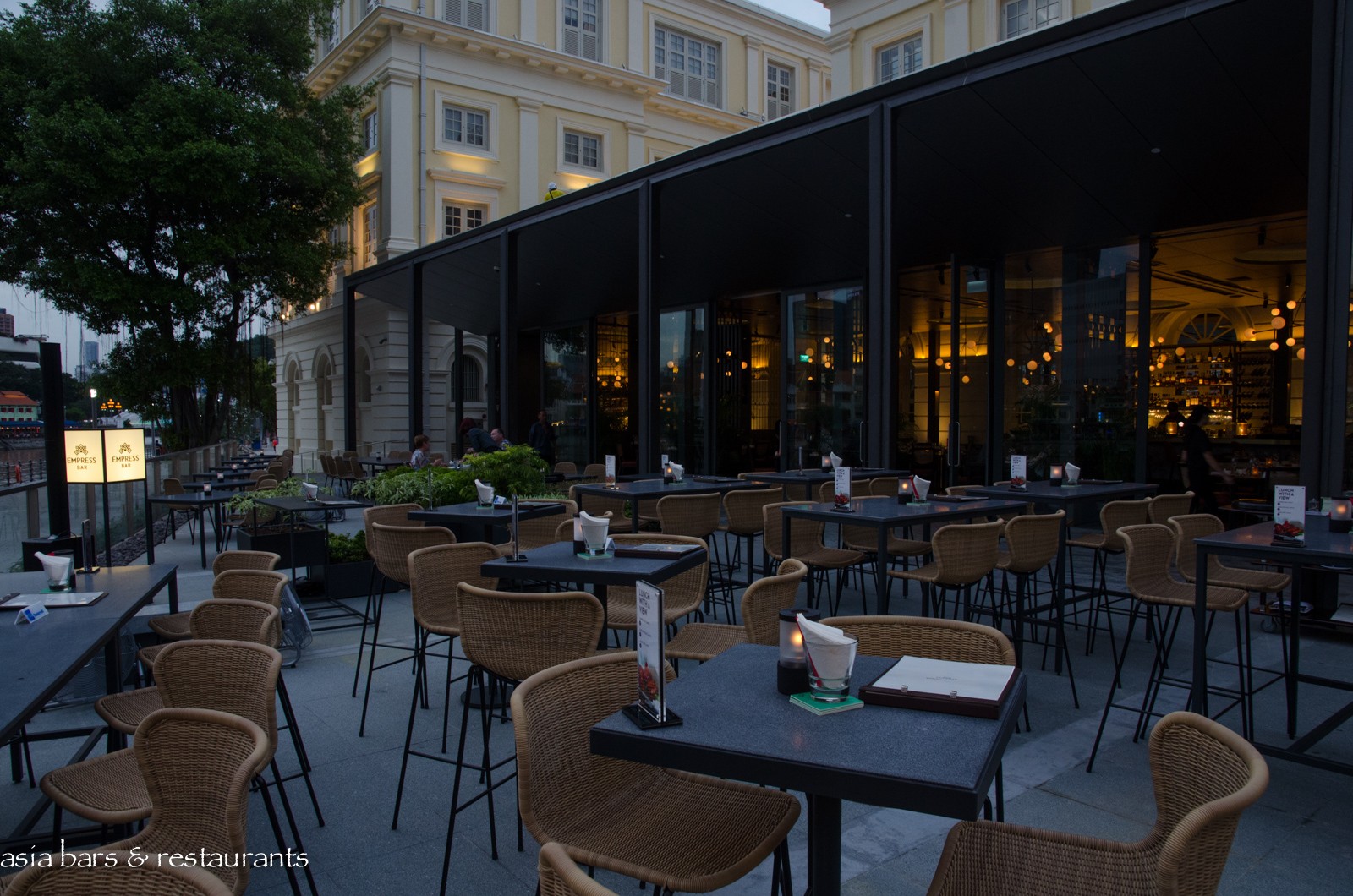 Design Taking cues from Singapore’s past, the interior space harmoniously combines Chinese references with an elegant contemporary decor. And on the outdoor terrace, the EMPRESS Bar offers high-table settings with a spectacular riverfront outlook, while an adjacent section of outdoor dining tables provides a casual dining option. In the main dining room, comfortably spaced dining tables extend across the high-ceilinged open-plan layout, while a handsome marble bar extends prominently across the back of the room. A discrete private dining space seats up to 14 diners – partially concealed behind traditional Chinese screens.