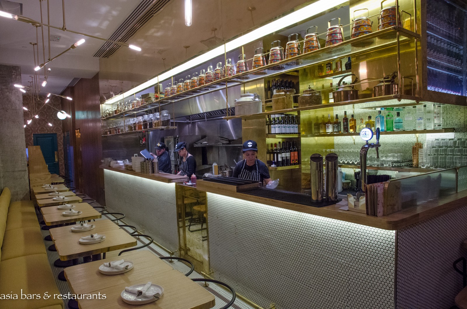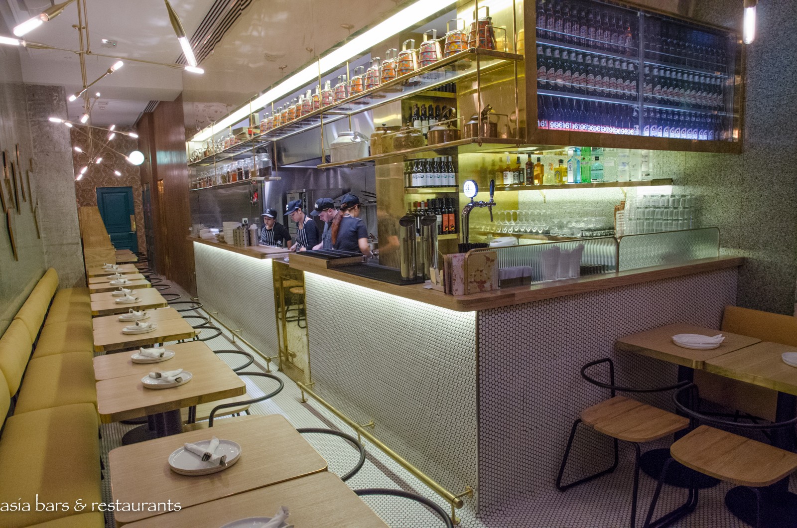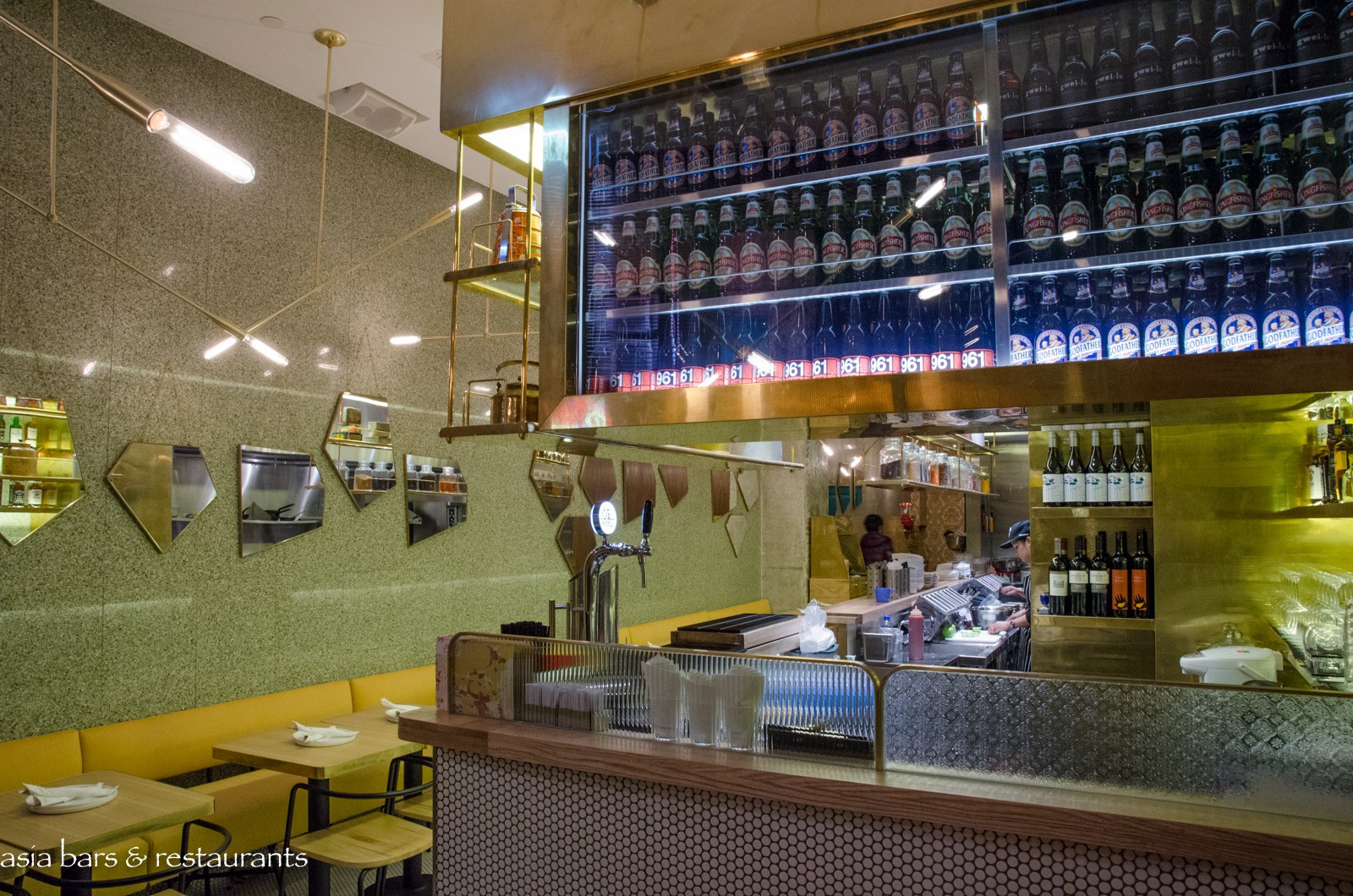 Design Taking its name from Mumbai’s famous Juhu Beach, know for its vibrant beachfront and street food stalls, the Hong Kong restaurant occupies a compact street level space in the lively SOHO dining and nightlife enclave. The narrow interior has been transformed by Californian design firm ID-entity Design into a fun dining space – with the gleaming stainless steel open kitchen extending across one side the centre of attention, while gold leather banquette settings opposite reference an American diner influence. Antique Indian tiffin boxes arrayed along shelves above the kitchen give a nod to the Indian culinary heritage.
