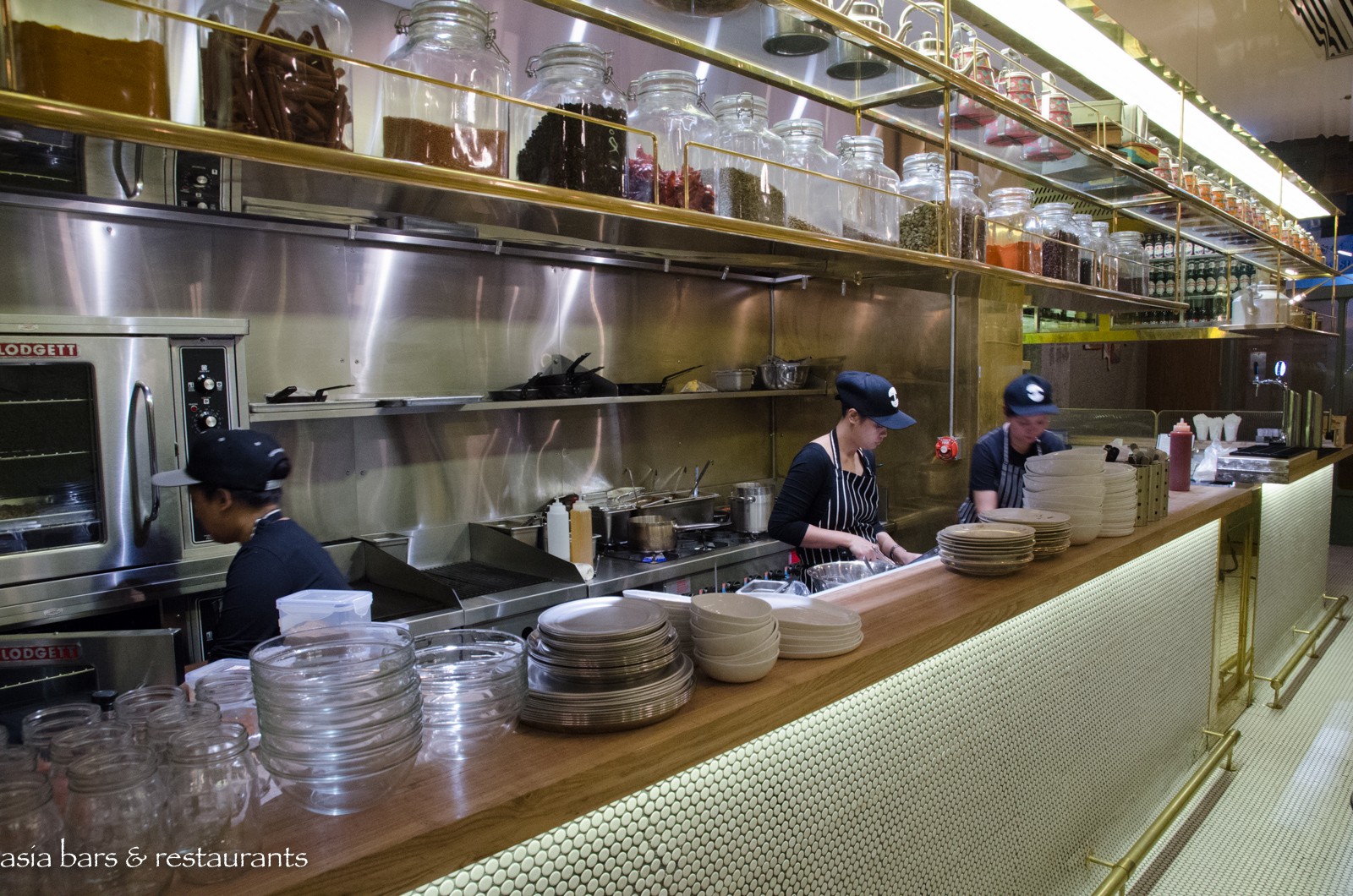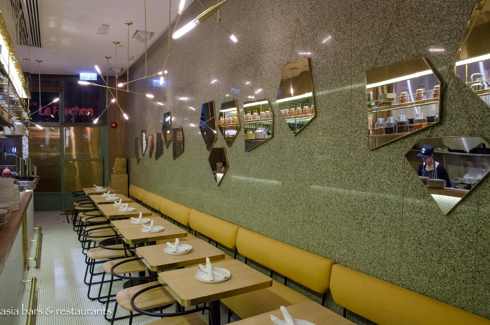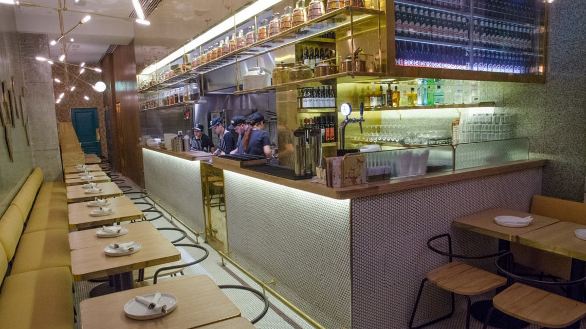 Design Taking its name from Mumbai’s famous Juhu Beach, know for its vibrant beachfront and street food stalls, the Hong Kong restaurant occupies a compact street level space in the lively SOHO dining and nightlife enclave. The narrow interior has been transformed by Californian design firm ID-entity Design into a fun dining space – with the gleaming stainless steel open kitchen extending across one side the centre of attention, while gold leather banquette settings opposite reference an American diner influence. Antique Indian tiffin boxes arrayed along shelves above the kitchen give a nod to the Indian culinary heritage.