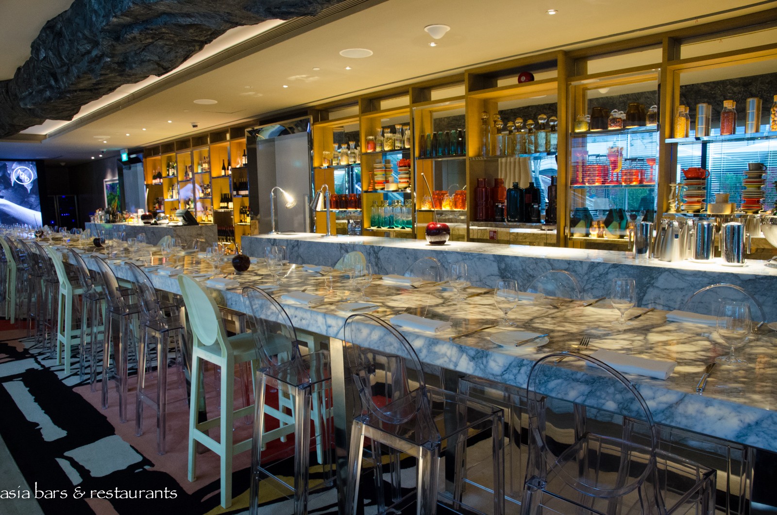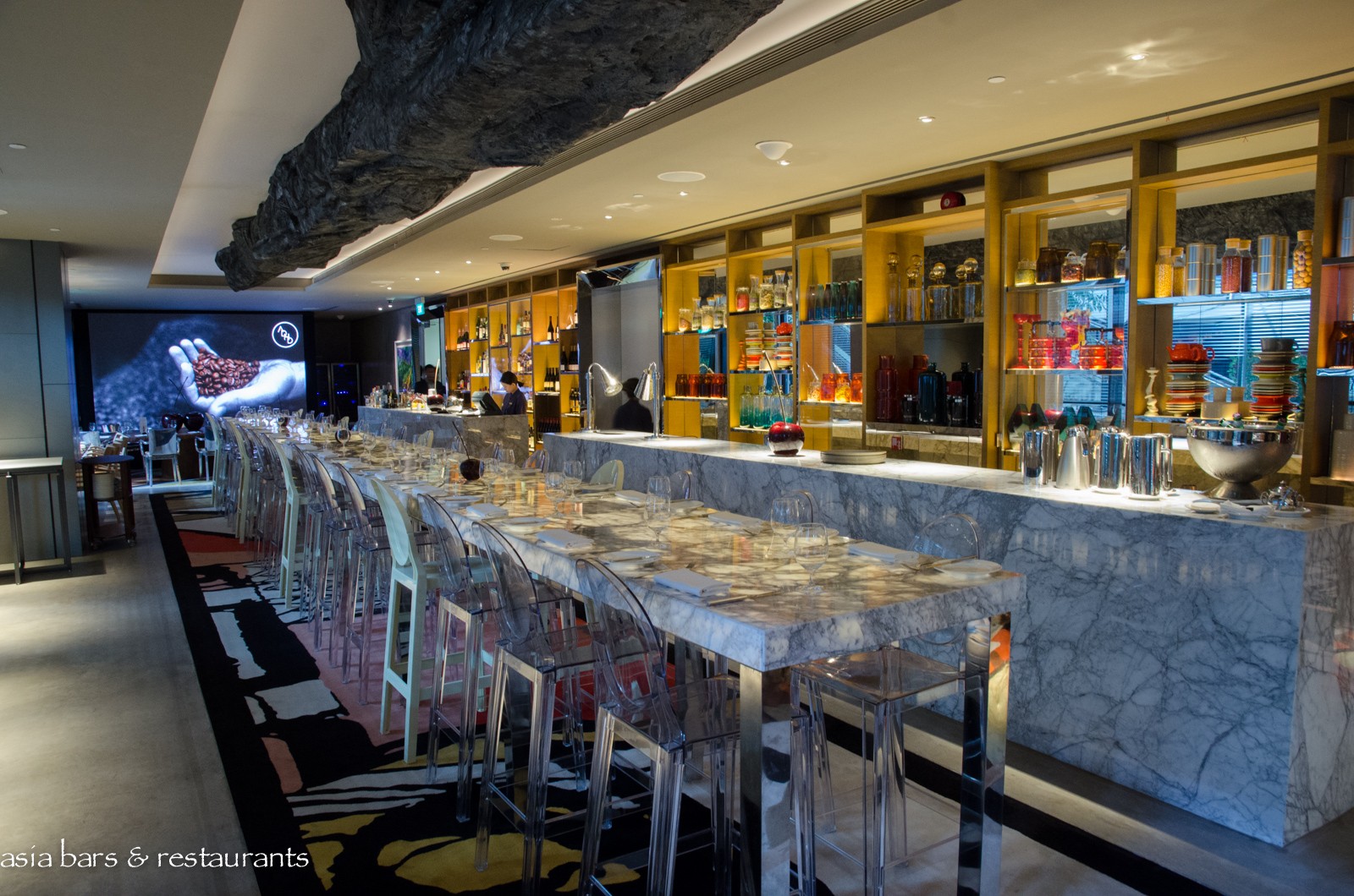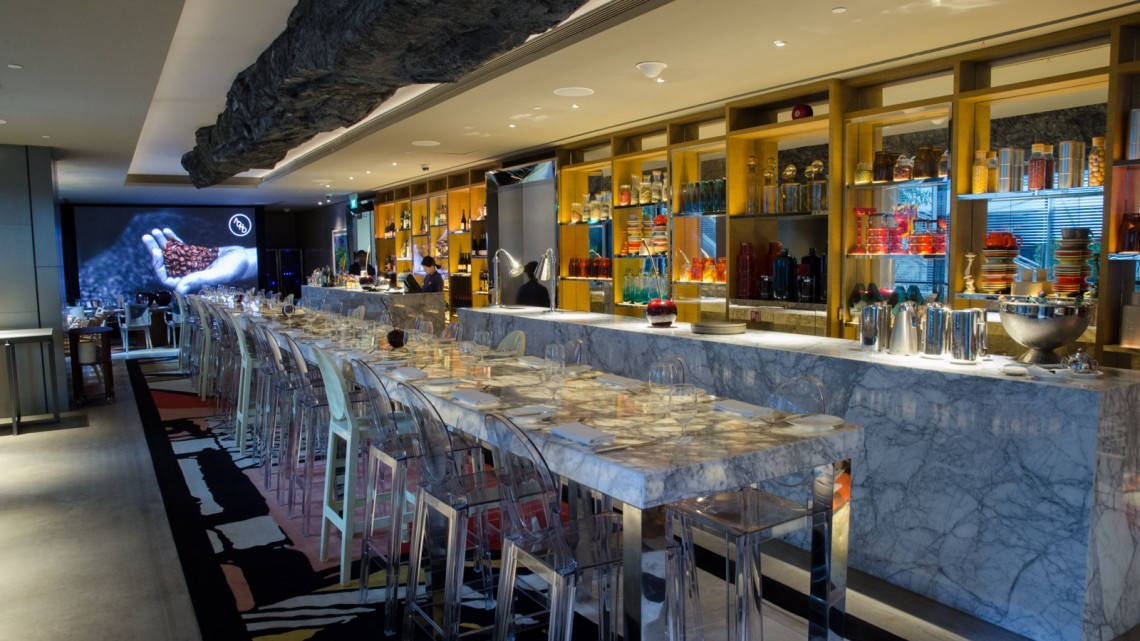 Design Designed with the ineffable swank that is synonymous with Philippe Starck’s idiosyncratic style, the striking ADHD interior is built on a muted palette of light natural tones, overlaid with expansive deployments of grey marble, stainless steel, blond timbers and camel-coloured leather furnishings, and embellished with vibrant splashes of bright red and orange elements. Within the spacious room, dining spaces include the centrepiece long white marble communal table – replete with Philippe Starck’s iconic Ghost chairs – an adjacent massive freeform timber slab table, while both indoor tables and an open-air terrace offer further seating options.