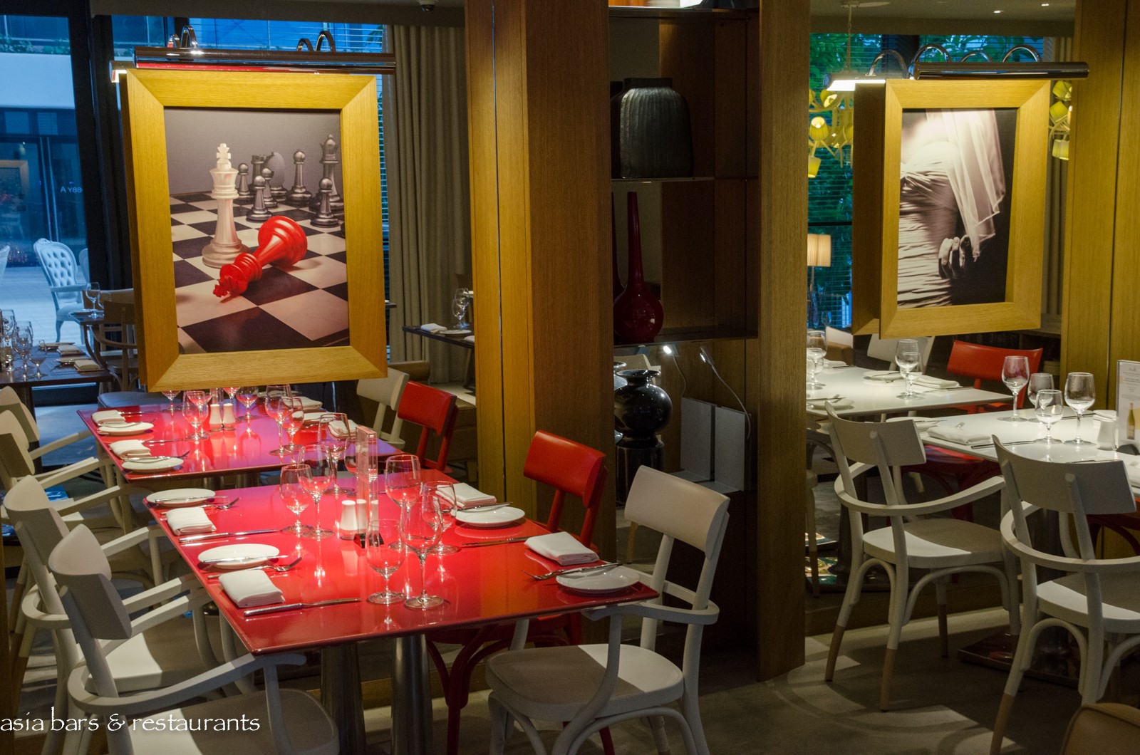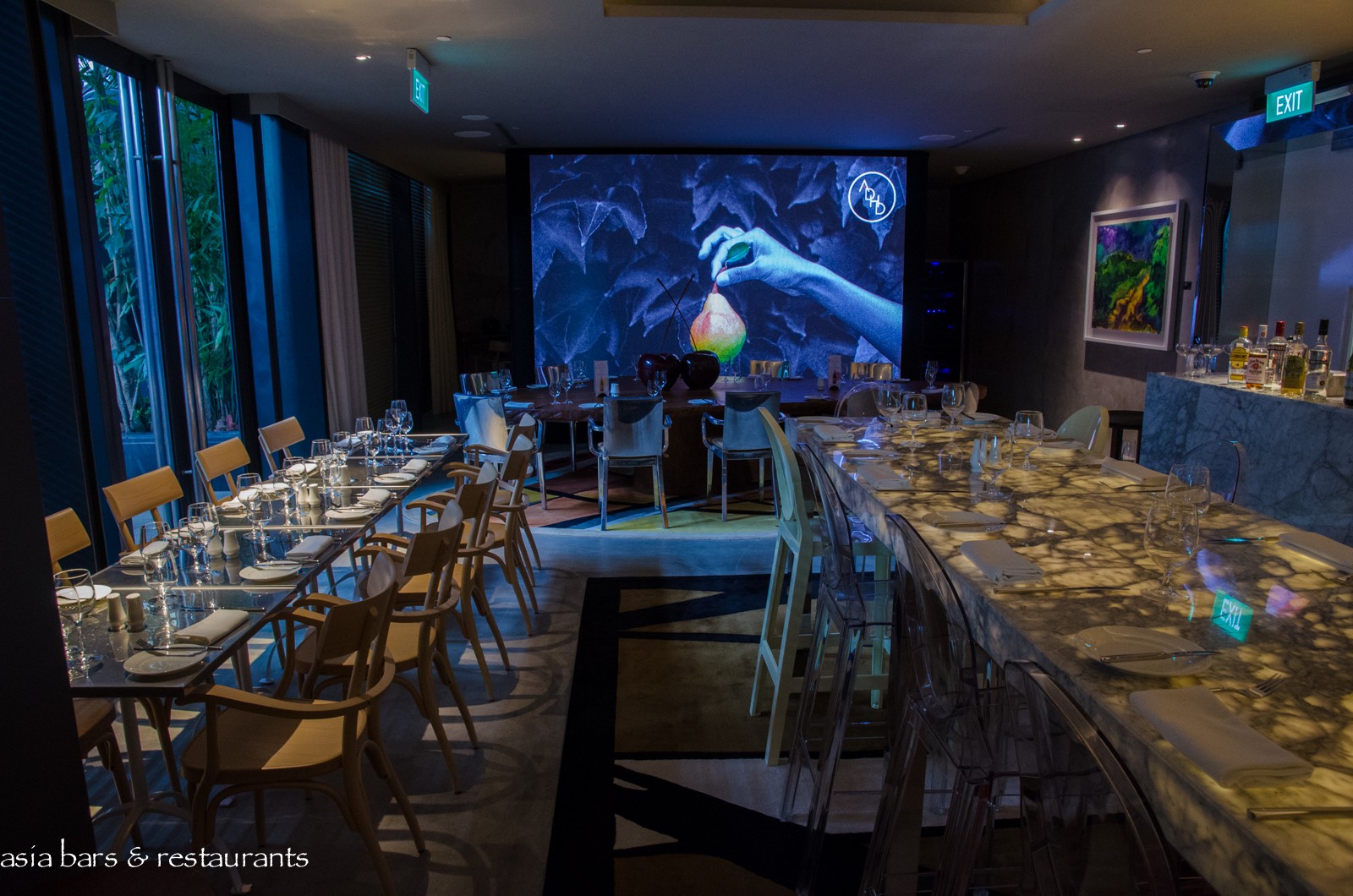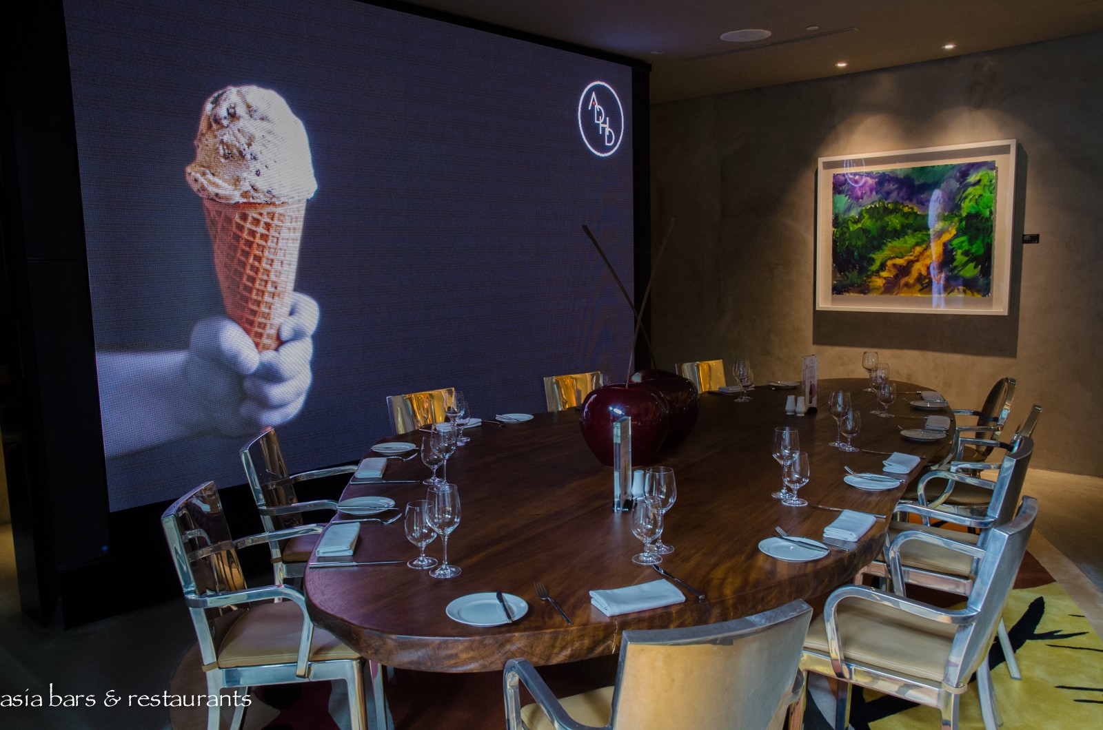 Design Designed with the ineffable swank that is synonymous with Philippe Starck’s idiosyncratic style, the striking ADHD interior is built on a muted palette of light natural tones, overlaid with expansive deployments of grey marble, stainless steel, blond timbers and camel-coloured leather furnishings, and embellished with vibrant splashes of bright red and orange elements. Within the spacious room, dining spaces include the centrepiece long white marble communal table – replete with Philippe Starck’s iconic Ghost chairs – an adjacent massive freeform timber slab table, while both indoor tables and an open-air terrace offer further seating options.