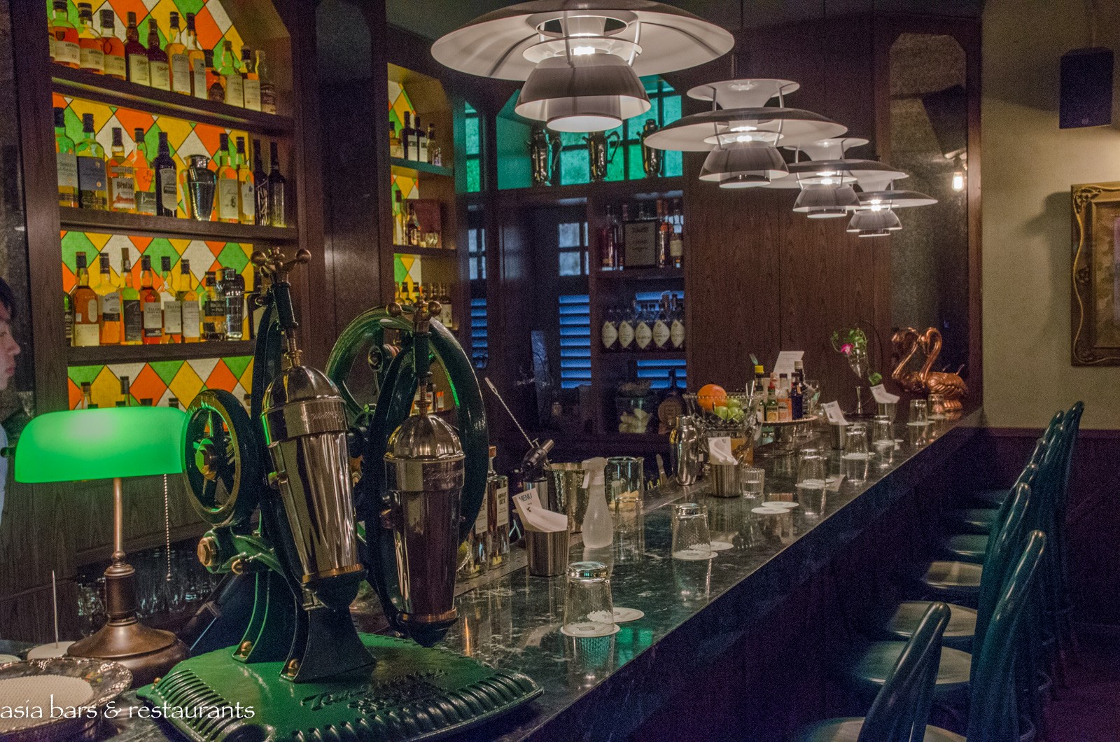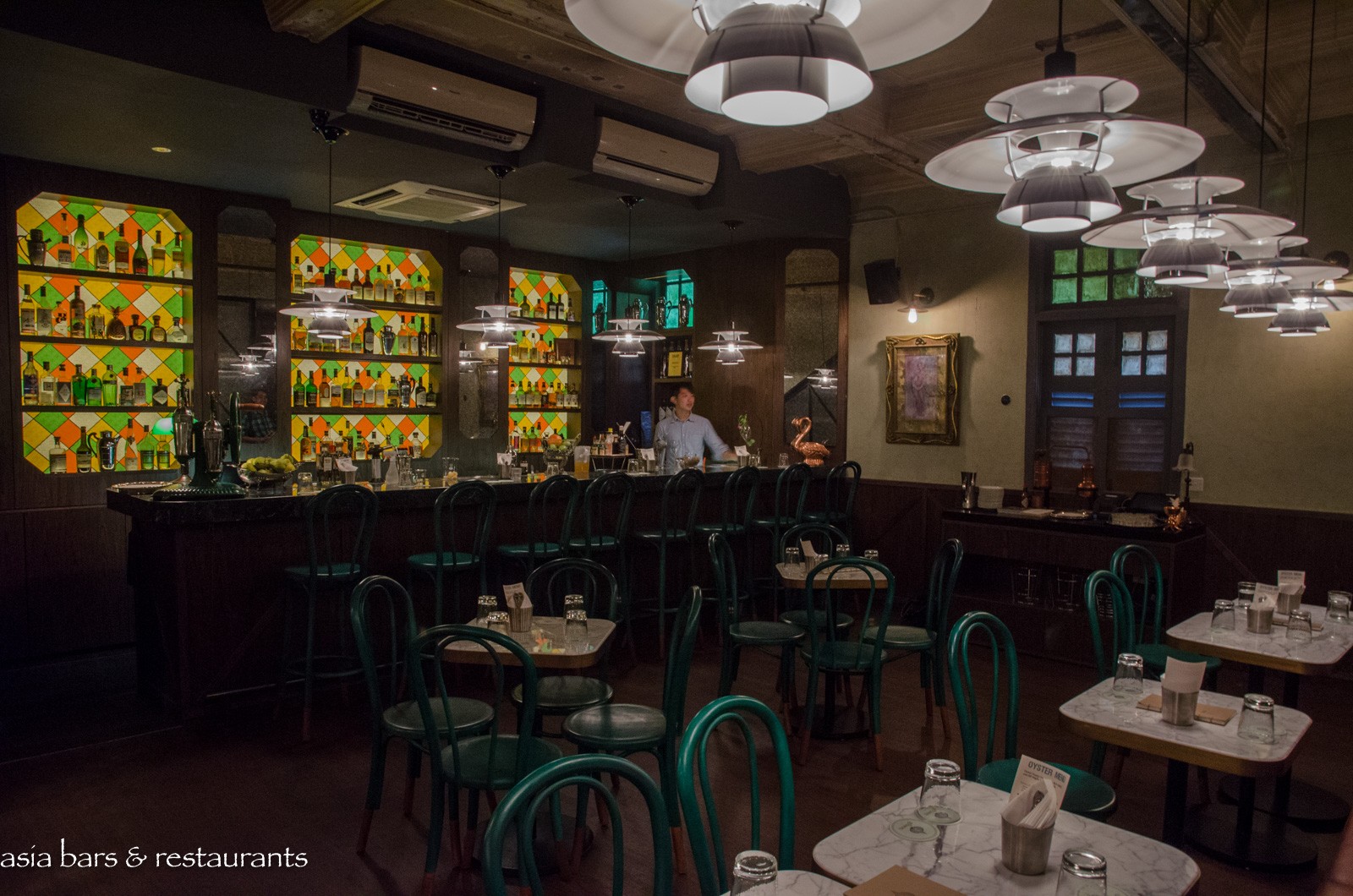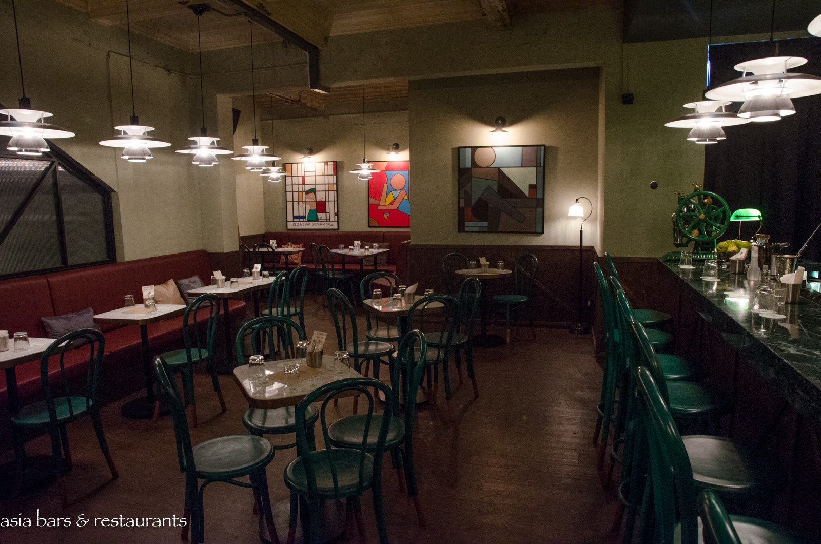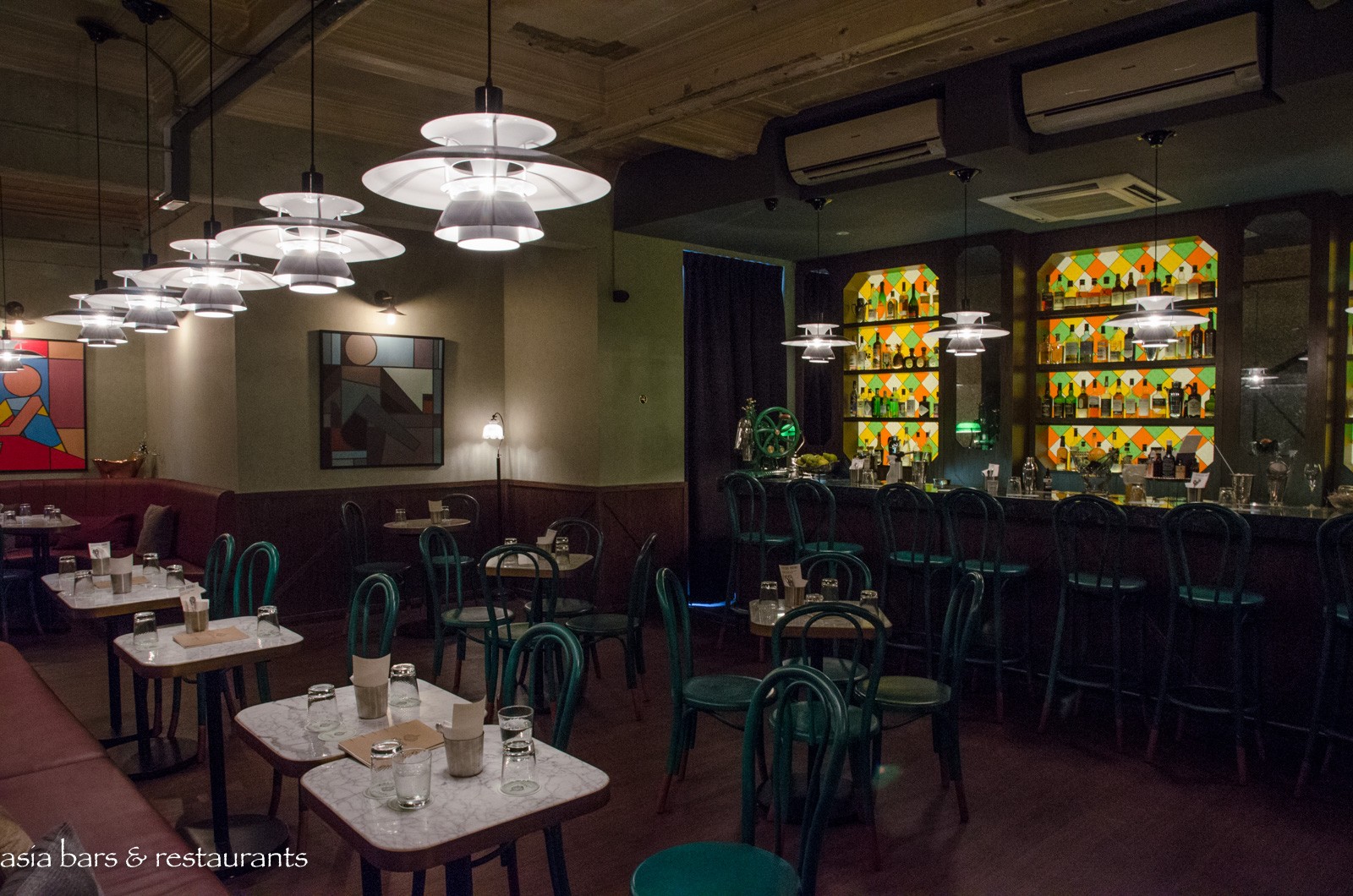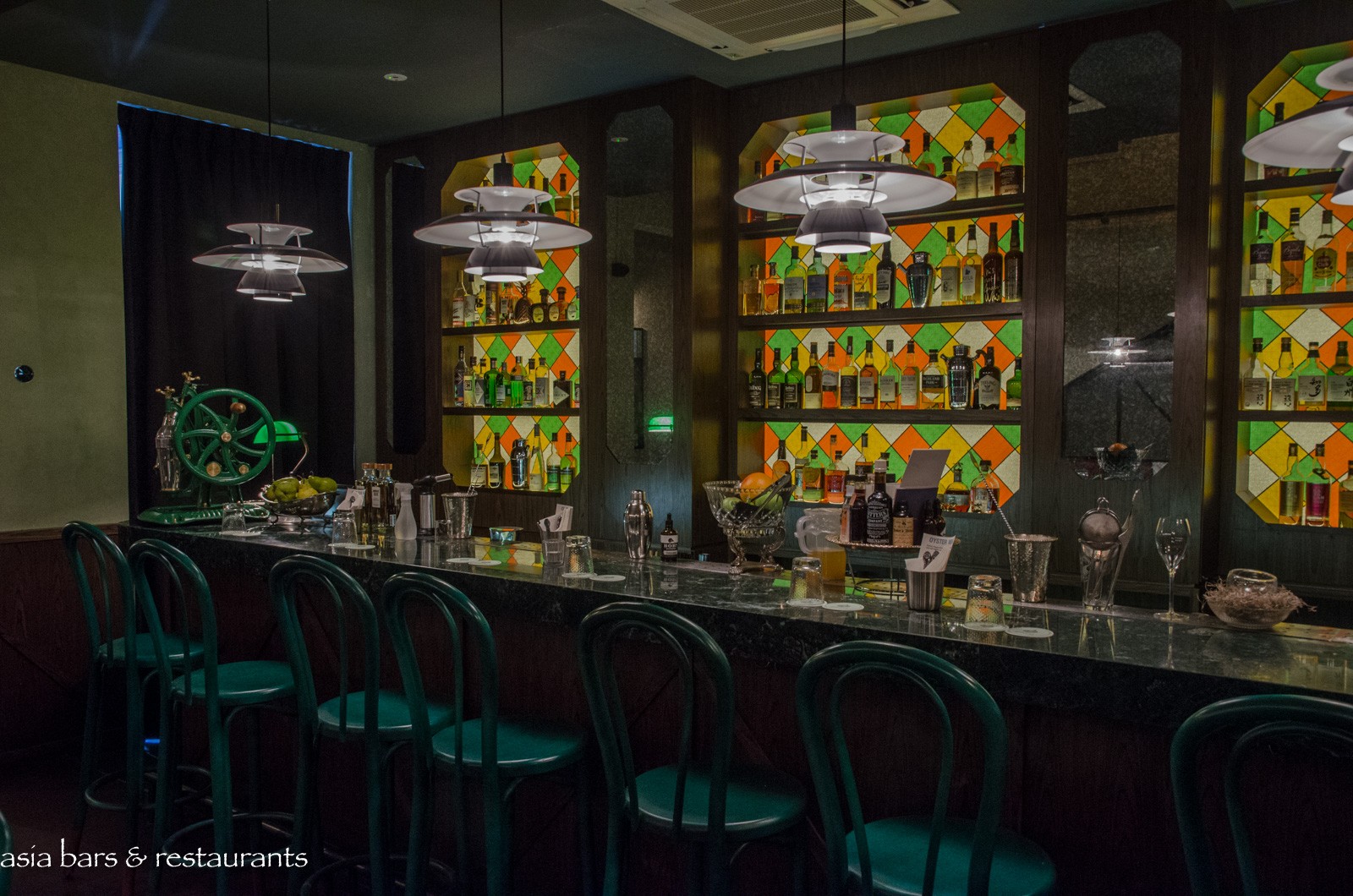 Design Ascending from the discrete street level entrance of an early 20th Century Chinese clan house building, a dimly lighted internal concrete stairway delivers guests to the compact 2nd-floor bar space. The pared-back interior palette of rendered concrete walls and ceilings, and unpolished timber floors is furnished with a handsome green marble-topped bar counter – matched with vintage green timber bar chairs – while red leather banquettes and marble-top tables conjure the sophistication of a bygone era. Retro lighting fixtures together with the multicoloured stained-glass panels of the back bar reference the building’s heritage, with vintage glassware and cocktail paraphernalia contributing period authenticity.