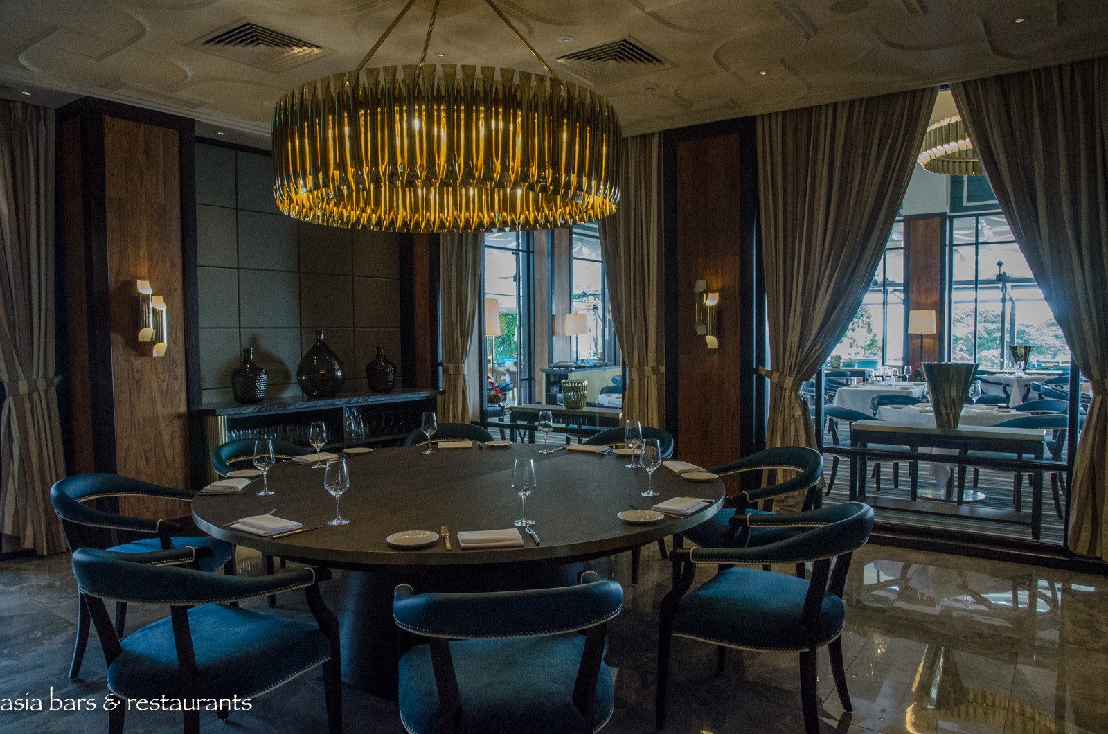 Design The restaurant comprises a high-ceilinged indoor main dining room with full height glass on three sides that capture the views and garden setting. A contemporary decor features a warm palette with brass and timber accents, and together with the white linen-topped tables, turquoise upholstered chairs, and plush carpets epitomise the sophisticated dining environment. Two generously sized luxurious private dining rooms are popular choices for corporate dinners and private entertaining. And expansive outdoor terraces, covered for all-weather comfort, offer a more casual atmosphere for drinks and snacks, and relaxed dining with picturesque views.