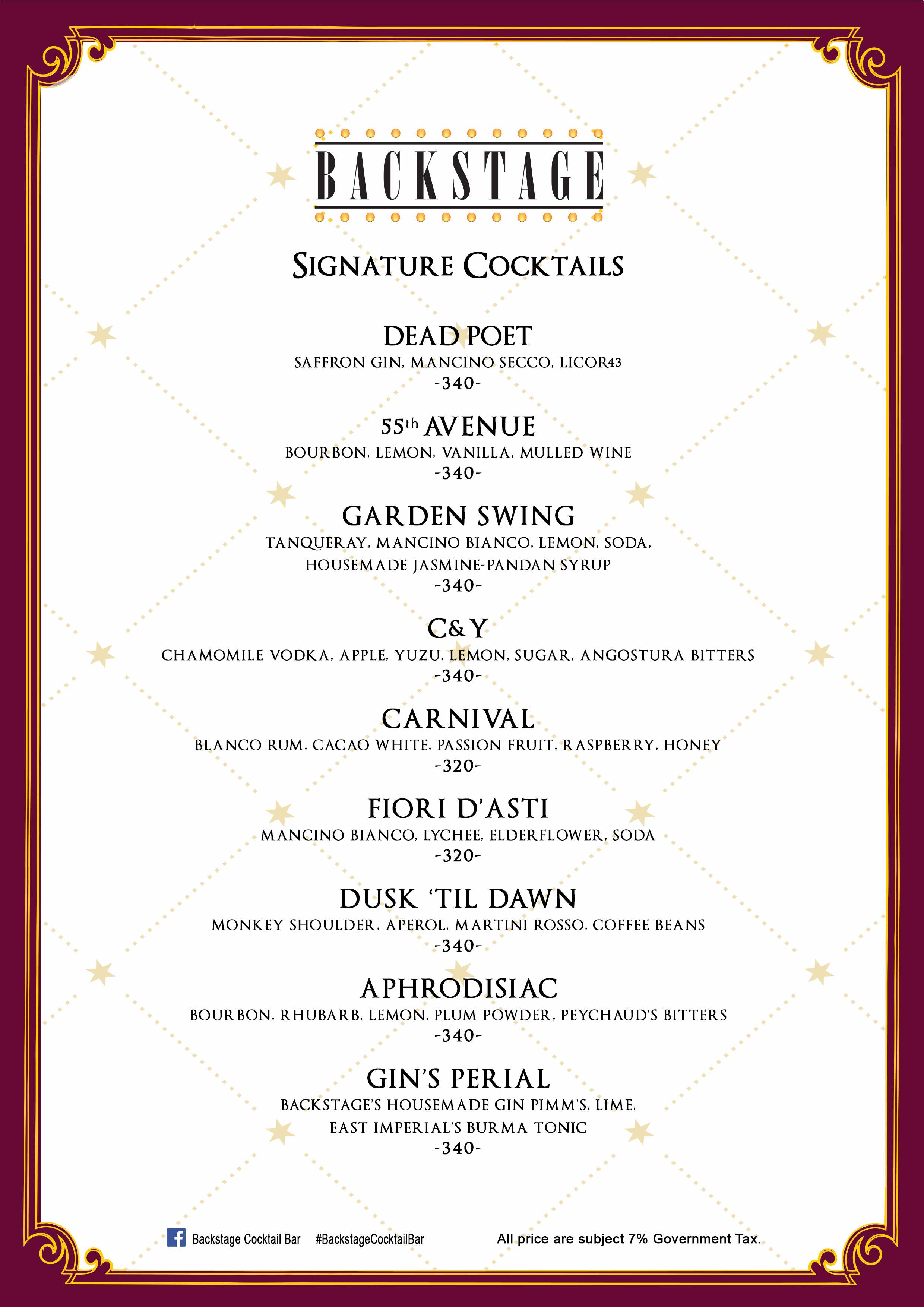 Cocktails Showcasing their well-credentialed mixology skills, the Backstage team have created a signature collection of sophisticated cocktails made with premium spirit infusions and advanced techniques – appropriately served in exquisite crystal cut glassware. Referencing Thai culinary flavour profiles, fresh seasonal ingredients are incorporated into the concise selection of Backstage Signature Cocktails – exemplified by the SIAMESE WISE RICE – made with Ketel One Vodka, fennel, momemade rice water, pandan syrup, lime, Thai sweet chili oil, and rice powder. In addition to offering reinterpreted classic cocktails with creative twists, the bartenders are also adept at creating bespoke cocktails.