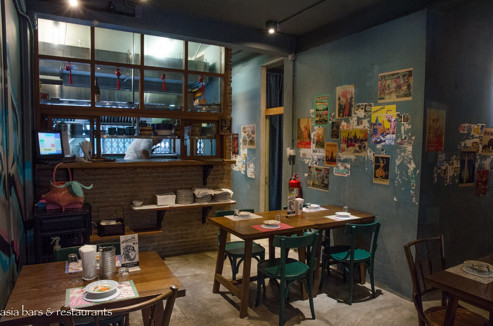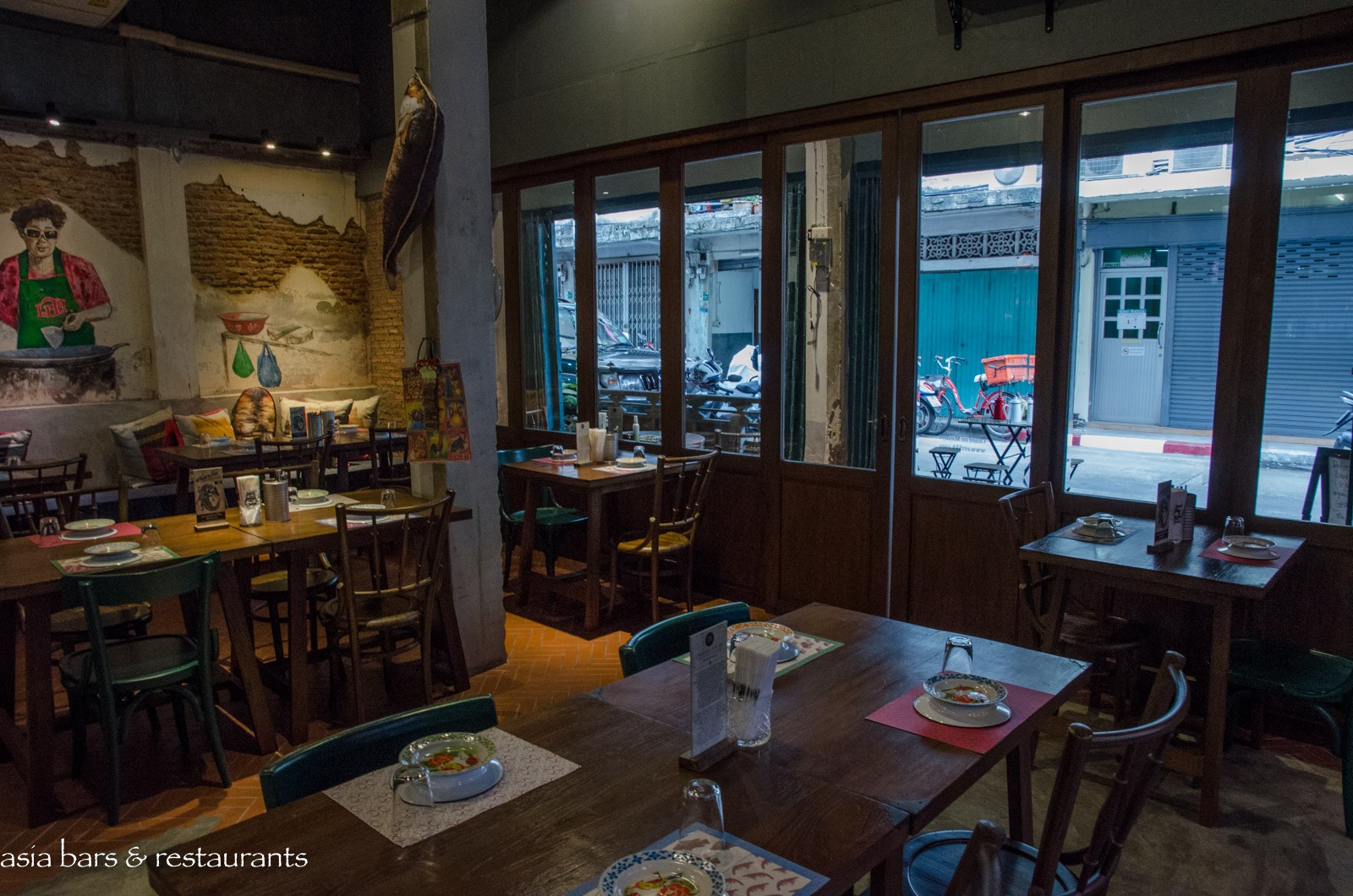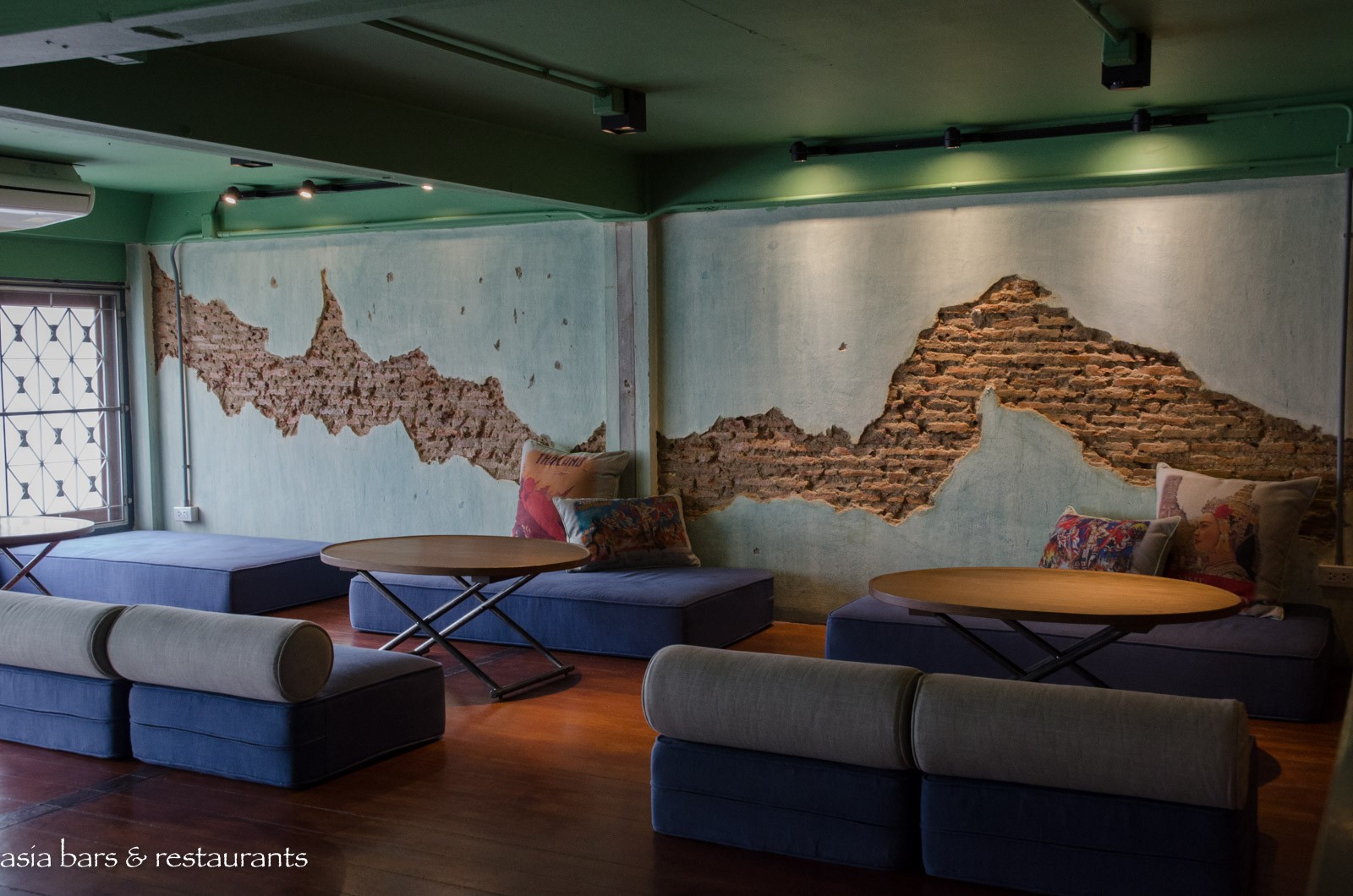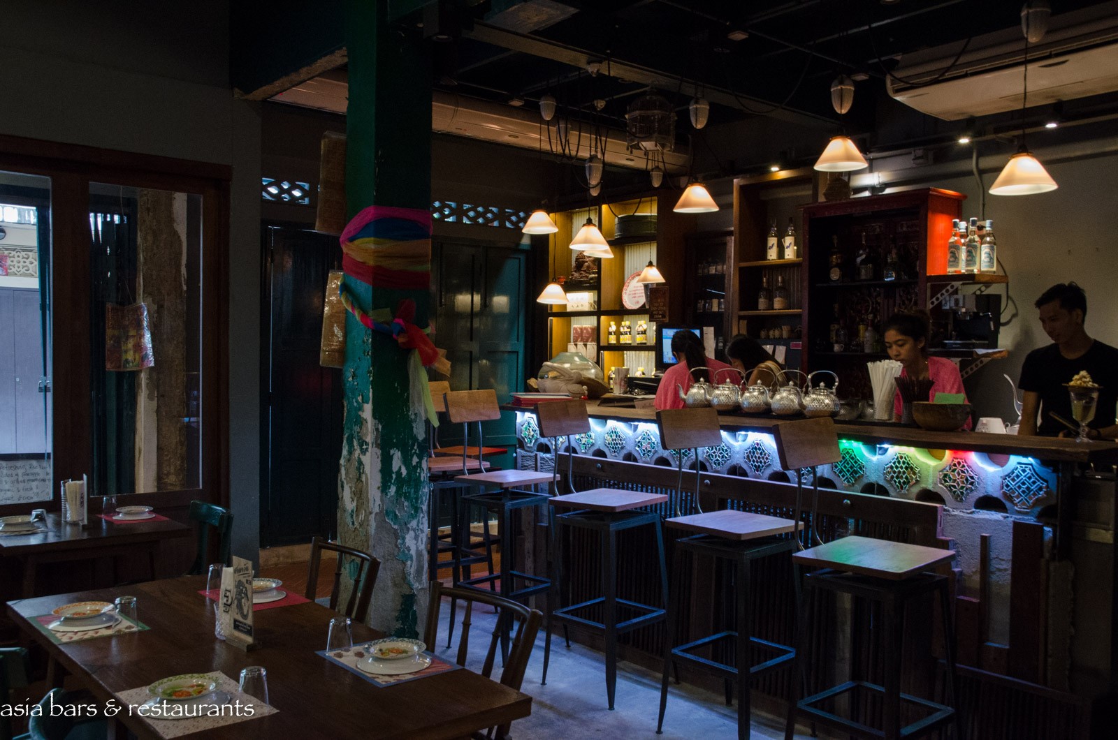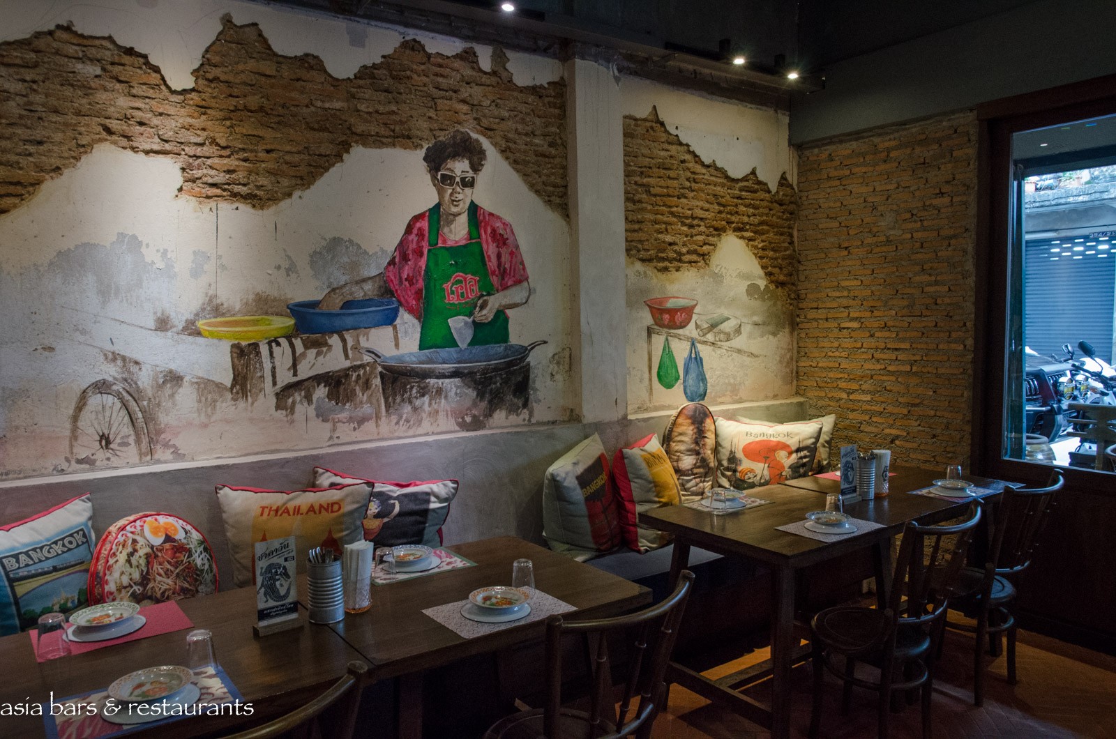 Design Original sliding metal grilles fold back to reveal the timber façade, while inside the front dining and bar spaces adjoin a partially open kitchen at the rear. The rustic-chic décor comprises concrete and tiled flooring, exposed red brick walls with peeled-back plaster, and simple dining timber tables and chairs. Retro-Thai touches include a colorful mural, plus an eclectic assemblage of vintage Thai accoutrements. An upper-level section includes additional table settings as well as old-style floor cushion seating.