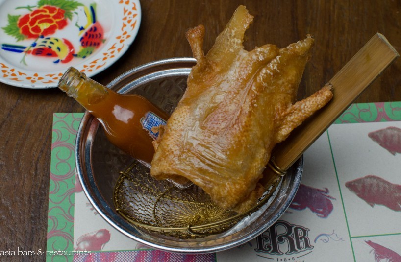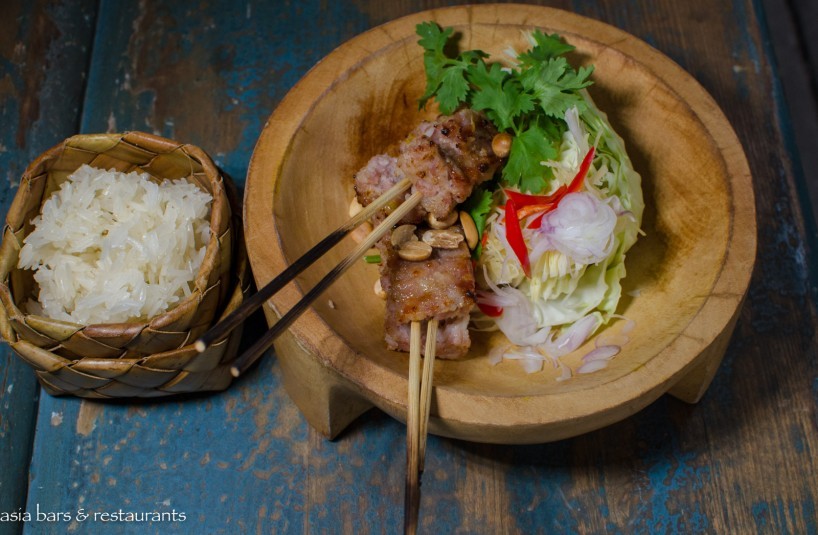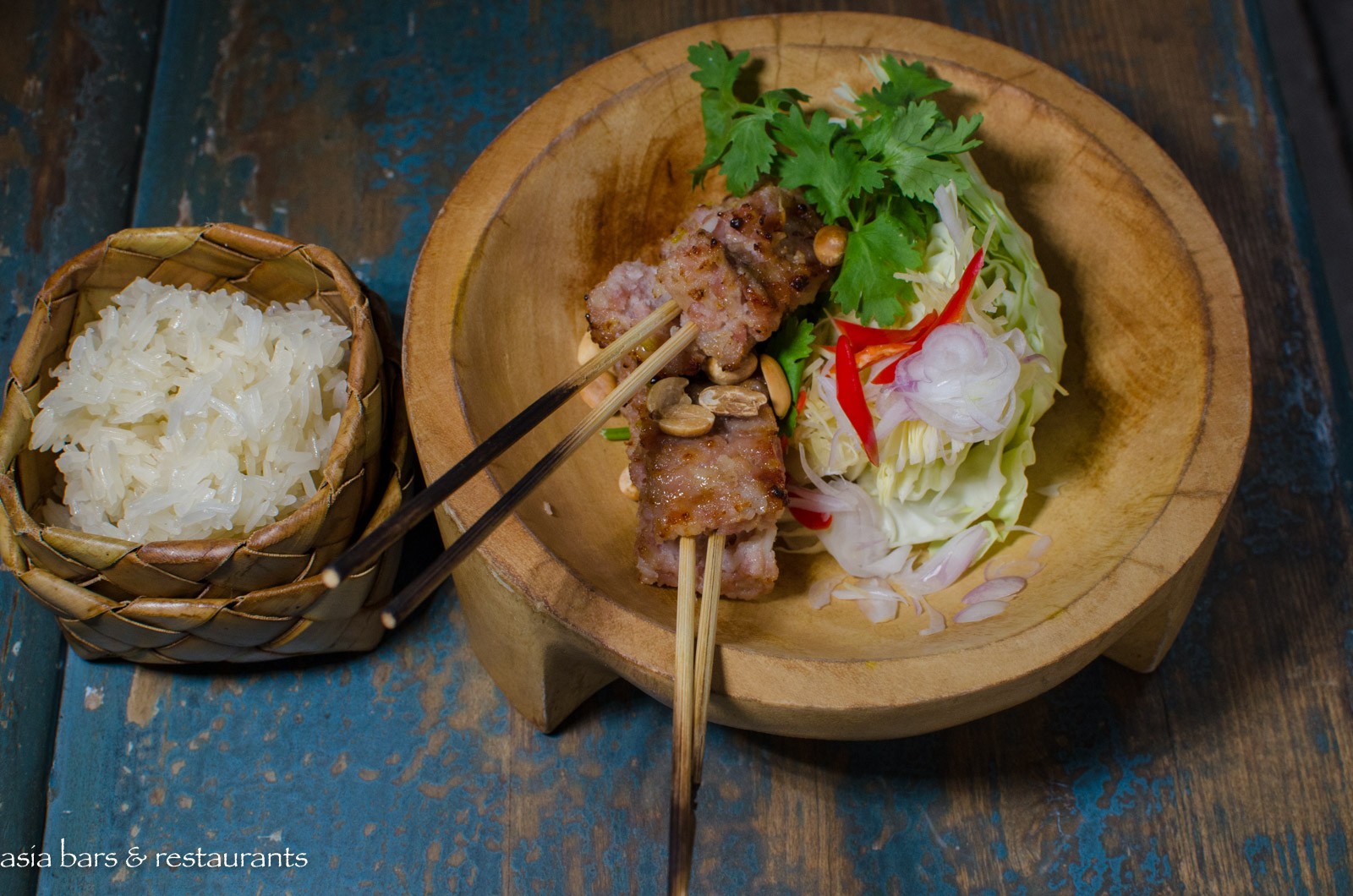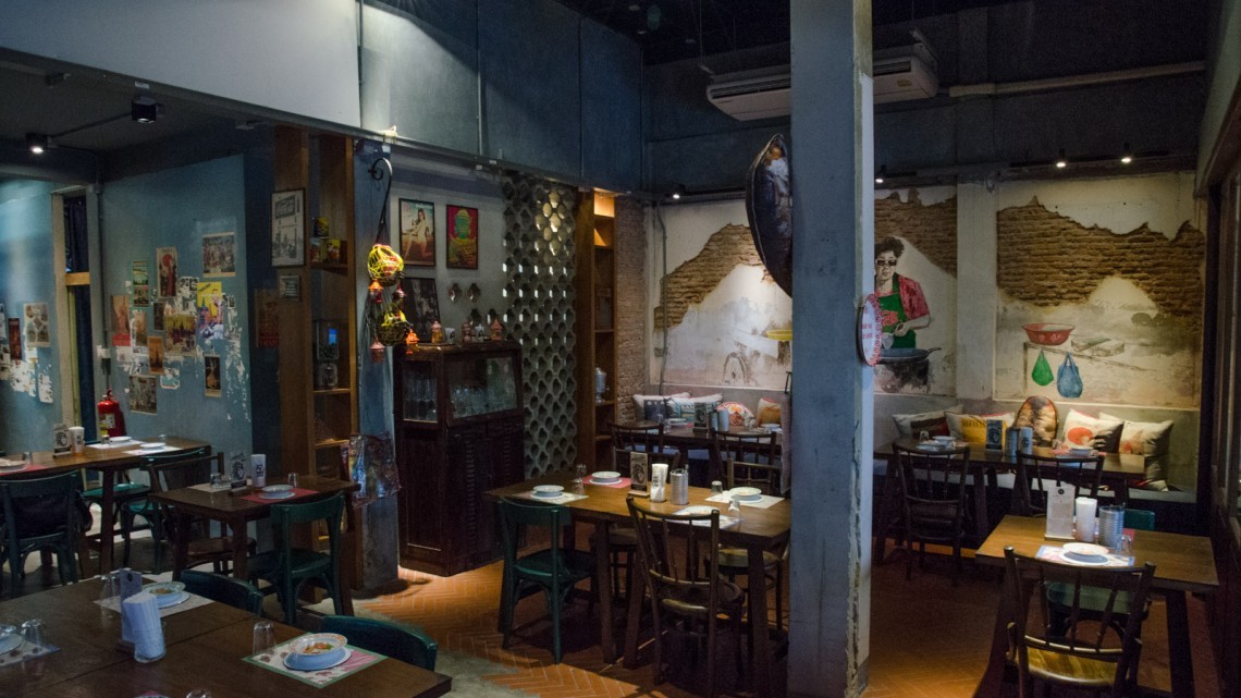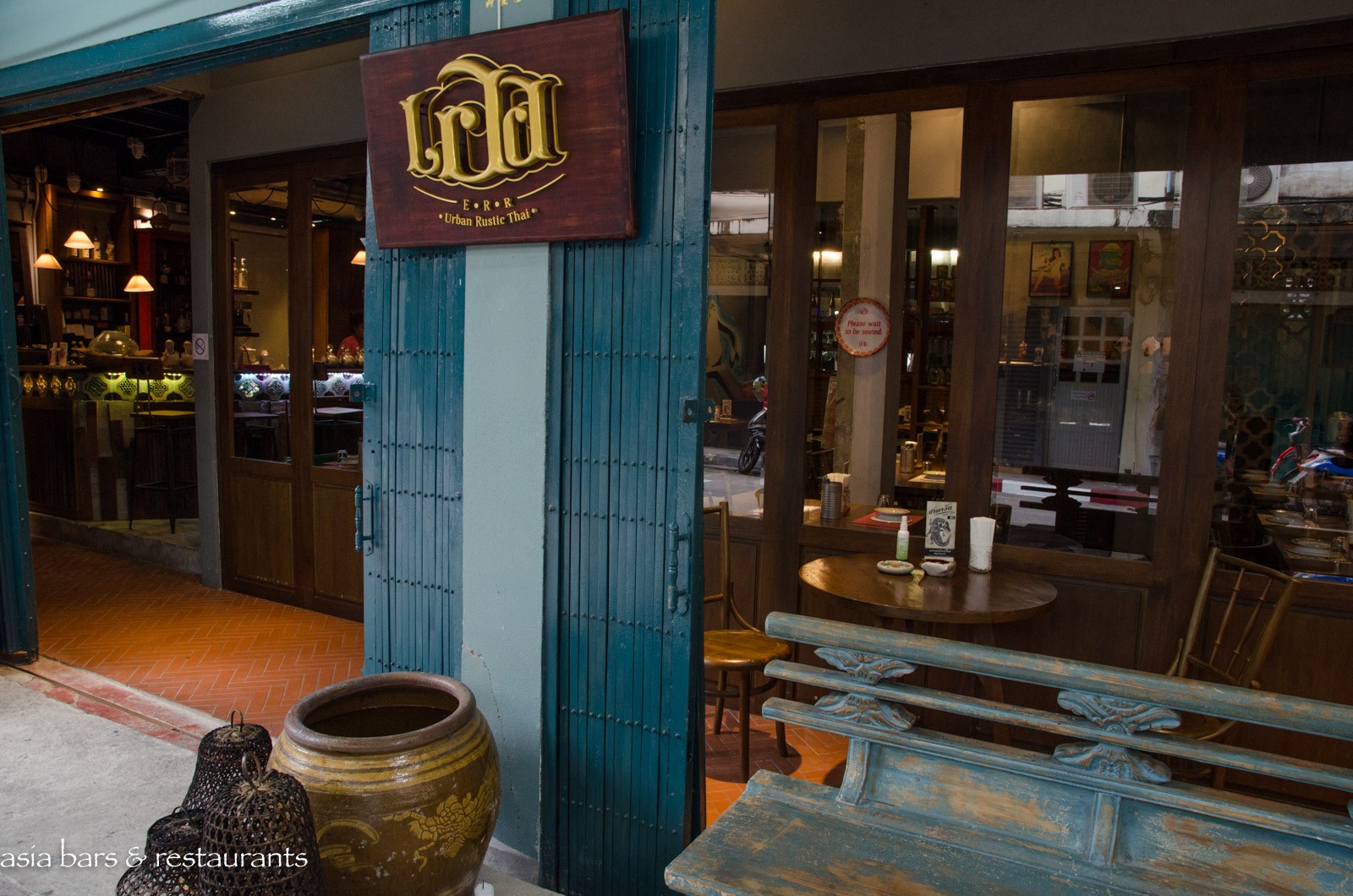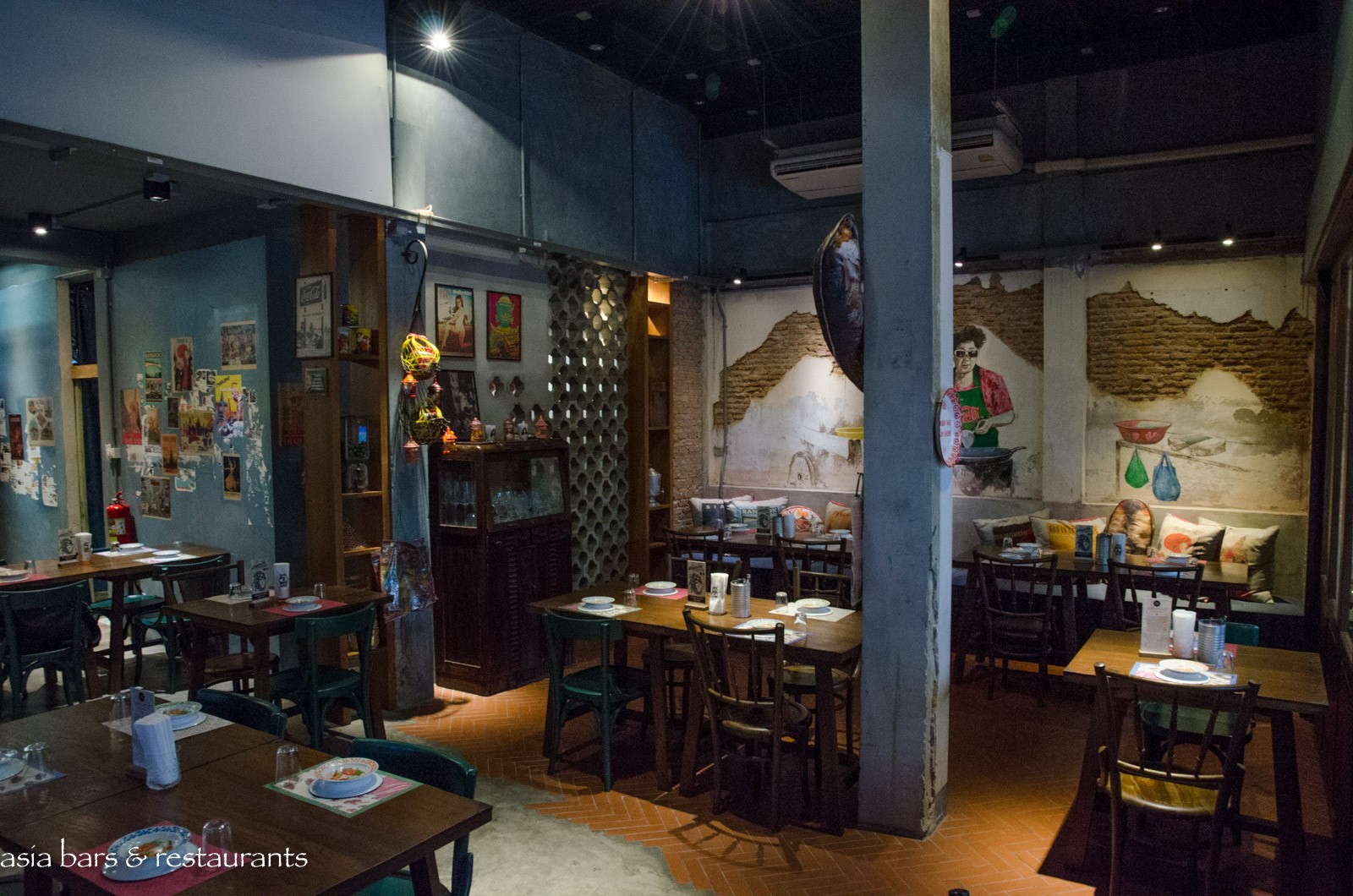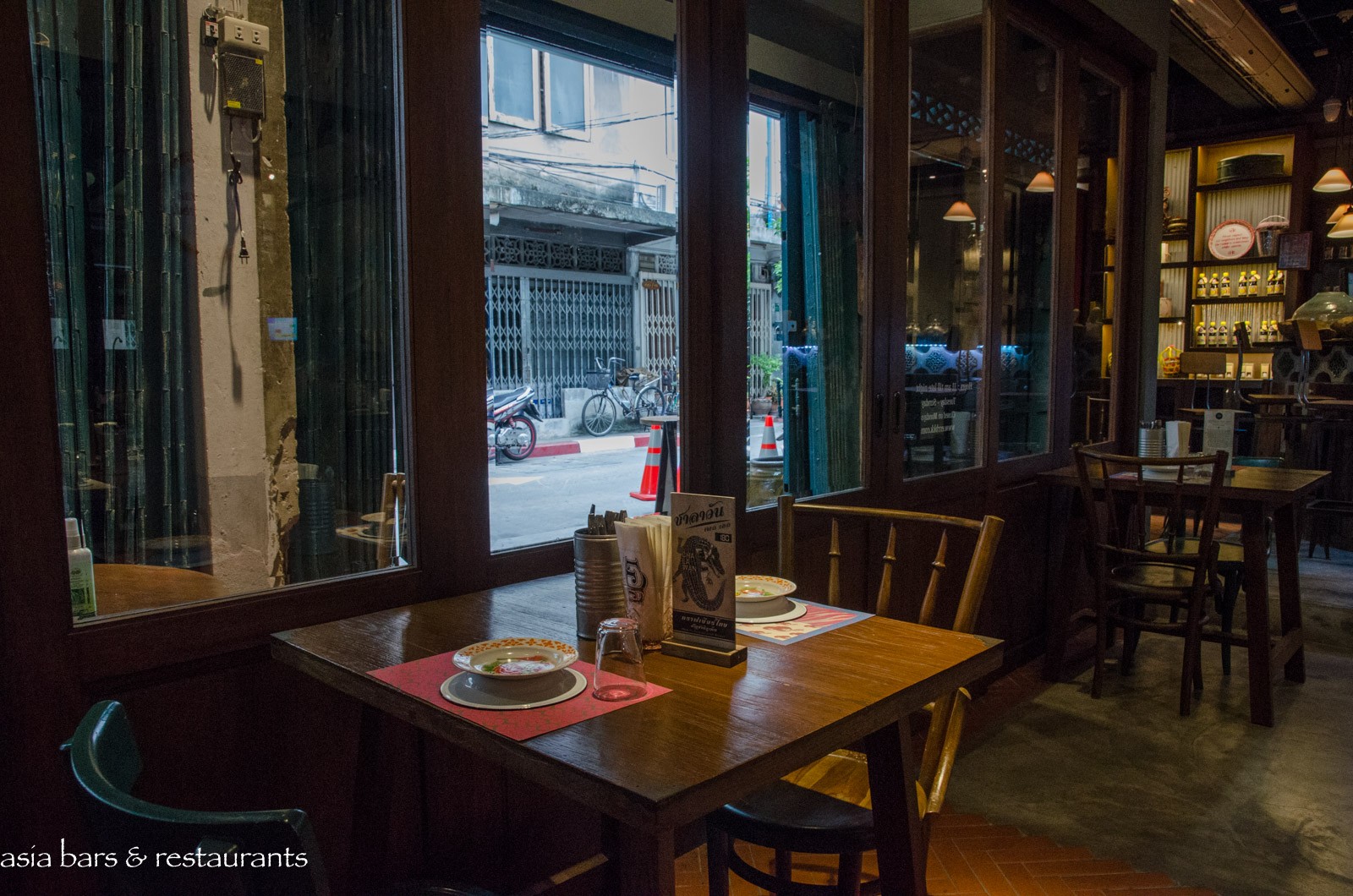 Design Original sliding metal grilles fold back to reveal the timber façade, while inside the front dining and bar spaces adjoin a partially open kitchen at the rear. The rustic-chic décor comprises concrete and tiled flooring, exposed red brick walls with peeled-back plaster, and simple dining timber tables and chairs. Retro-Thai touches include a colorful mural, plus an eclectic assemblage of vintage Thai accoutrements. An upper-level section includes additional table settings as well as old-style floor cushion seating.