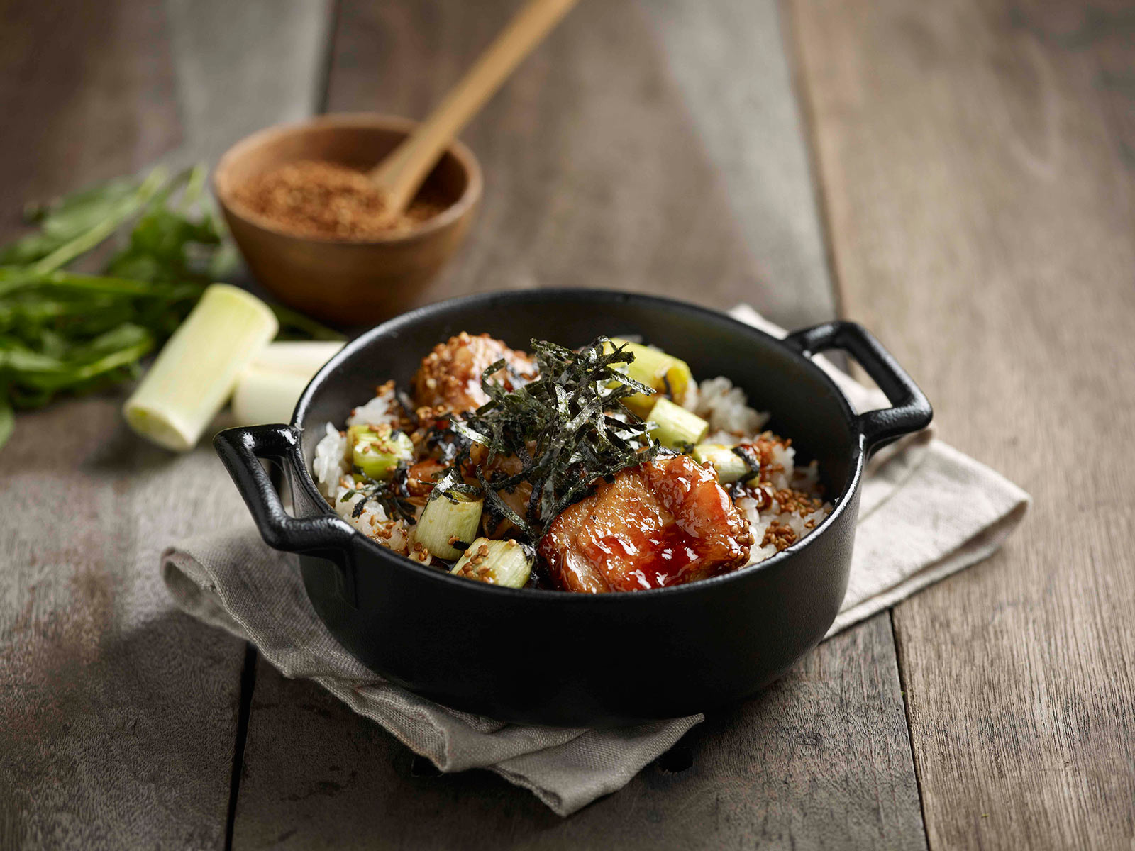• Chicken YAKI - pan-seared chicken thigh, Nippon sauce glaze, grilled leek & bacon