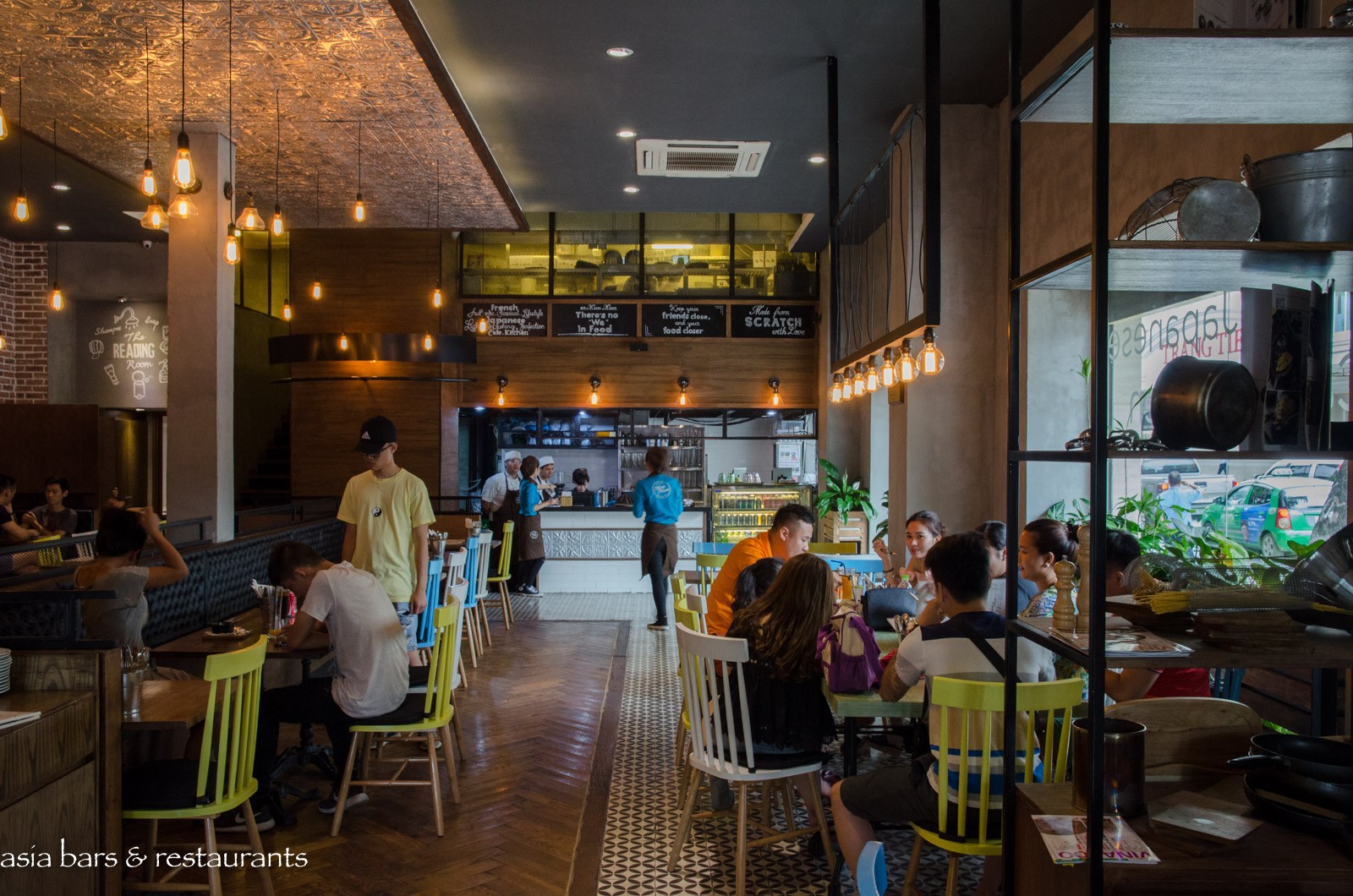 Design   Occupying a high-ceilinged street level space, Miam Miam exudes a welcoming warmth with its rustic-chic decor and comfortable seating arrangements. Traditional French cafe decor is referenced with both the parquet and patterned tile flooring, black leather banquettes, and pressed metal ceiling panels. Brightly coloured metal and wooden chairs add a casual, laid-back vibe conducive to all-day dining.