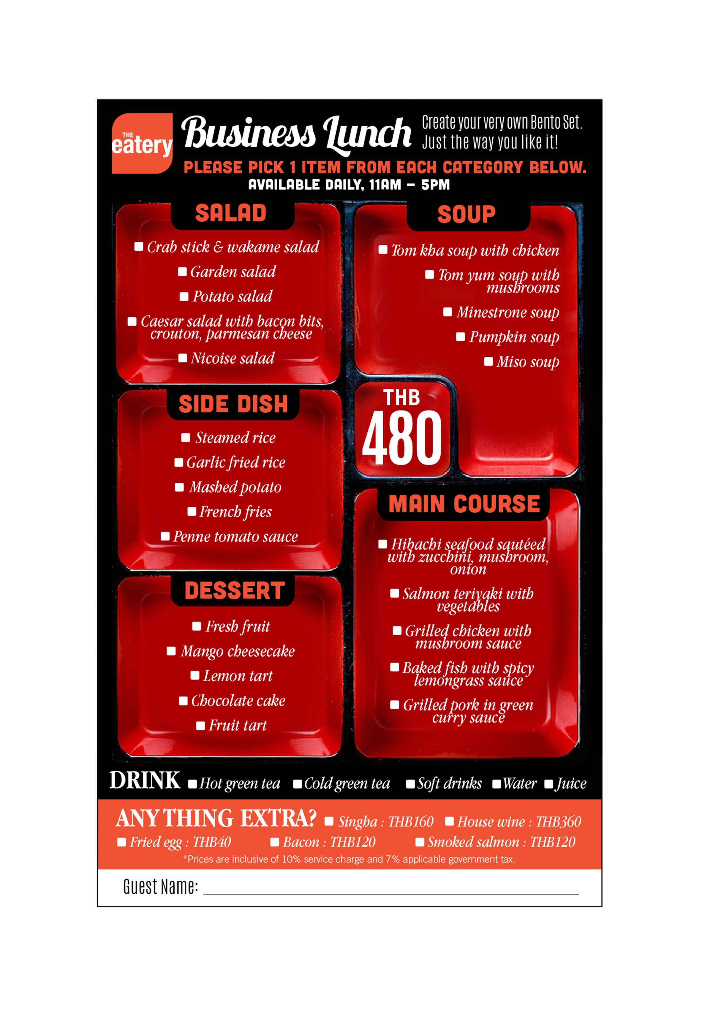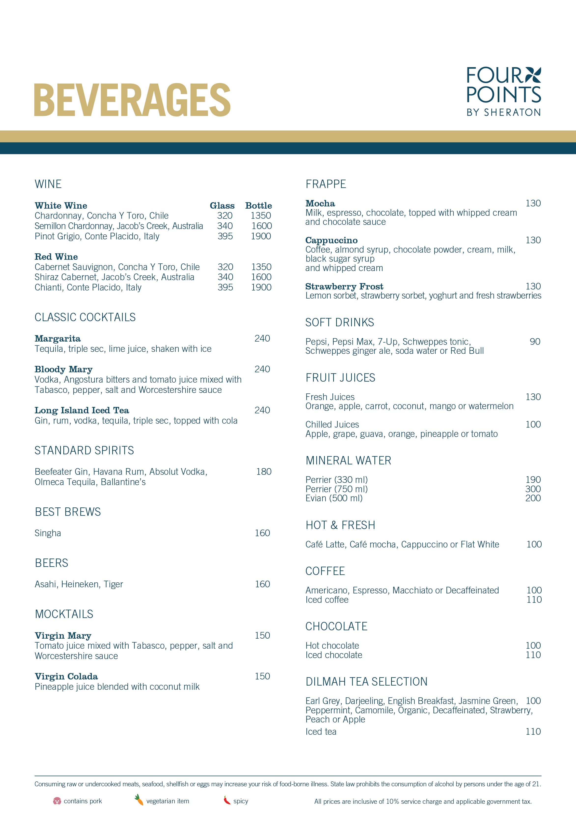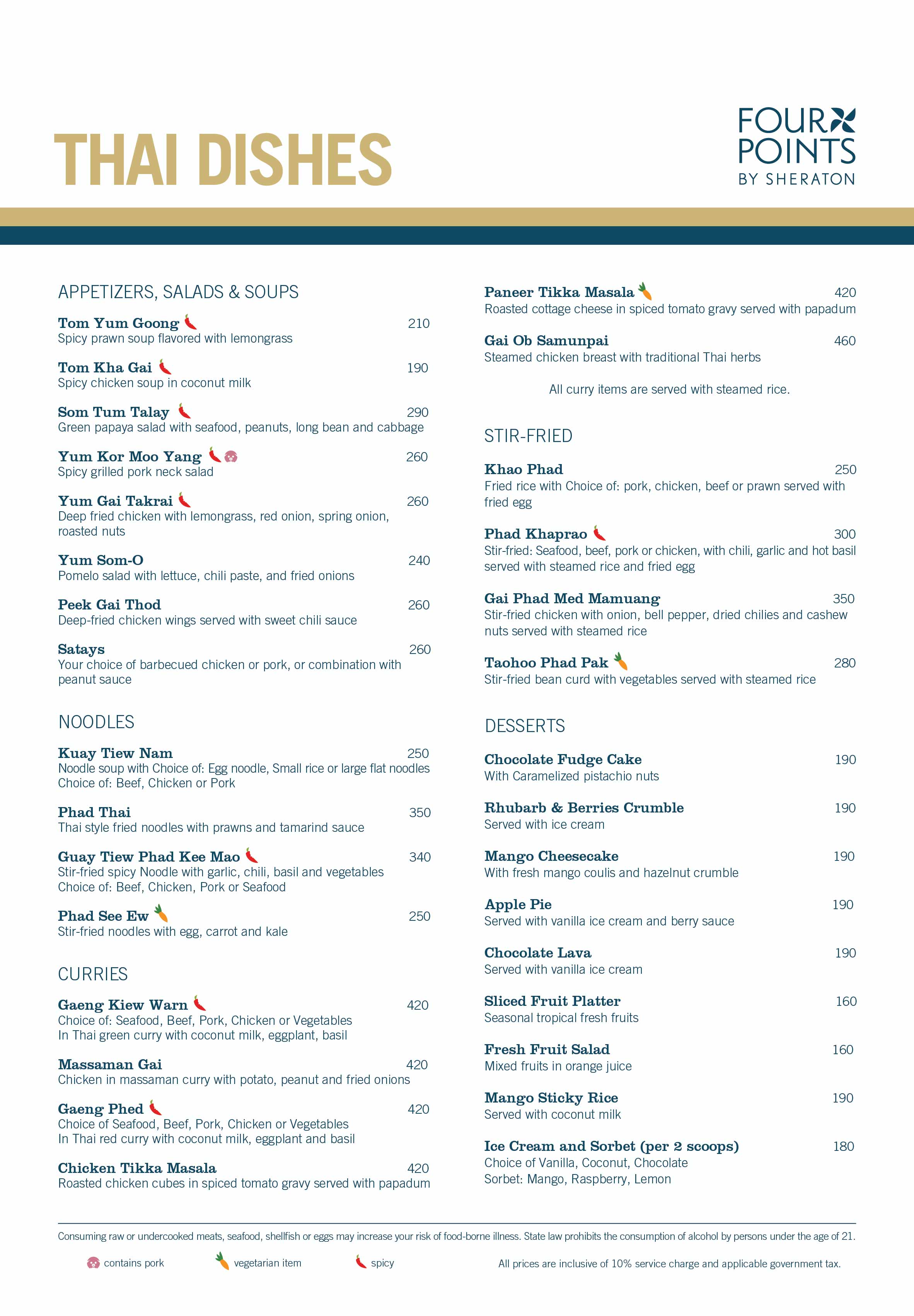 Menus All-day dining commences with a sumptuous breakfast buffet offering in addition to popular breakfast staples, the Four Points signature breakfast items such as apple brioche loaf, chiffon cake, egg noodle tarts and a grilled panini station. The all-day a la carte menu of Thai and International dishes is supplemented with lunch and dinner promotion sets. Served between 11am and 5pm, the 6-course Bento Box Business Lunch (THB480) entices with its variety of Asian and international cuisine options; while in the evenings the 4 Nations Dinner set(THB399) features selections from Thai, Mexican, Lebanese and Japanese cuisines. Diners can order refreshments from a concise beverage list that includes wines and beers, classic cocktails, frappes and fresh juices, plus coffee and teas.