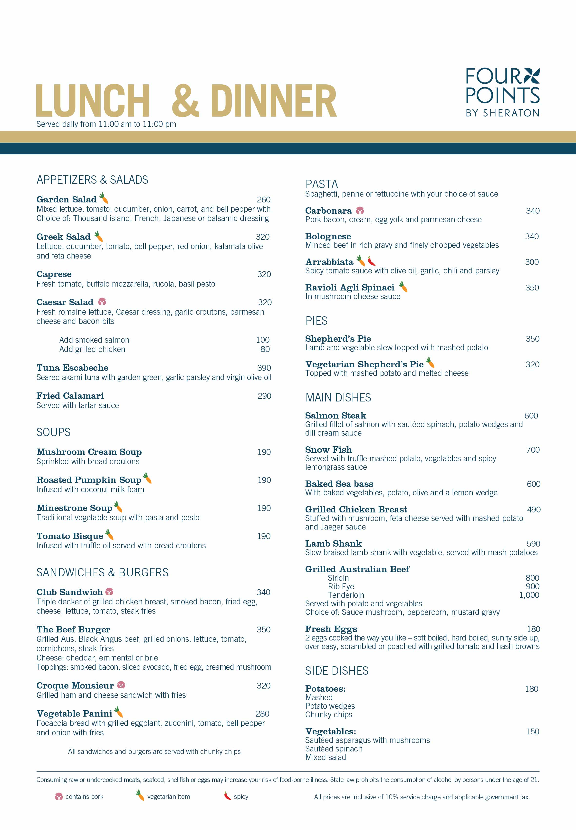 Open daily from 6:30am, The Eatery serves breakfast, lunch, and dinner. Check the FourPoints by Sheraton Facebook Page for updated information on menu promotions.