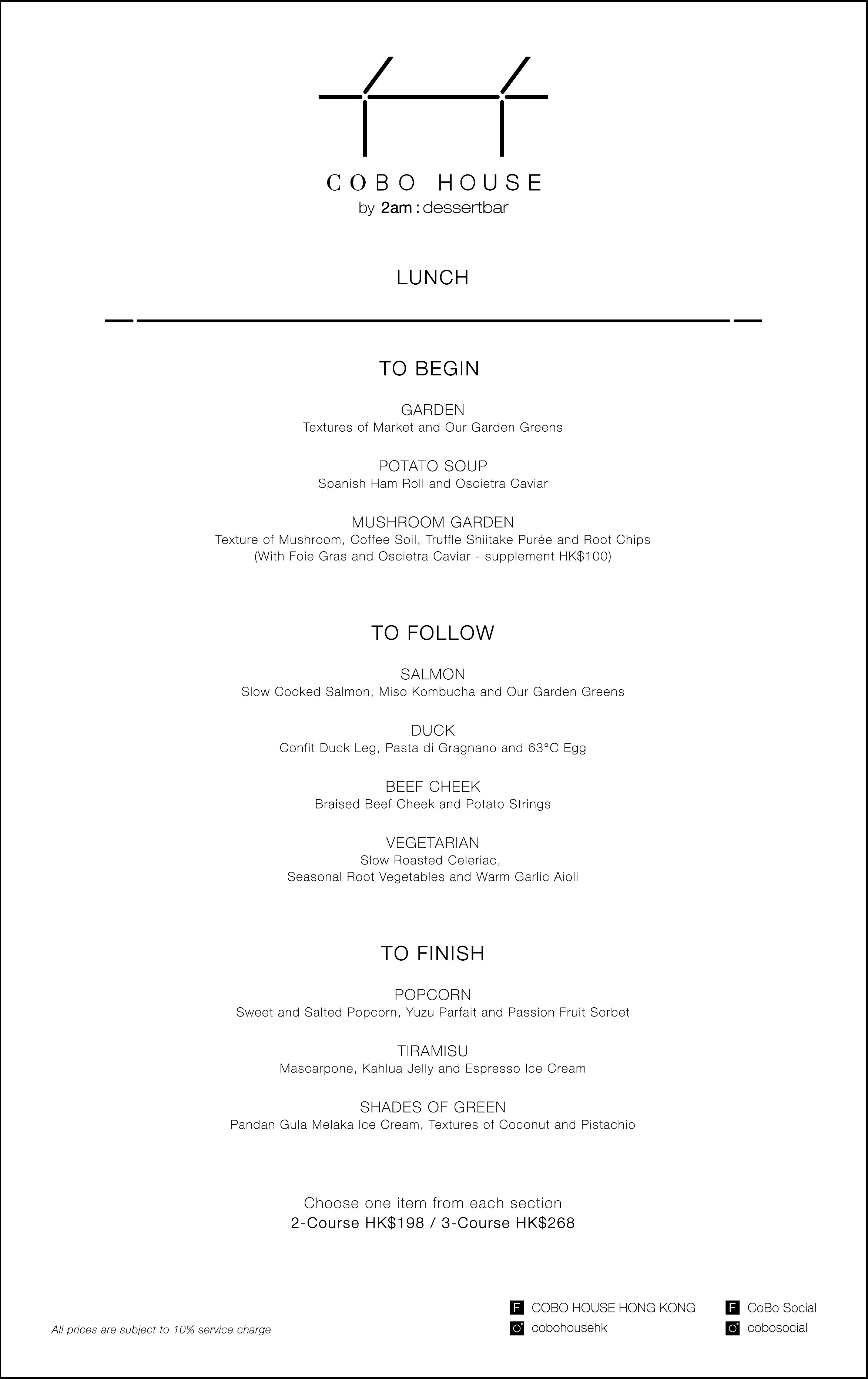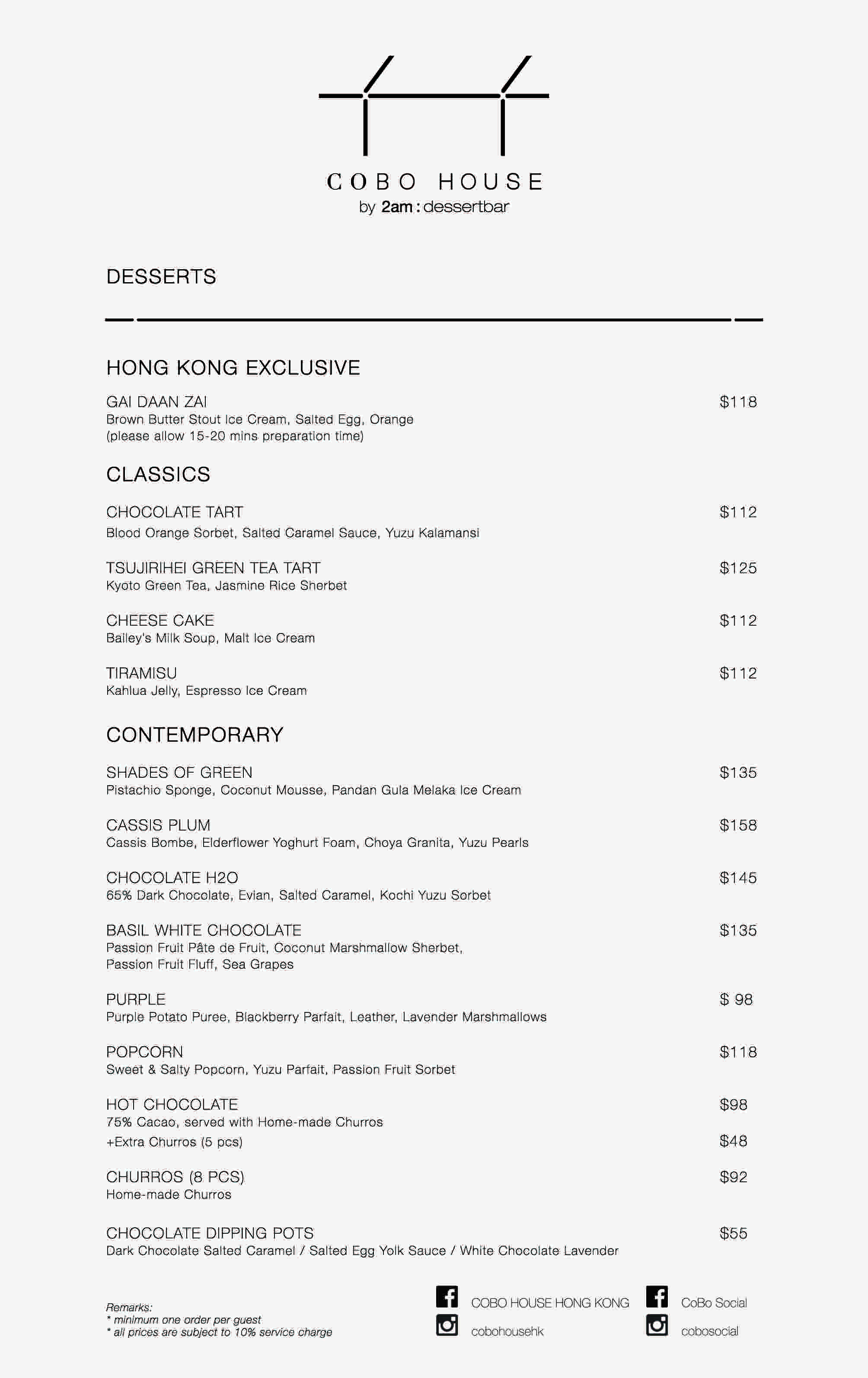 Recently opened in the Shek Tong Tsui enclave near Hong Kong University, COBO HOUSE by 2am:dessertbar has been designed as a chic destination where art intersects with progressive cuisine. COBO HOUSE occupies a contemporary 2-level space that accommodates a street level restaurant and dessert bar, plus an upstairs space comprising an art exhibition room and separate private dining room. In a collaboration with celebrated Singaporean pastry chef Janice Wong, COBO HOUSE hosts an offshoot of her acclaimed Singapore restaurant 2am:dessertbar, while a newly created menu of savoury dishes adds a new dimension to her culinary talents. Twice recognised as Asia’s Best Pastry Chef (2013 & 2014), Janice Wong has become internationally renowned for her progressive fusion of art and culinary with edible art installations, and creative pairings of desserts and cocktails. At COBO HOUSE guests can select from a series of lunch, dinner and a la carte menus, or take a seat at the signature dessert bar and observe the culinary team as they prepare the imaginative desserts.