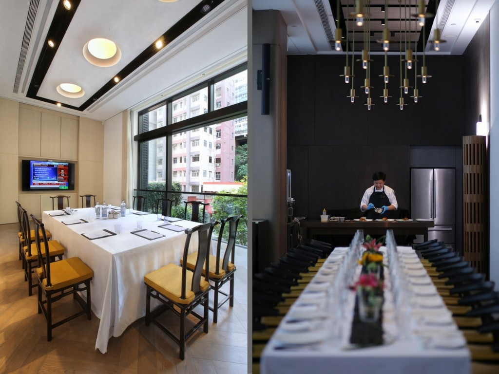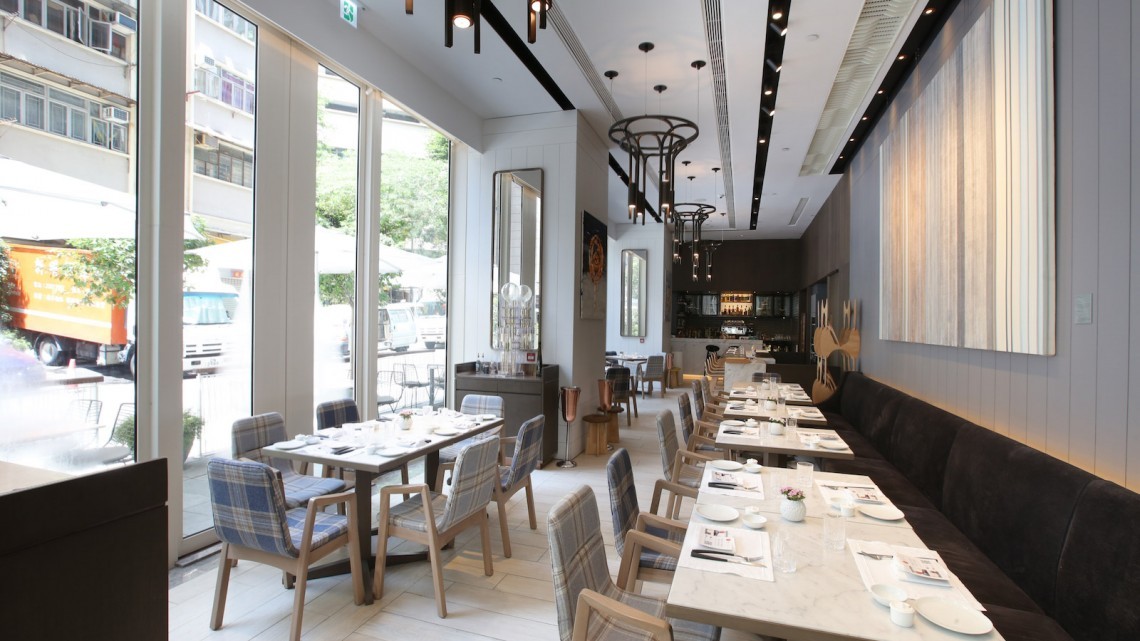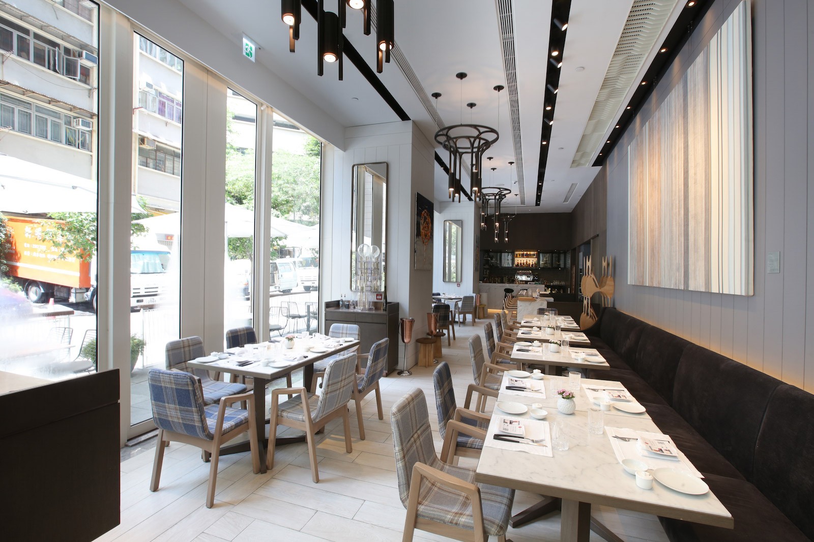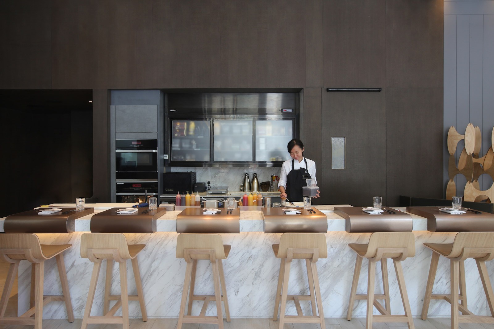Design Overlooking a street level courtyard and outdoor terrace through the full-height glass facade, the main dining room is bright and airy with the high ceiling eliciting additional spaciousness. A contemporary, minimalist decor and restrained palette provide the backdrop for various art installations and the centrepiece white marble and bronze surfaced dessert bar. At the upper level, the flexible spaces are designed to facilitate exhibitions, private dinners and events.