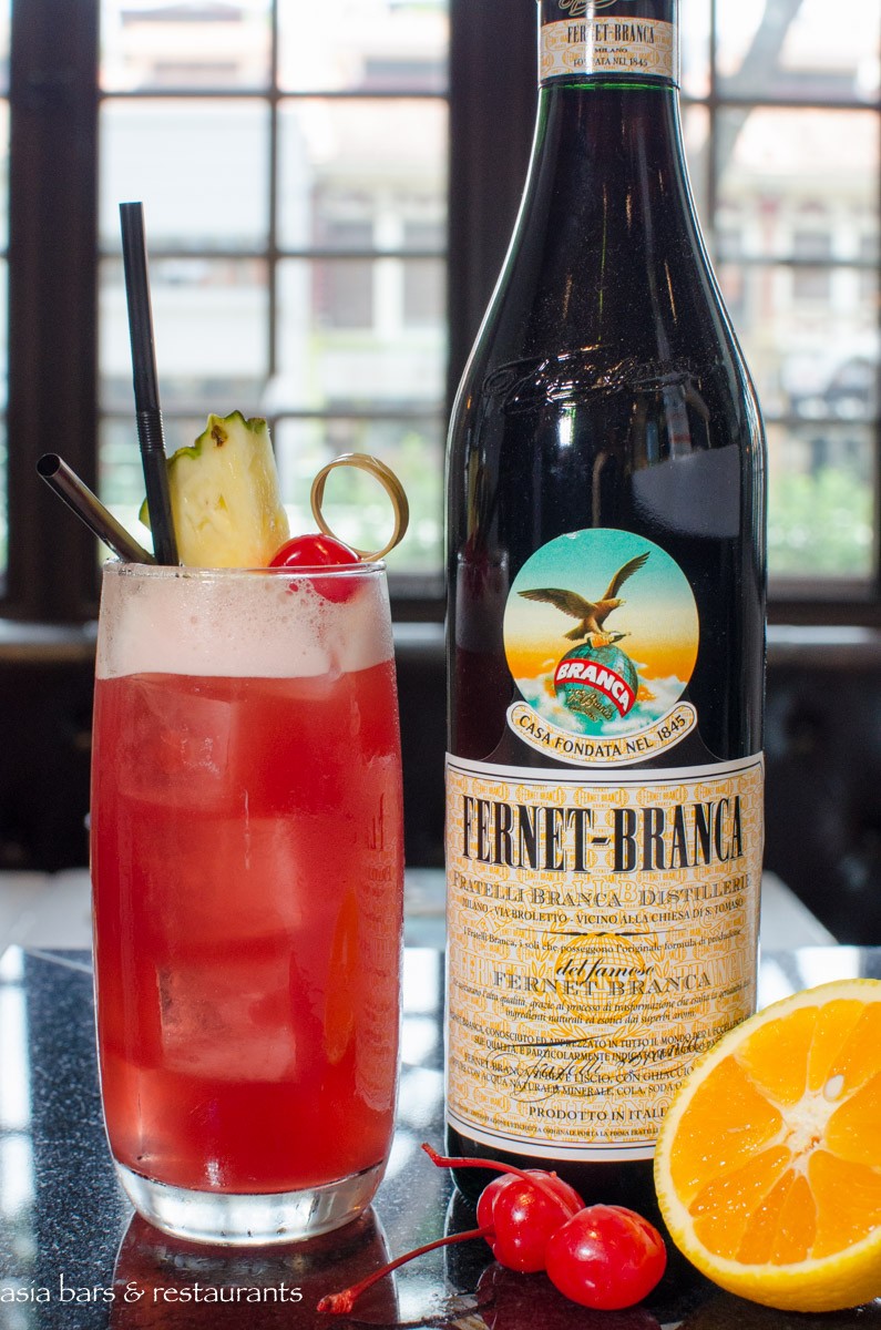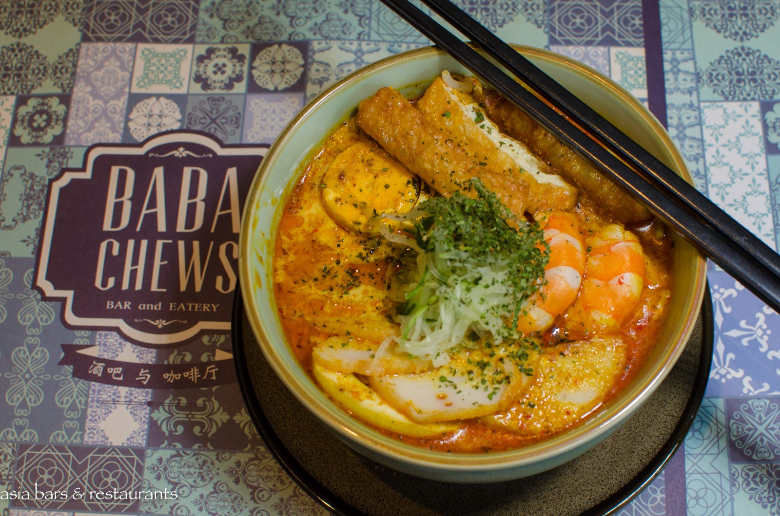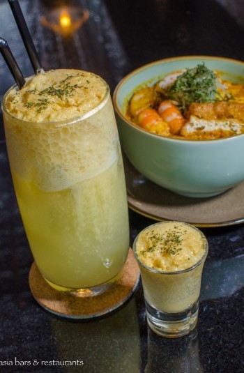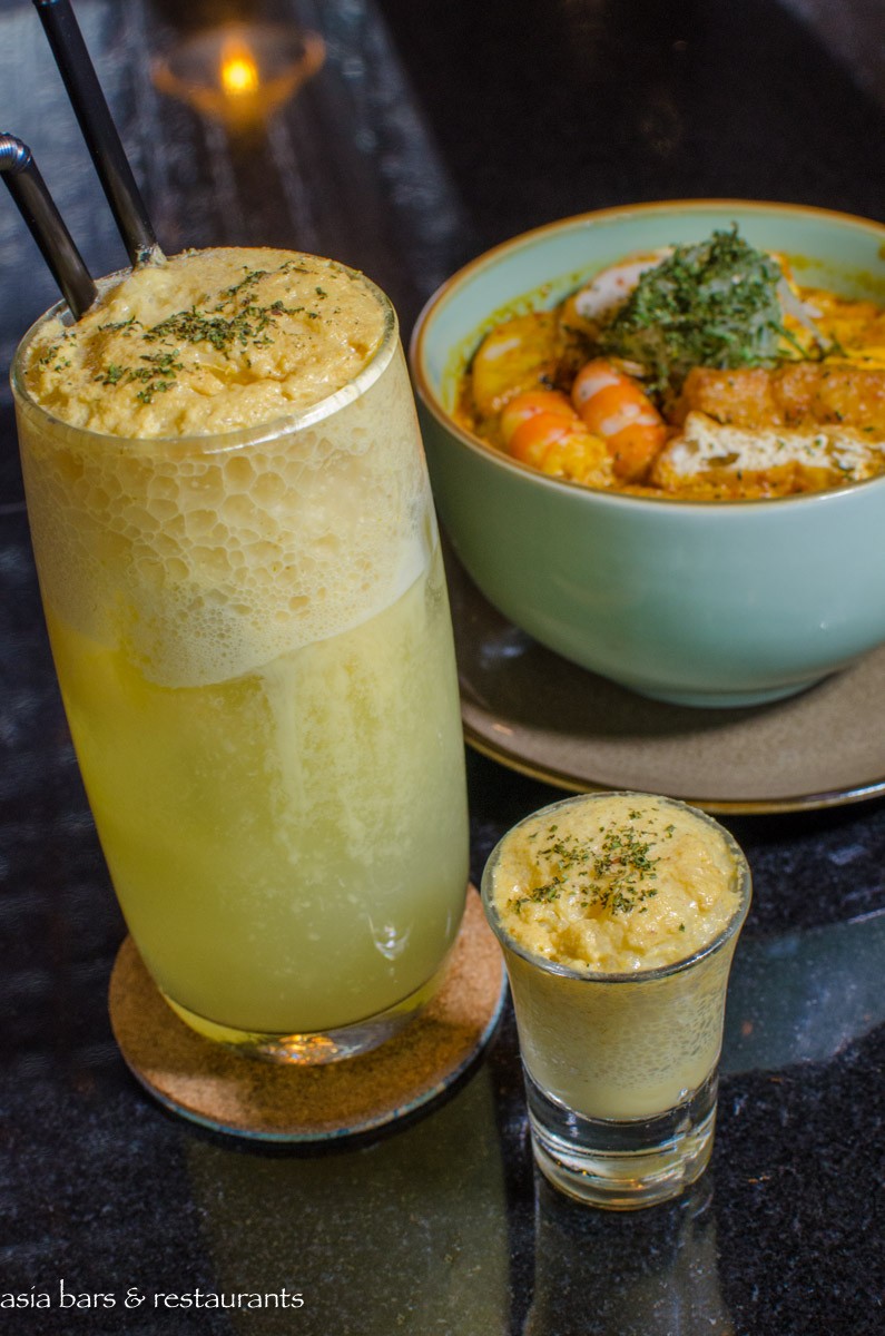 Beverages Highlighting the bar service, signature cocktails take inspiration from Peranakan culinary flavours with some intriguing combinations – typified by the Chews Laksa which reconstructs the essence of the spicy dish in a well-balanced combination that includes white rum, laksa-infused foam, pineapple juice and coconut cream. Also notable are Katong Sling – a tweaked derivative of the iconic Singapore cocktail – made from Courvoisier VSOP, apple juice, lemon juice, apple honey syrup, with Fernet added for a spicy accent.