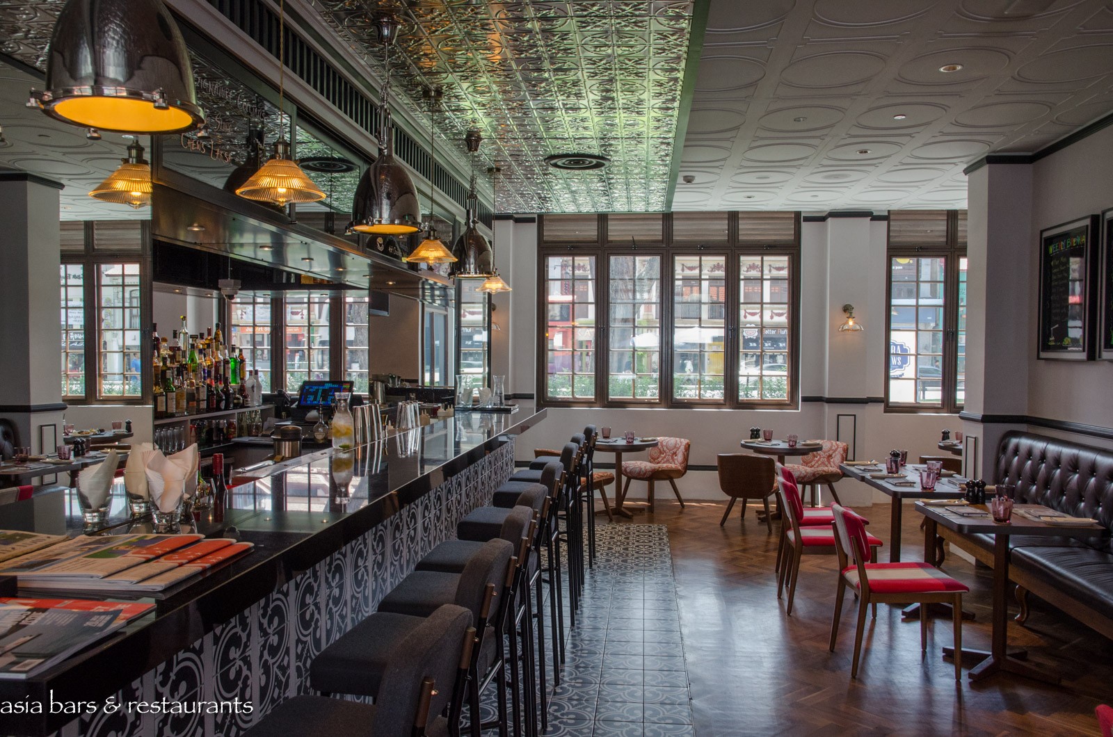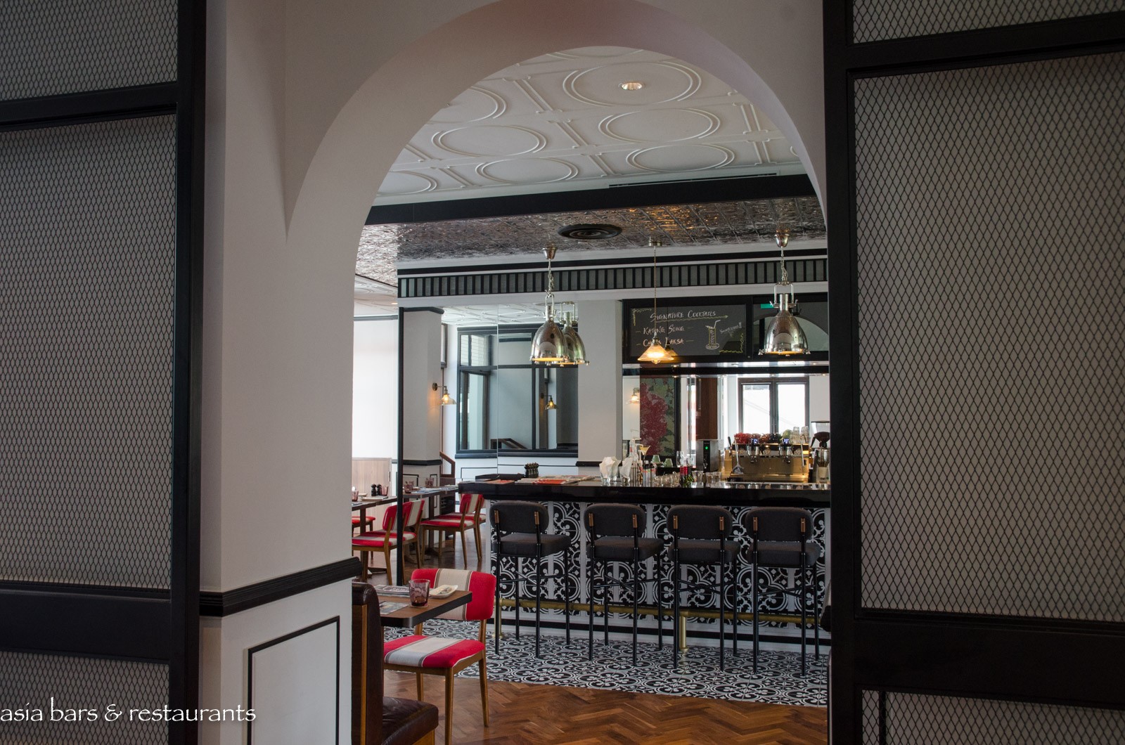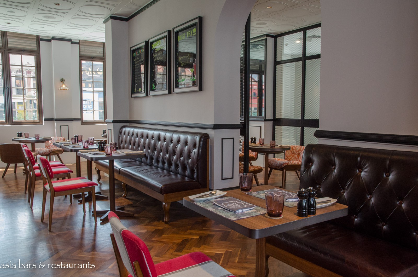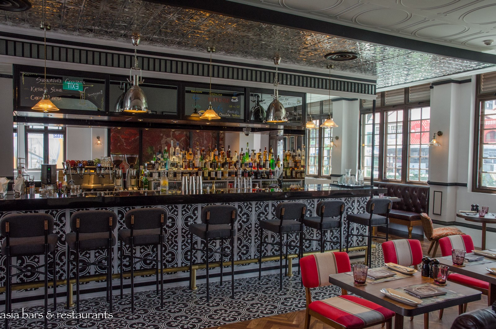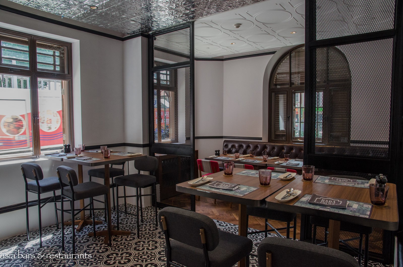 Design The spacious Baba Chews interior comprises a series of interconnected dining spaces opened up from the original floor plan. At the centre, seats at the large rectangular bar counter offer a casual option, while an adjacent compact outdoor terrace is another option in the evenings. The retro-chic aesthetic is enhanced by heritage elements such as the pressed metal ceilings, patterned tiled flooring, dark brown leather banquettes and colourful soft furnishings.