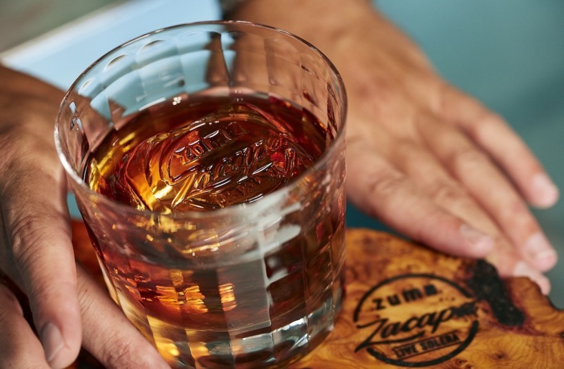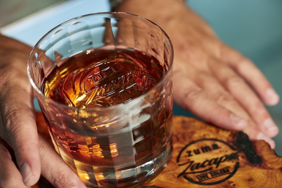 After the Zacapa rum as passed through the Solera system, the finished cocktail is served in a chilled glass with hand-cut ice engraved with a bespoke ice stamper.