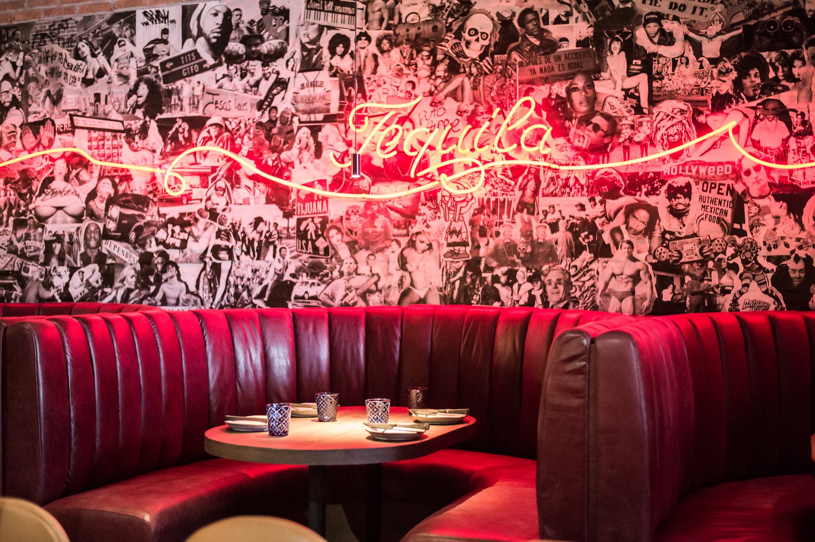 Design Touche Hombre successfully melds a contemporary chic decor with artful touches that celebrate the vibrancy of Latino-inspired street art. Murals created by noted Austrian urban art and graffiti illustrator Nychos are splashed across the walls of both levels, while neon installations add a retro 80’s element. The main level encompasses the bar, indoor dining at red leather booths, and open-air settings on the expansive outdoor terrace area, while the cozy mezzanine level offers a cool, laid-back dining setting.