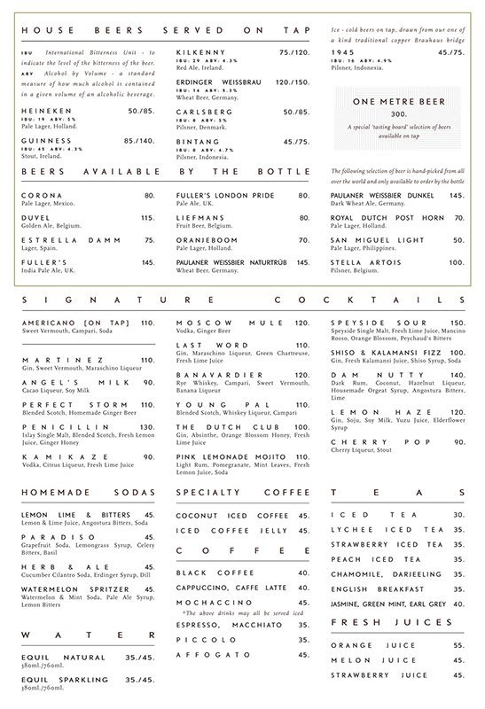 Food & Drinks Head Chef Chris Moes has created a menu with a strong representation of charcuterie – with gourmet homemade sausages and cured meats a highlight. Among dishes that exemplify the modern European pub fare, standouts include the Braised Lamb in Puff Pastry – a refined version of the British meat pie;and the Erwten Soup – a traditional Dutch pea soup served with handcrafted sausages, house-baked pretzel roll and smoked butter.