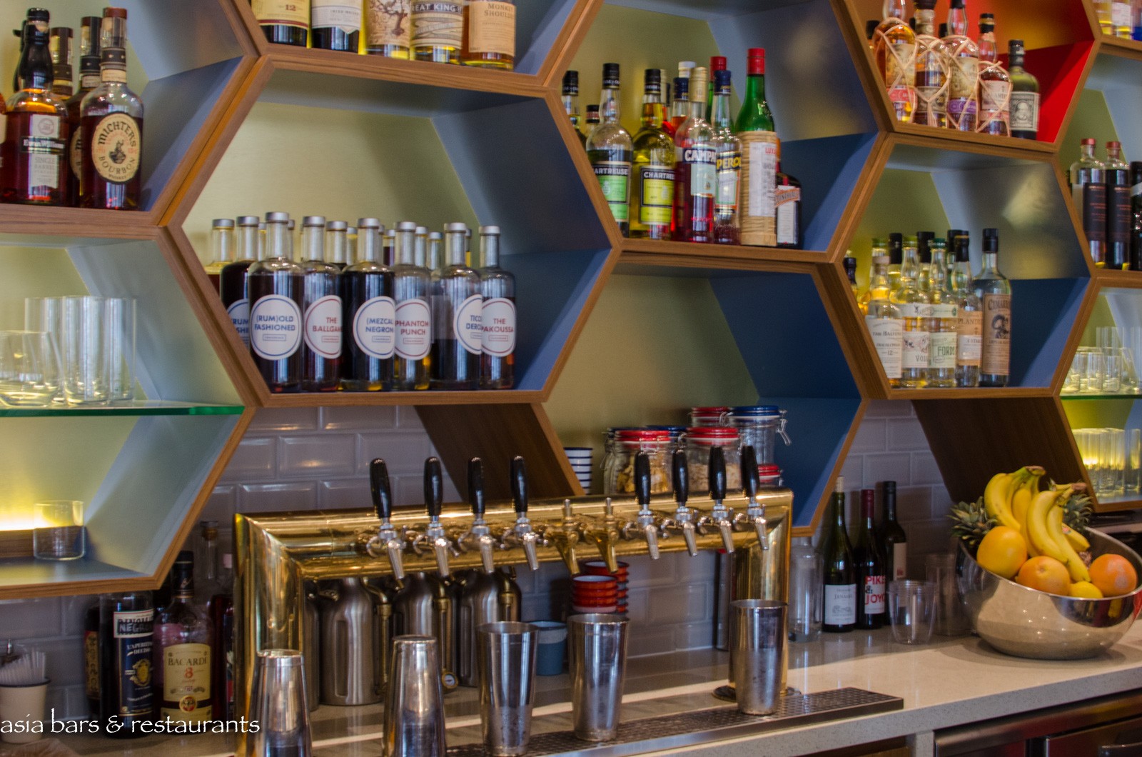 Design The simple decor of bench seating and communal teak tables was designed to evoke a playful classroom experience – good for both working and sociable gatherings. And open-floor layout has the coffee bar at the entrance, a full-length bar that spans the rear wall, with the open kitchen adjacent. Bold colourful artworks from a local artist add visual highlights to the pared-back palette, while a solid timber shuffleboard offers a playful distraction.